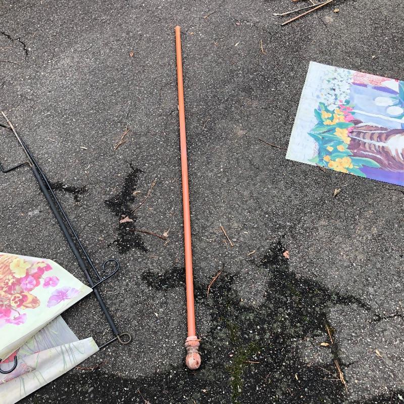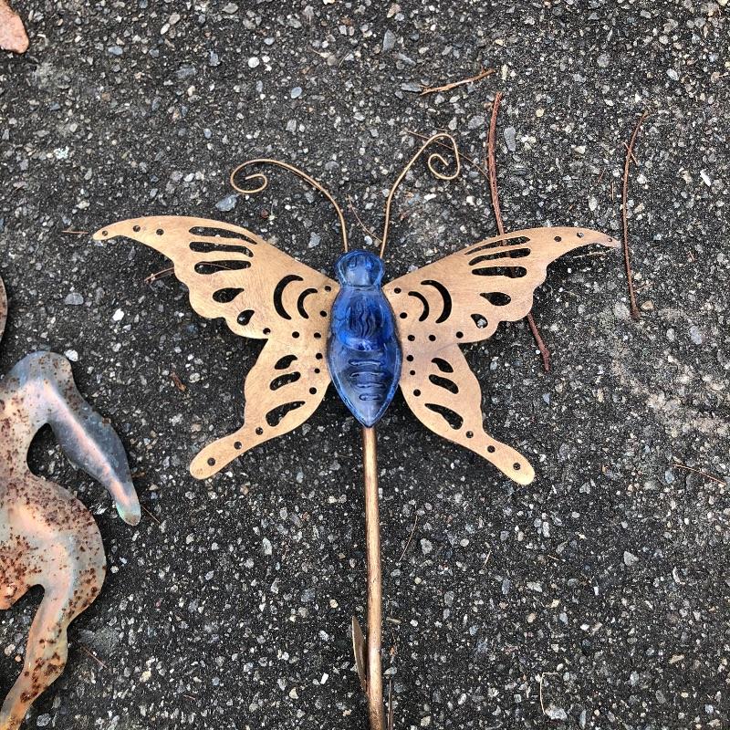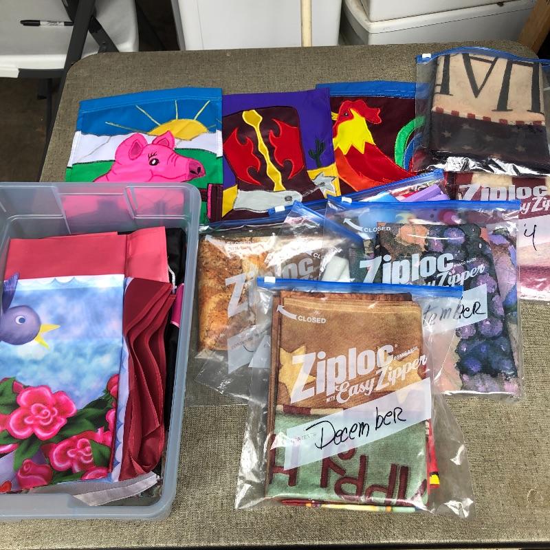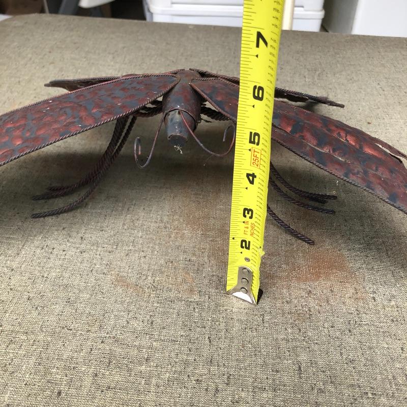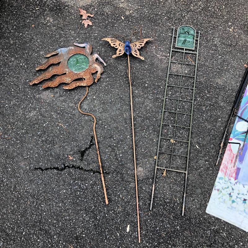 Cheer up yard with this great lot. There are a bunch of flags that include large and smaller flags and plenty of poles to hang them on that includes 2 long wood poles for the bigger flags and 2 metal poles for the smaller ones. Longer pole measures 51” long. Also included is a metal butterfly and 3 stakes; one has a sun, another a butterfly and the third a dragonfly.