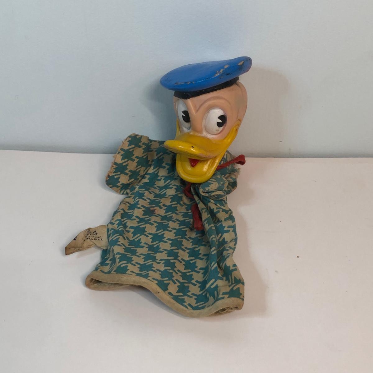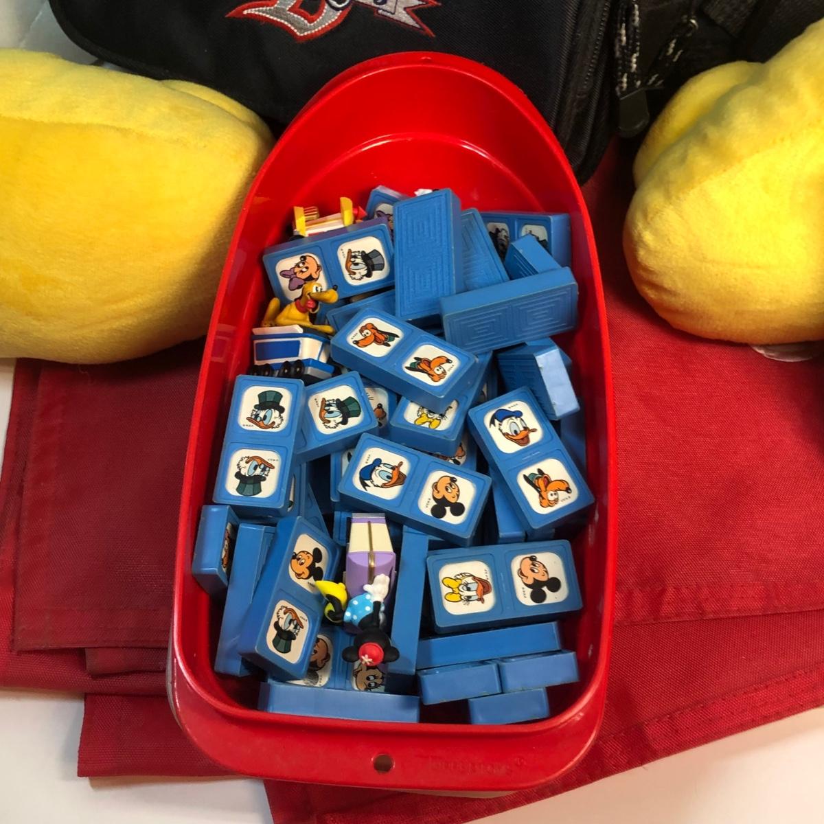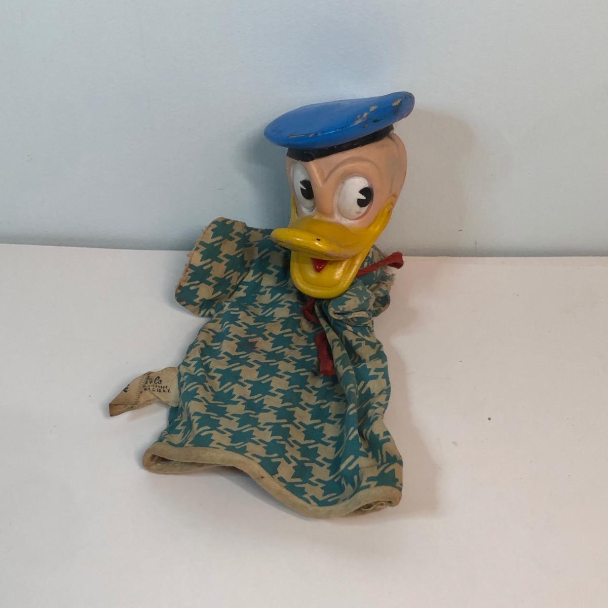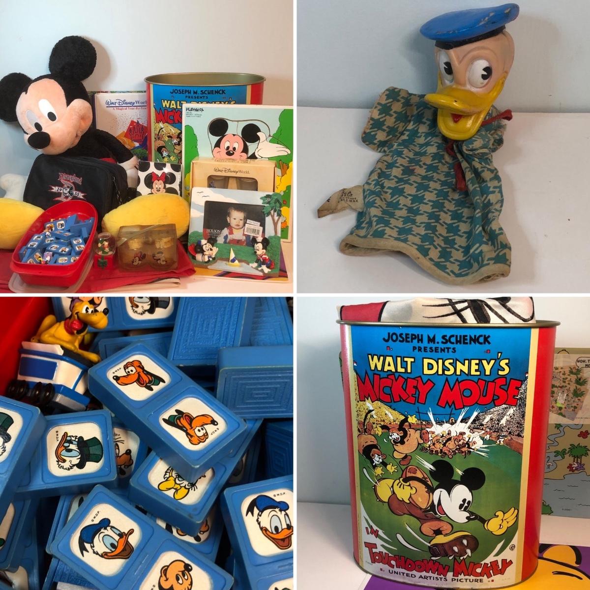 LOT 301M: Disney Collection - Vintage Donald Puppet, Wastebasket, Dominoes in Tuppertoy Container, Photo frame, Books & More