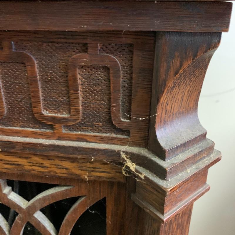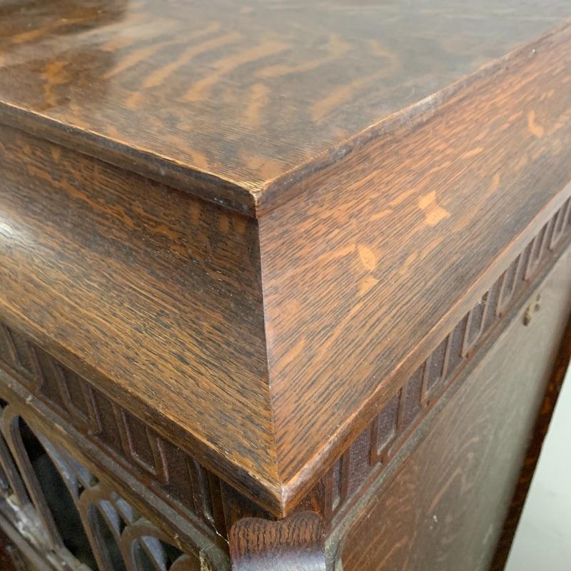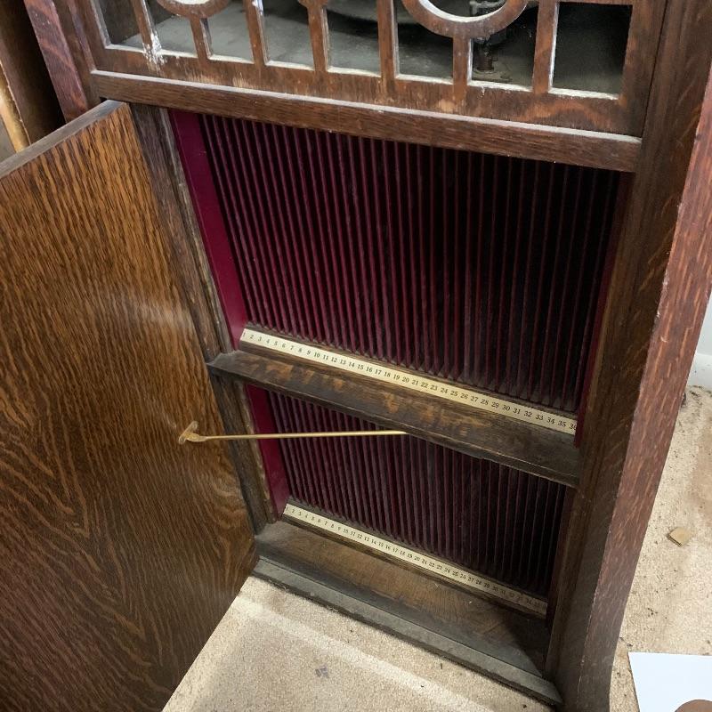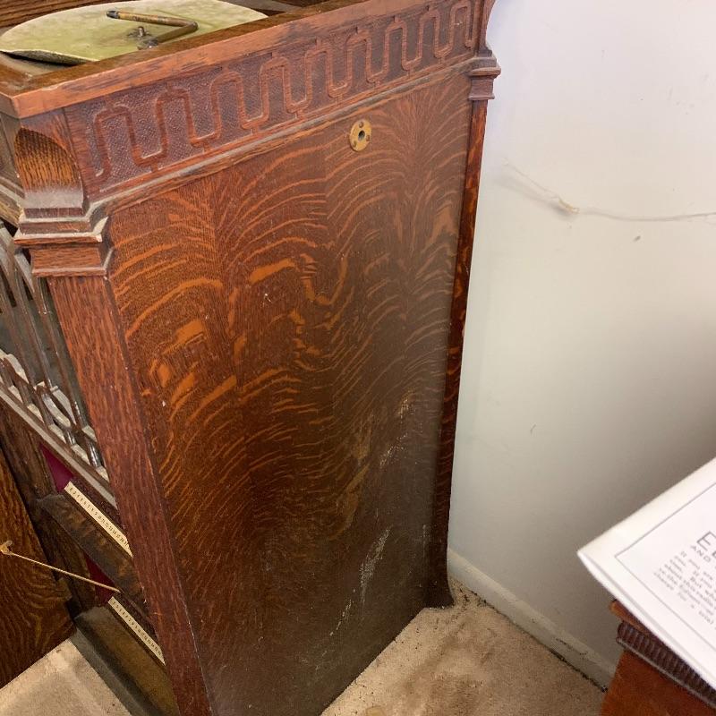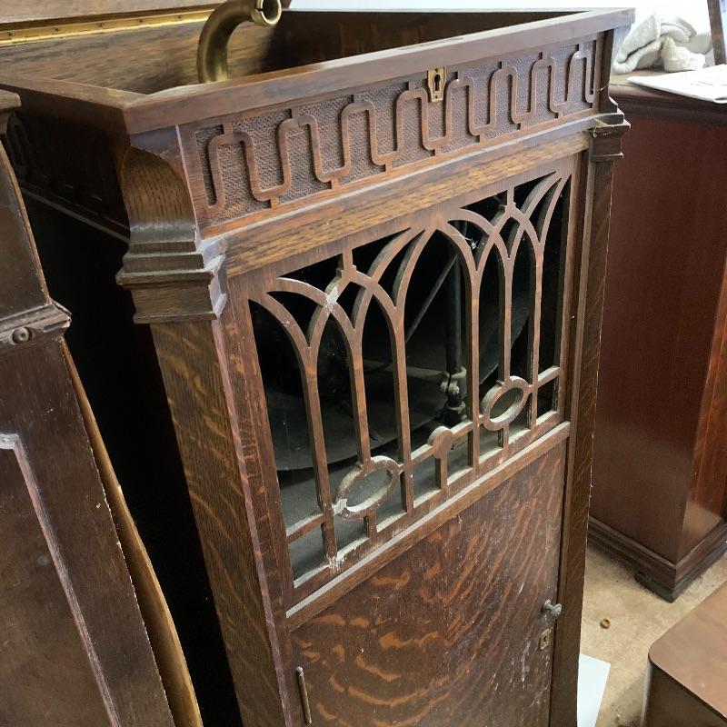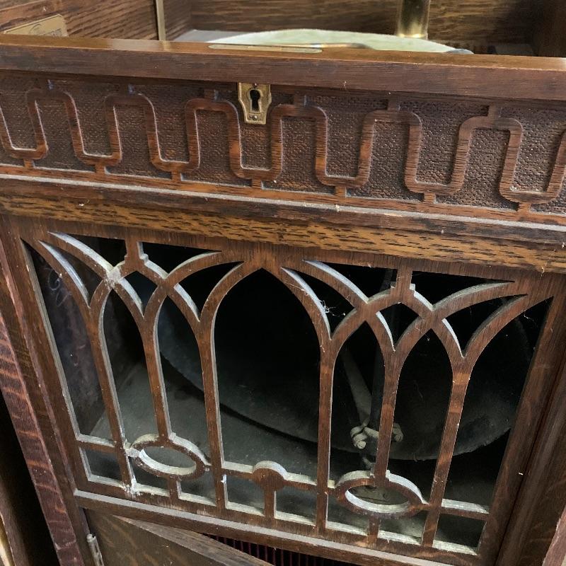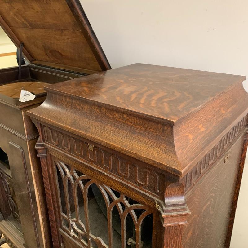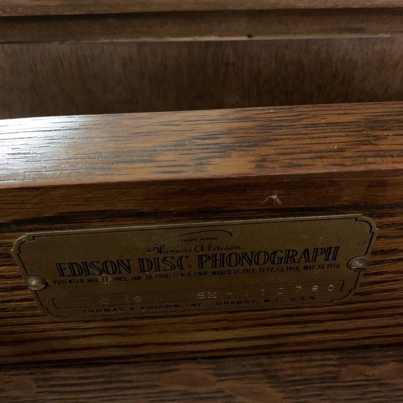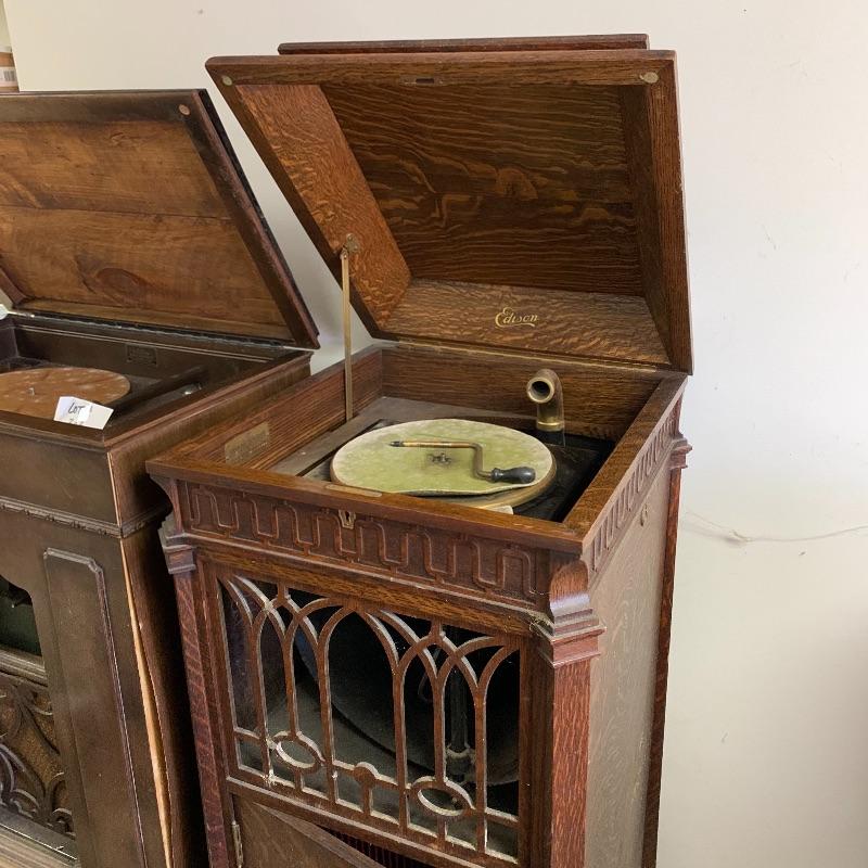 This lot is dedicated to this beautiful Edison disk phonograph. This unit is housed in a wooden cabinet cabinet that is in good condition. The turntable is untested. It measures 23”wide X 50” tall X 21” deep. Unit to the left of this is not included in this lot.