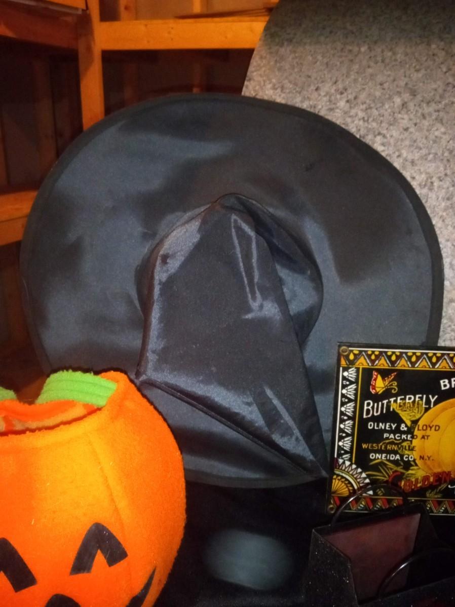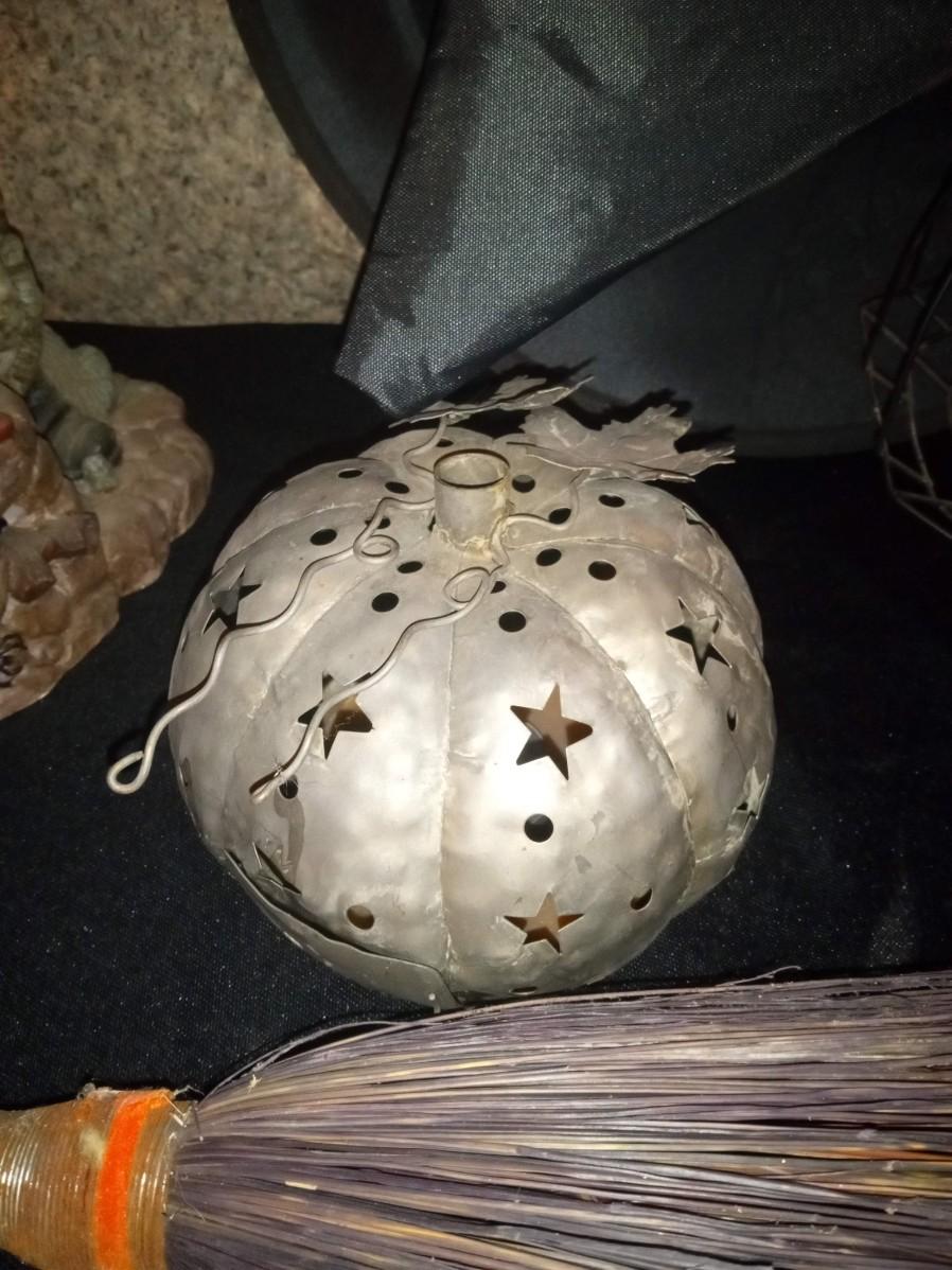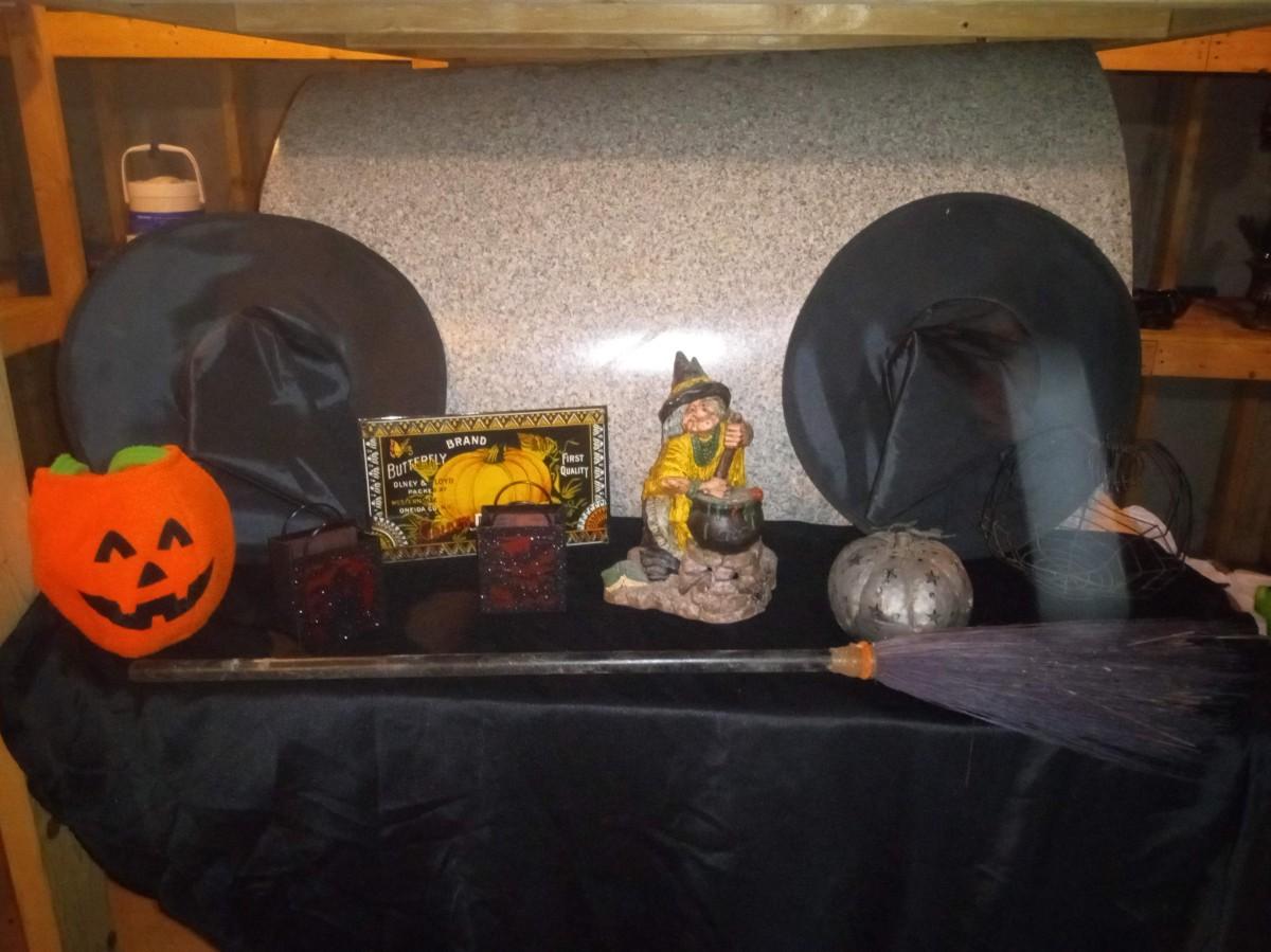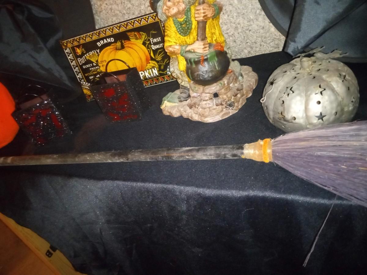 2 WITCHES HATS AND A BROOM, PLASTER WITCH, METAL AND CLOTH PUMPKINS, 2 CANDLE HOLDERS, A SPIDER WIRE BASKET AND A METAL SIGN
