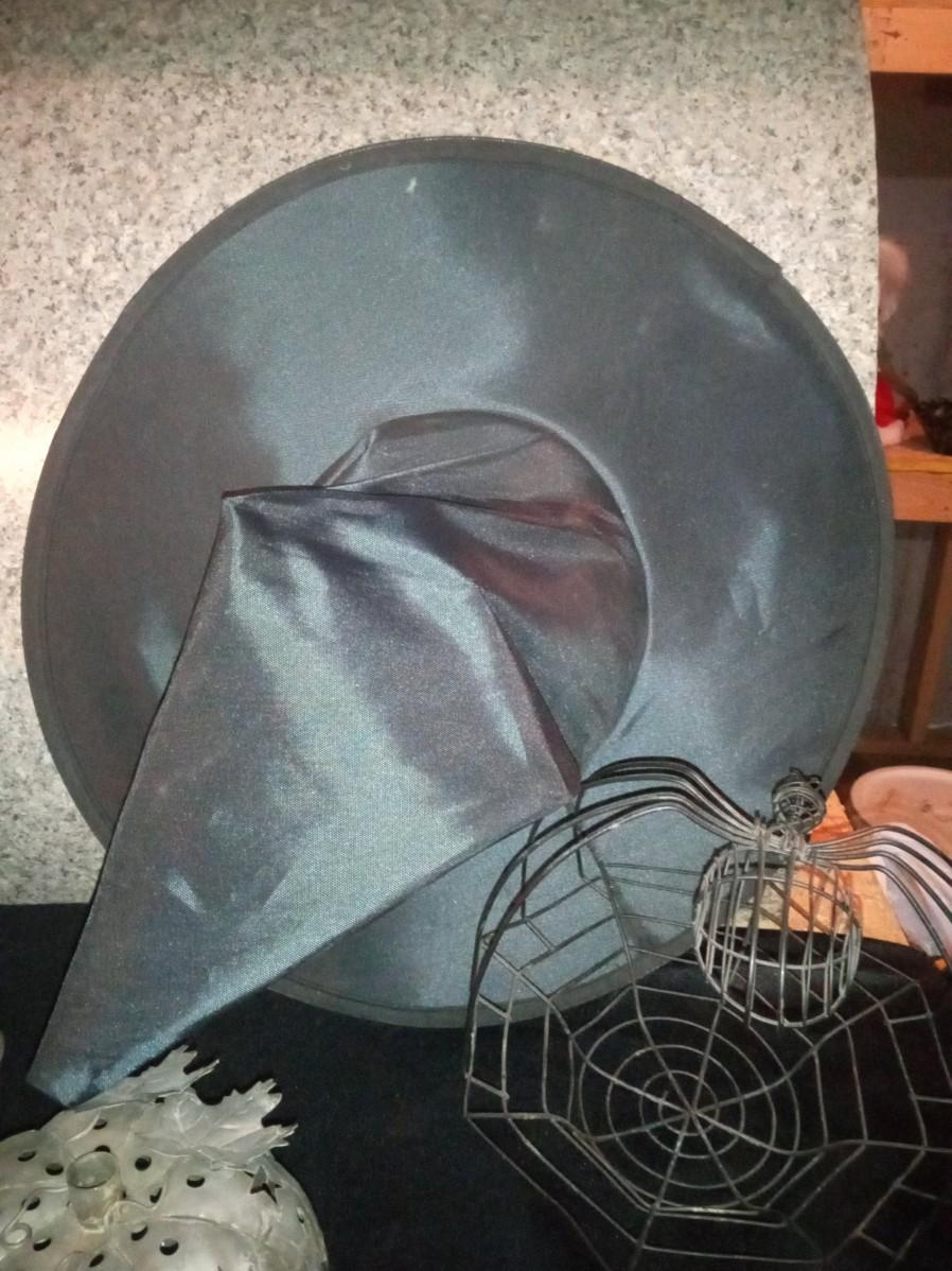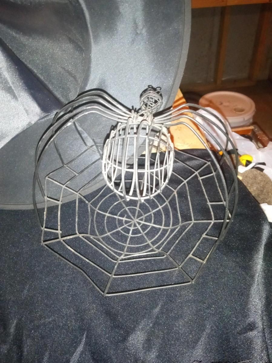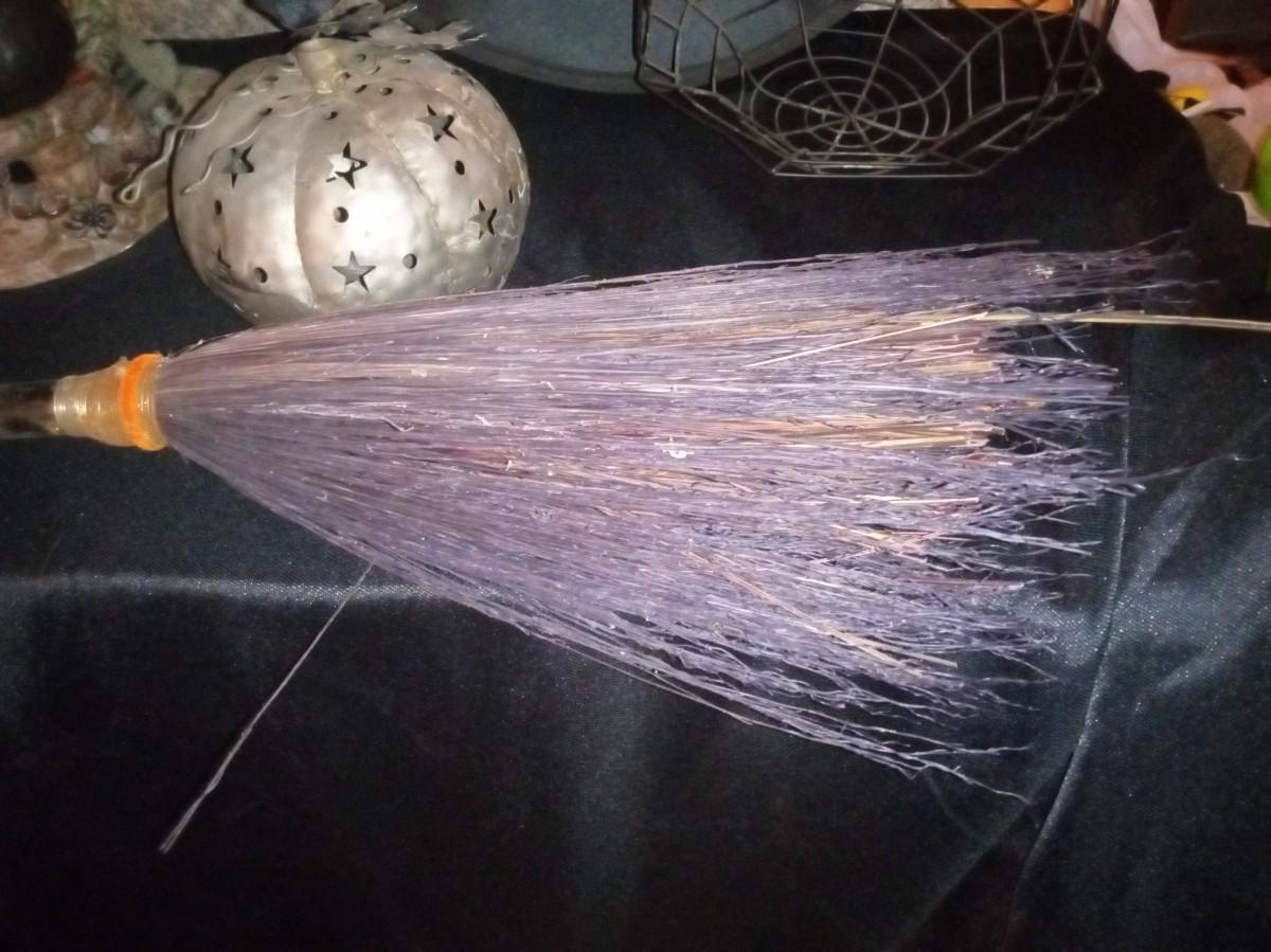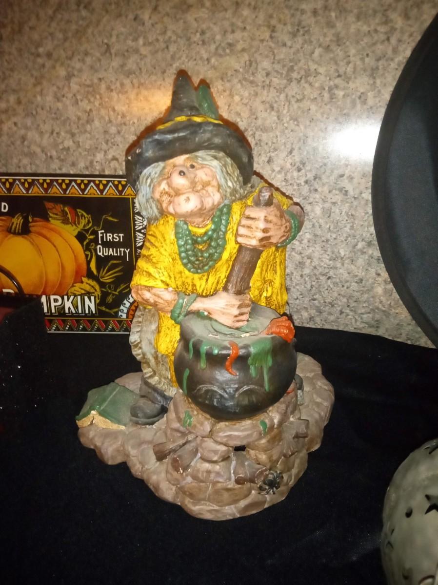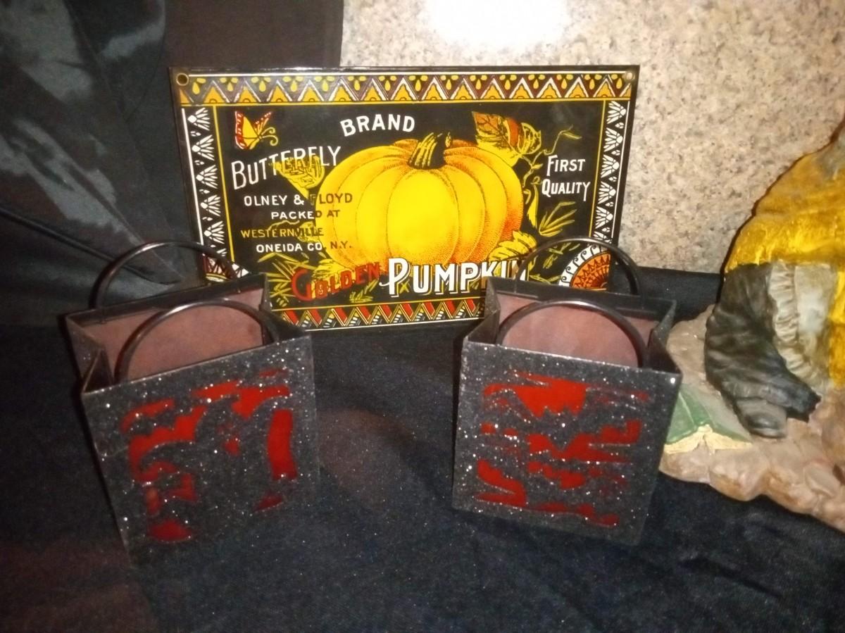 2 WITCHES HATS AND A BROOM, PLASTER WITCH, METAL AND CLOTH PUMPKINS, 2 CANDLE HOLDERS, A SPIDER WIRE BASKET AND A METAL SIGN
