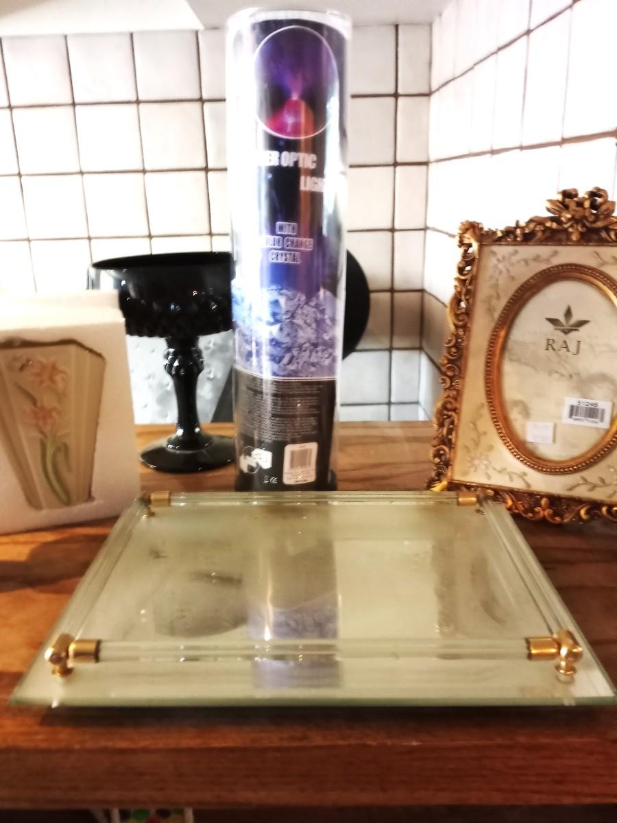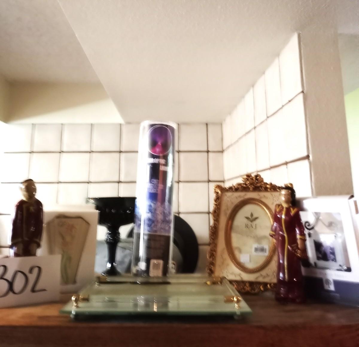 LOT 302  FIGURINES-TABLE MIRROR-PICTURE FRAMES-CANDY DISH-VASE-LIGHT