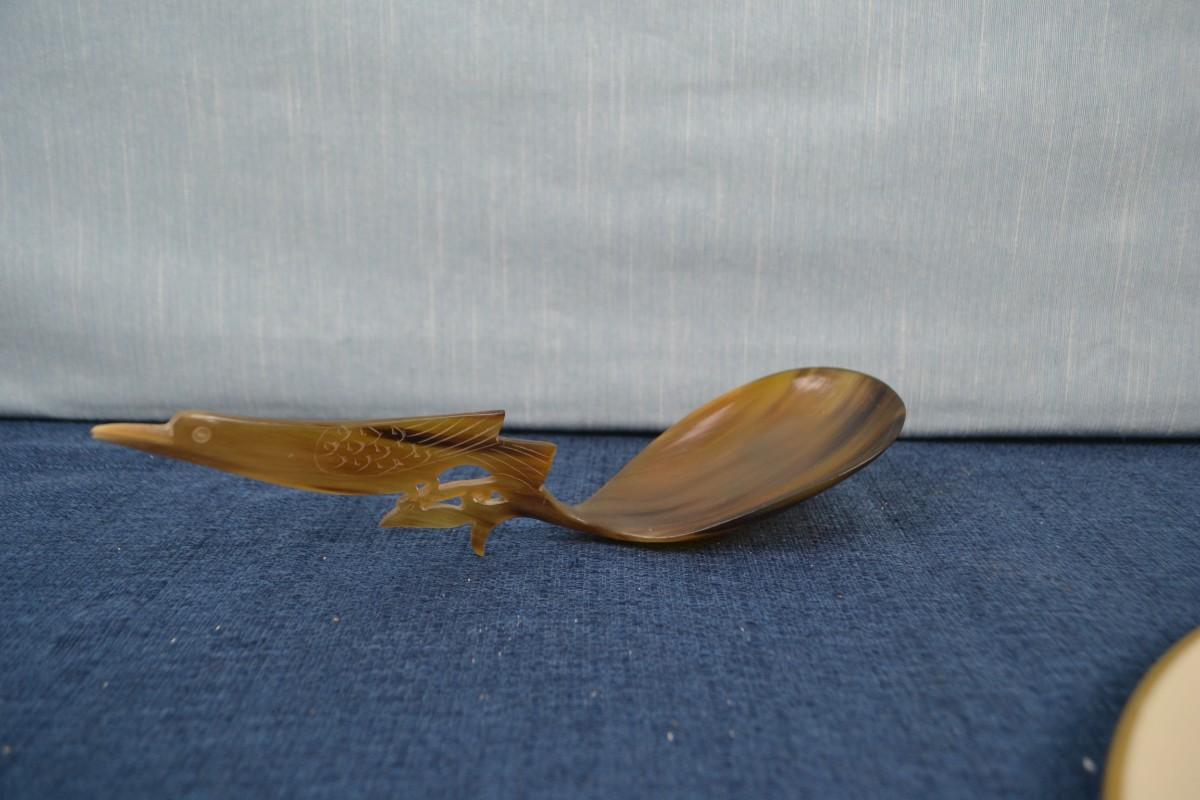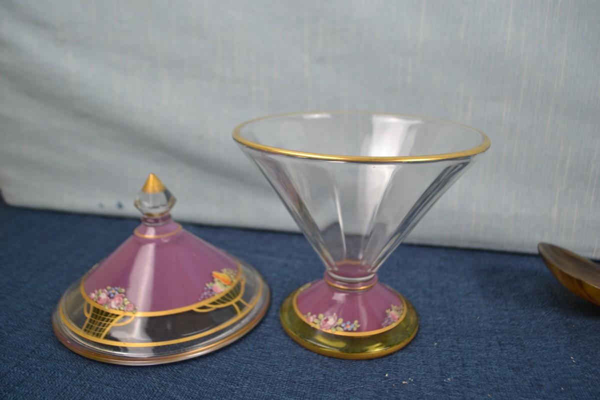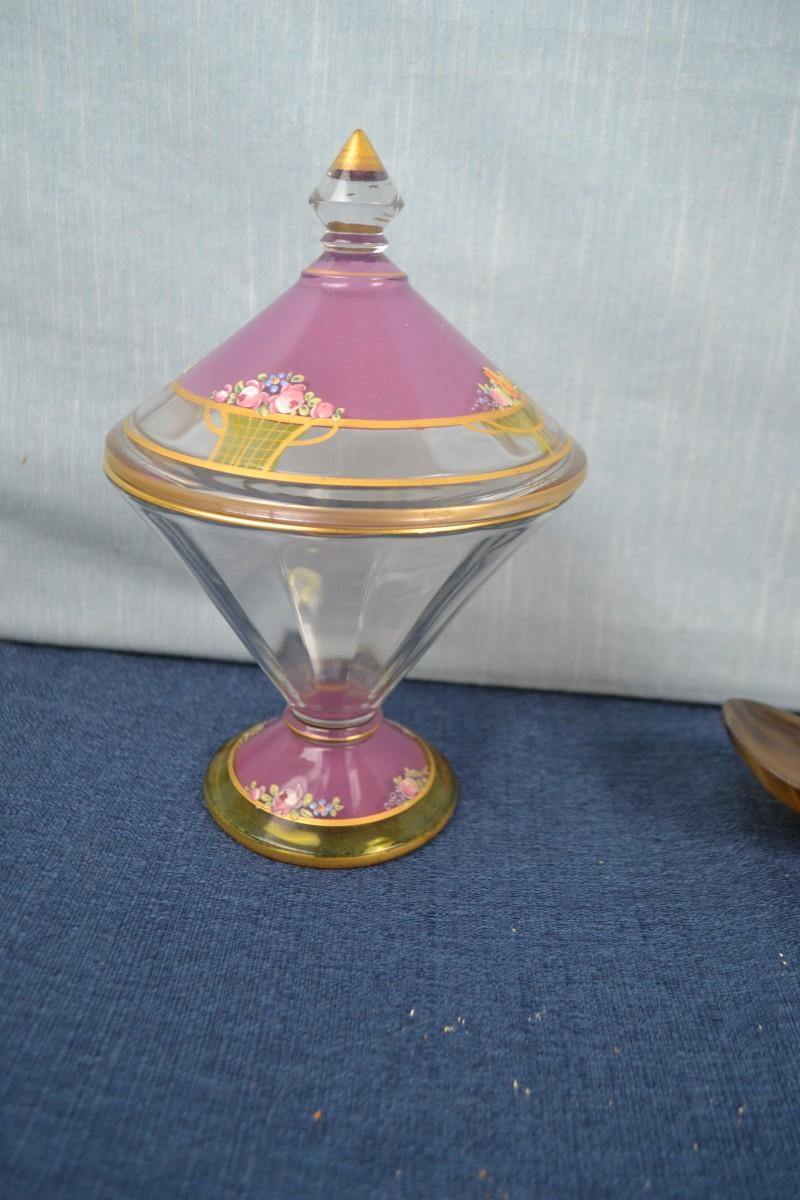LOT 302 PINK GLASS CONE JAR WITH LID AND DECORATIVE SPOON