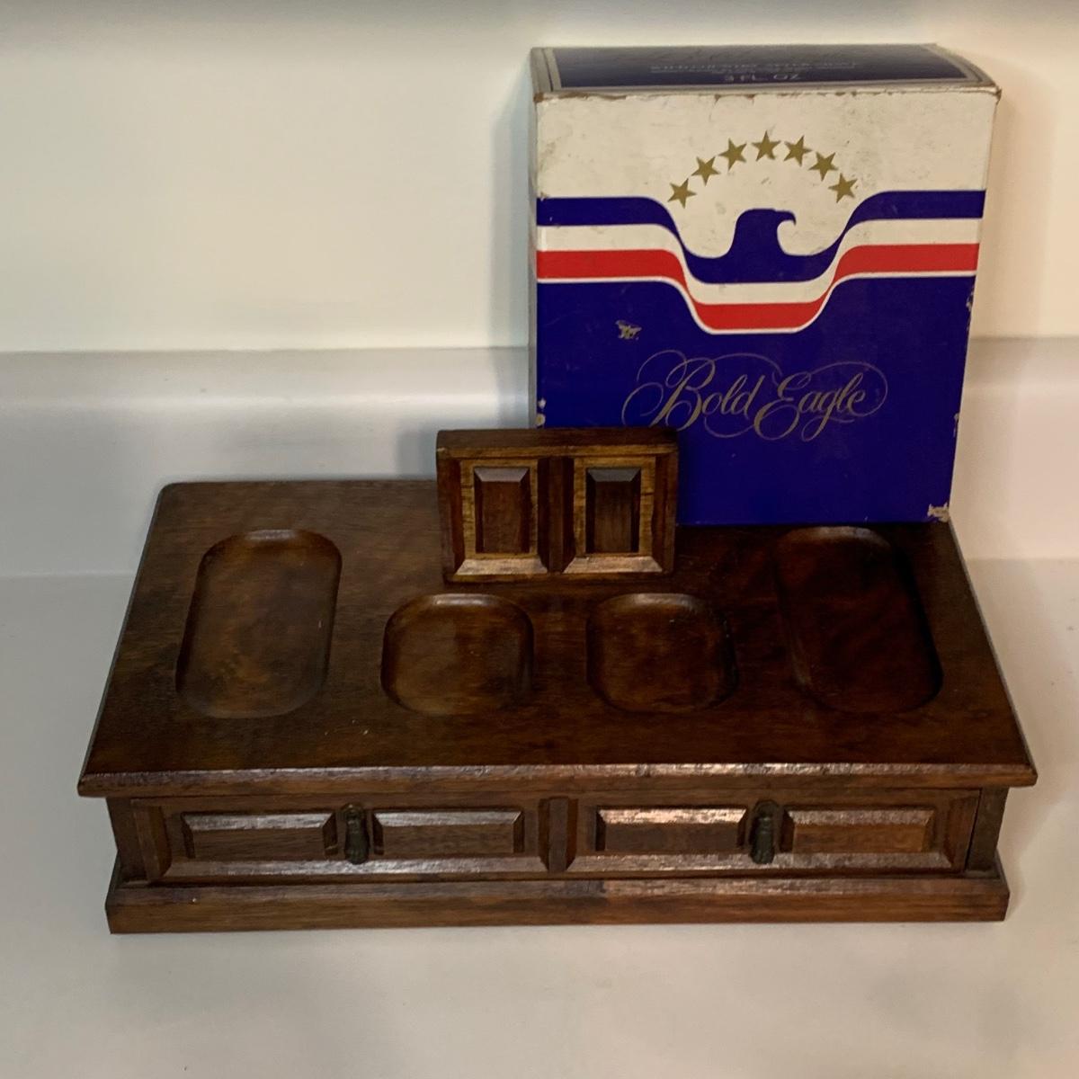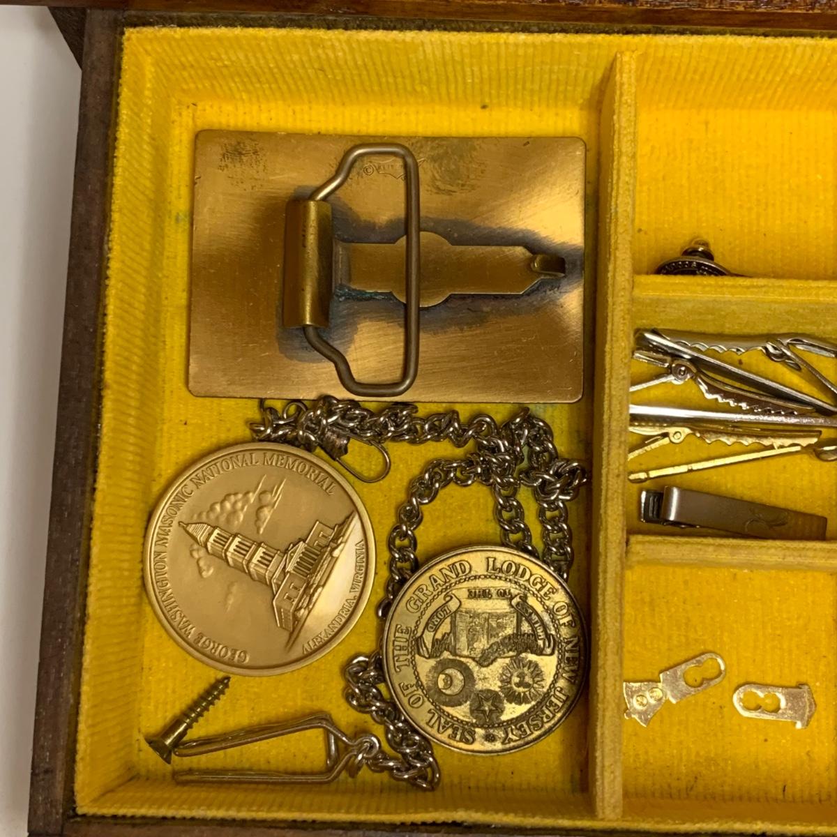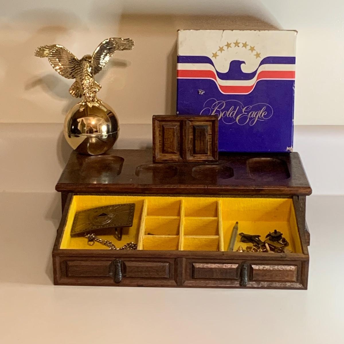 Lot 302R: Men's Dresser Valet, Cuff Links, Tie Clips, Avon Bold Eagle After Shave Bottle & More