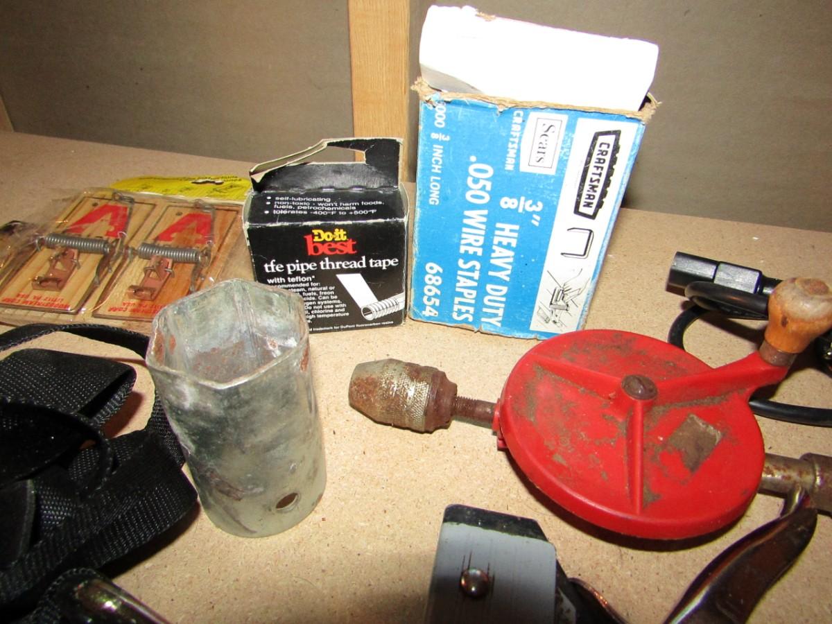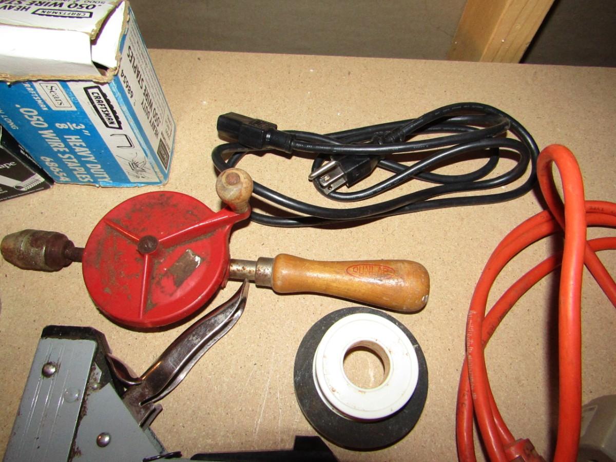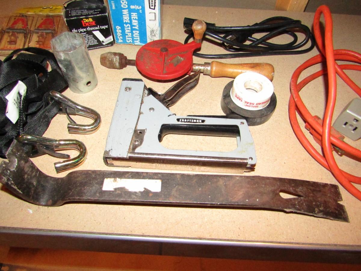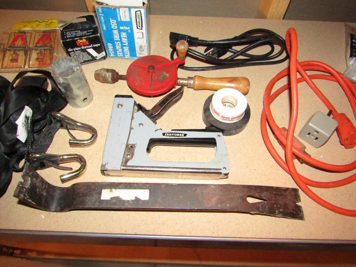 WIRE STRIPPER AND CRIMPER, NAIL PULLER, HAND CRANK DRILL, STAPLE GUN AND STAPLES, PUTTY KNIFE, PLUMBERS AND ELECTRICAL TAPE, RATCHET STRAP, SHORT EXTENSION CORD, HOSE CLAMPS AND MORE