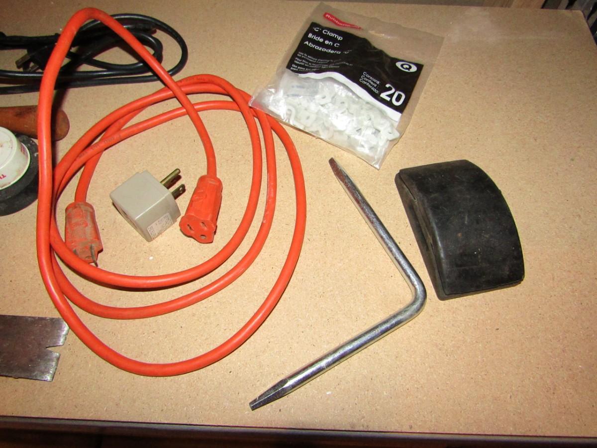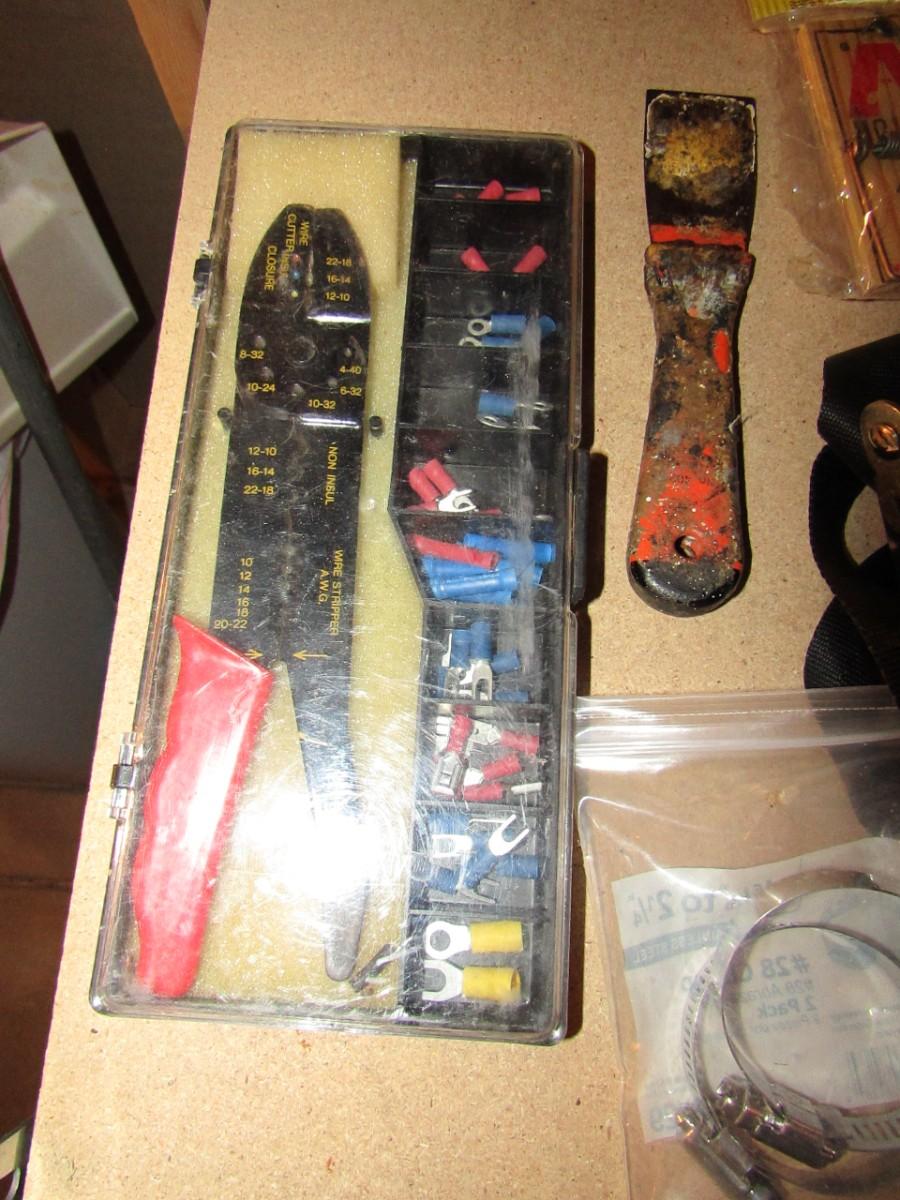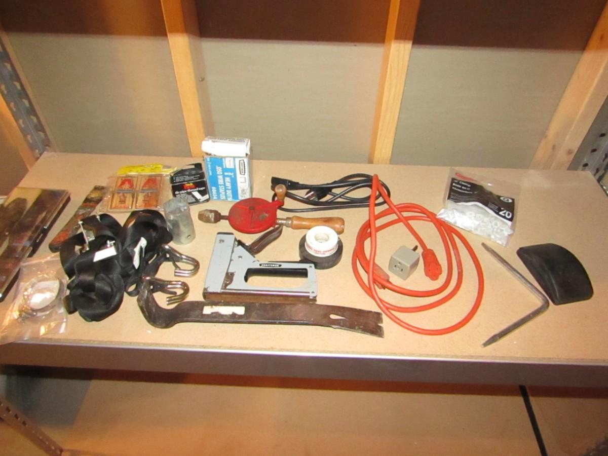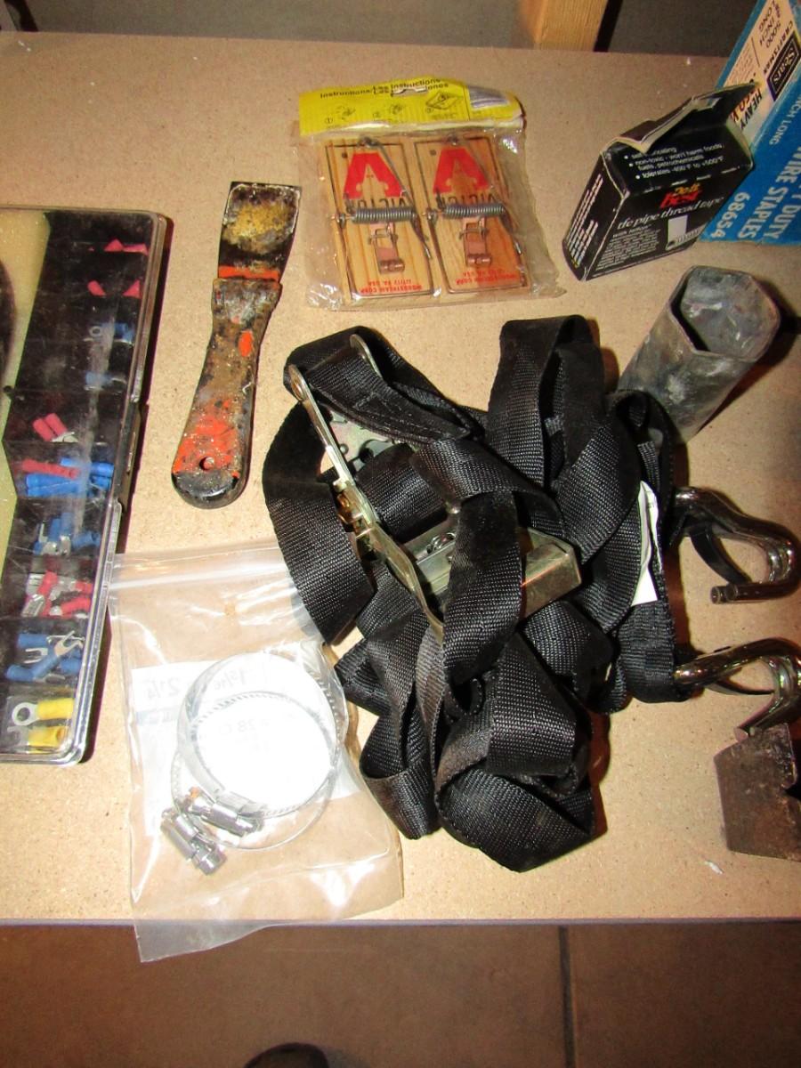WIRE STRIPPER AND CRIMPER, NAIL PULLER, HAND CRANK DRILL, STAPLE GUN AND STAPLES, PUTTY KNIFE, PLUMBERS AND ELECTRICAL TAPE, RATCHET STRAP, SHORT EXTENSION CORD, HOSE CLAMPS AND MORE