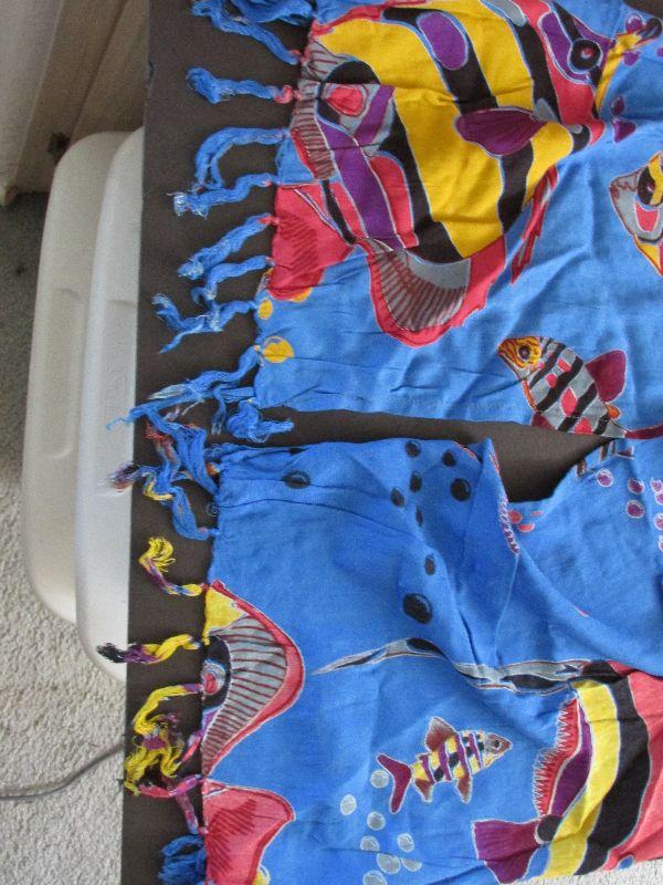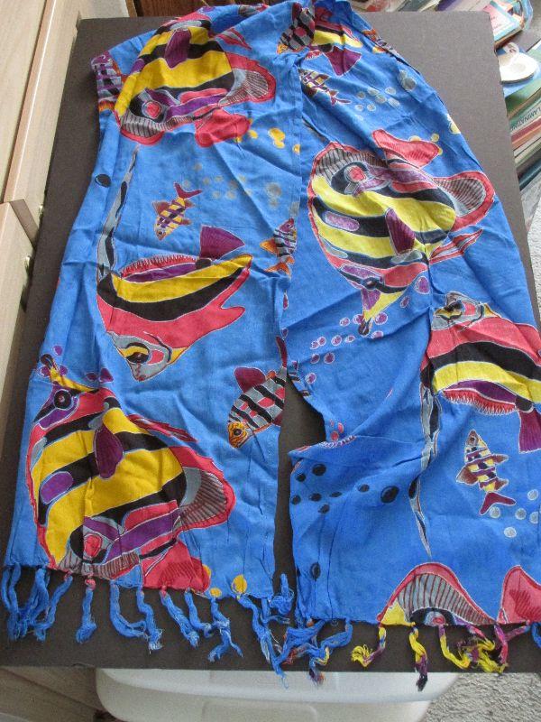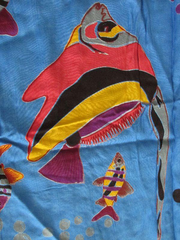 Blue with fishes scarf. Made in Indonesia. 100% Rayon.