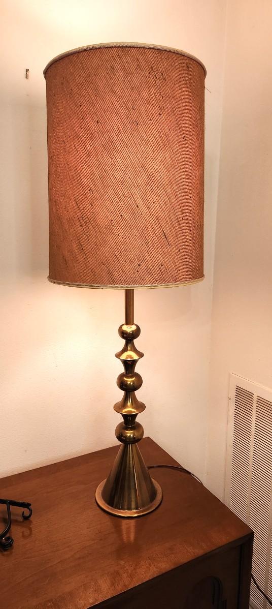 Nice MCM table lamp - works - brass base, original shade. 40" tall.