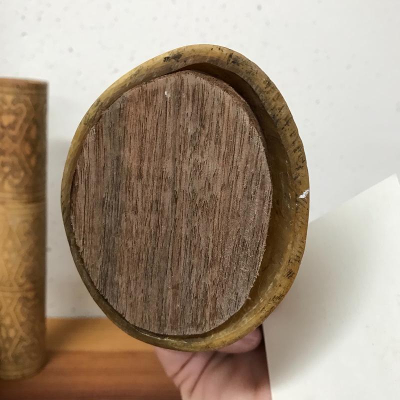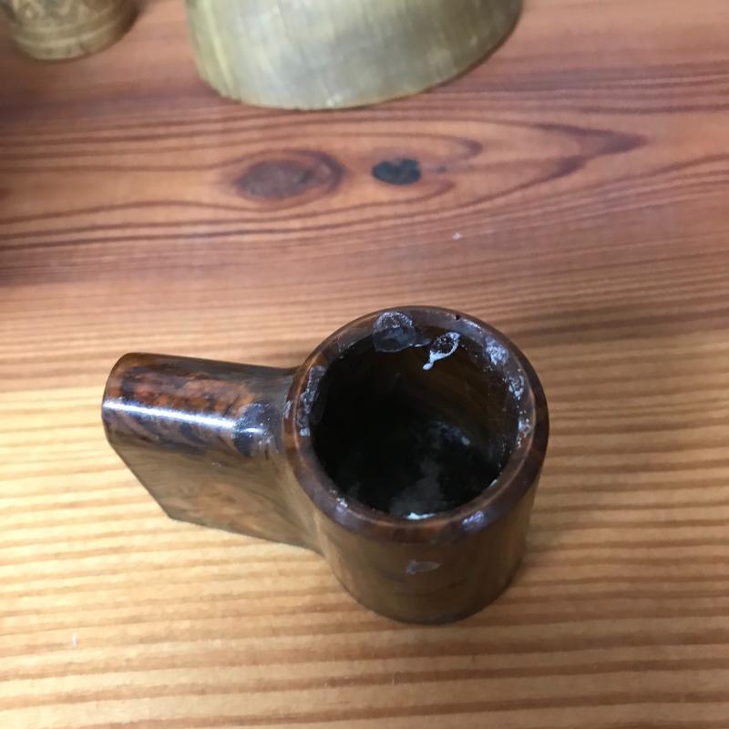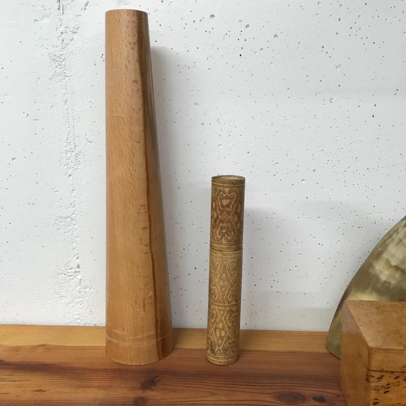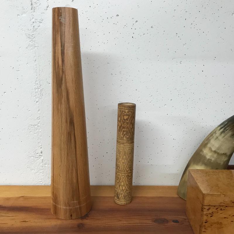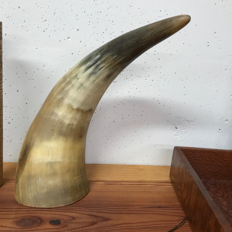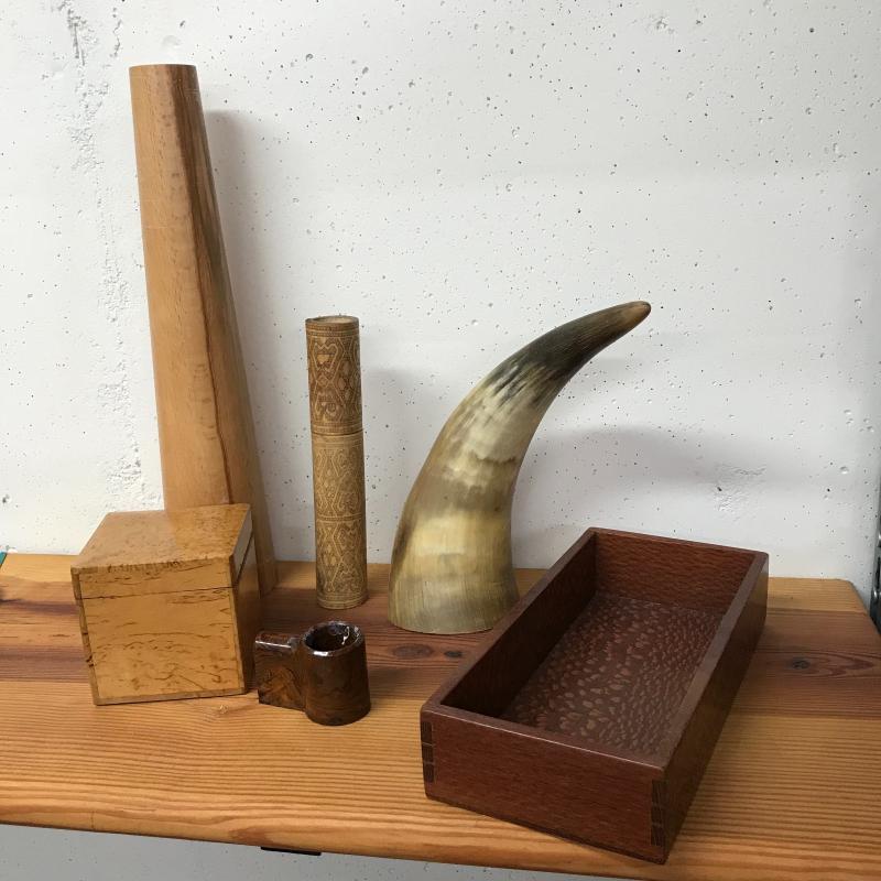 Several wood pieces including a solid wood cone like piece, a small wood box with metal lining, maybe used for tea, a wood storage for long matches, a wooden tray like box in dark wood and a dark wood vase with some white stain on it. Also, a horn. Lot is available for local pick up only in Asheville, NC.