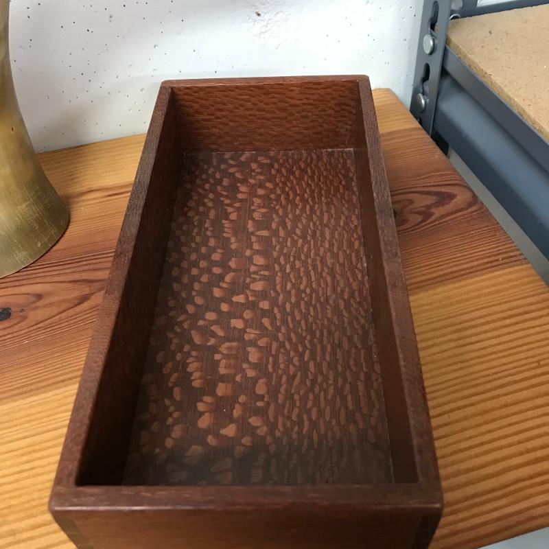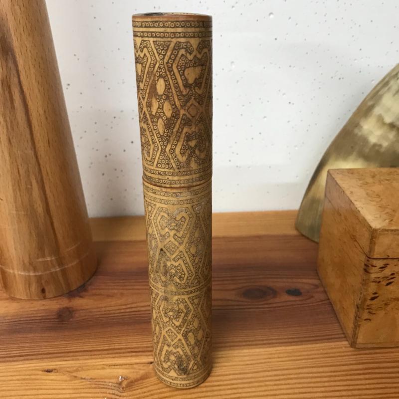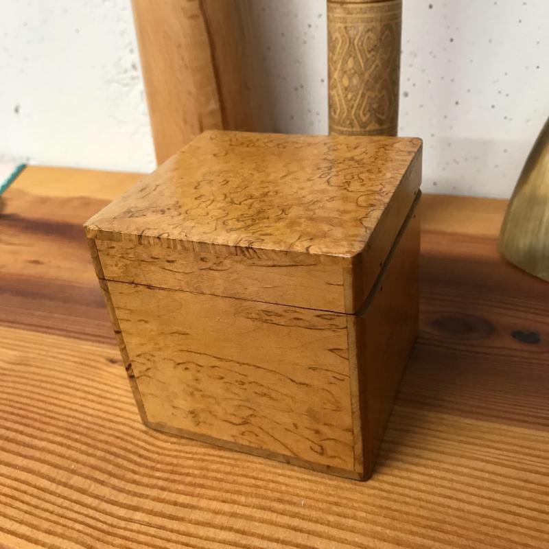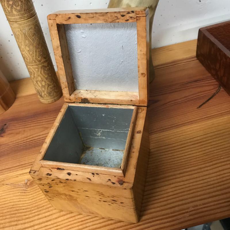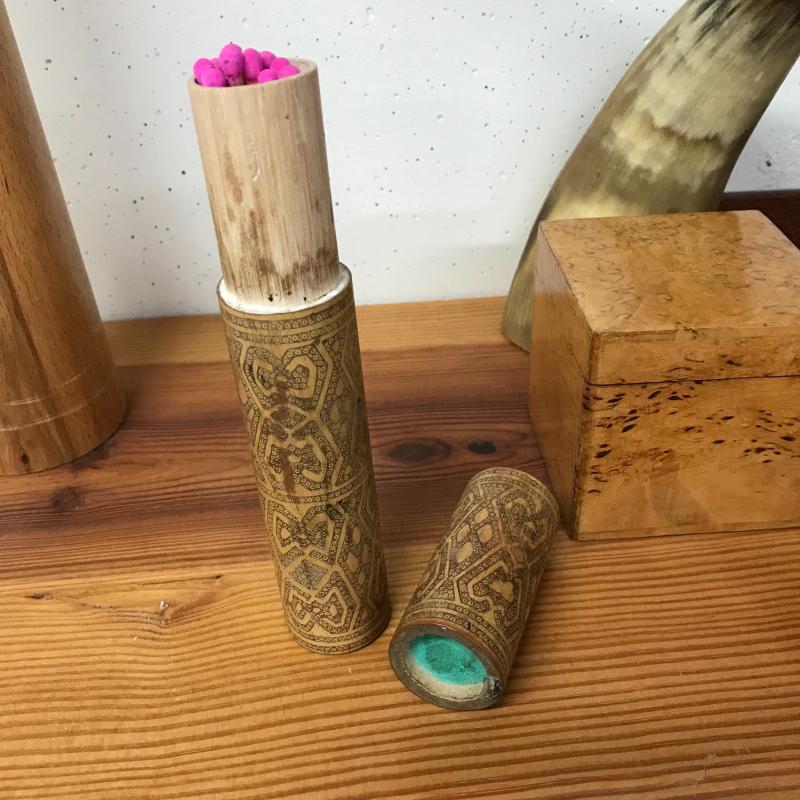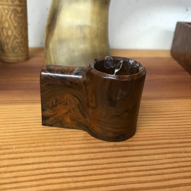Several wood pieces including a solid wood cone like piece, a small wood box with metal lining, maybe used for tea, a wood storage for long matches, a wooden tray like box in dark wood and a dark wood vase with some white stain on it. Also, a horn. Lot is available for local pick up only in Asheville, NC.