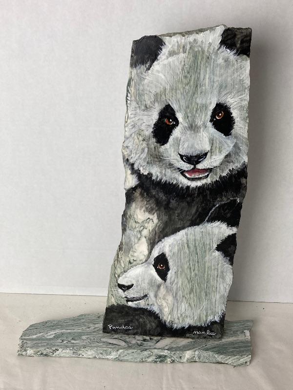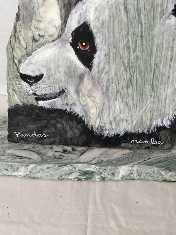 Nan Lee signed painting on stone “Pandas” has attached base. Measures 19” tall 15” wide and 3-1/2” deep (including base). Very heavy piece