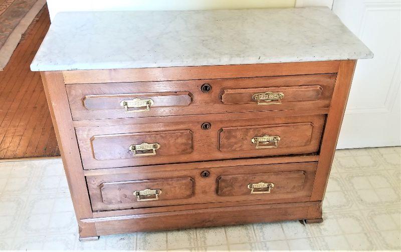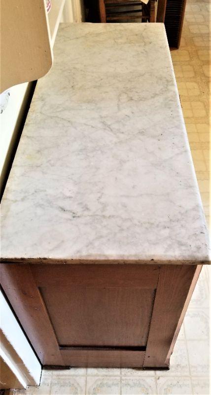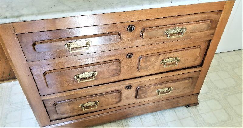 This little late Victorian bureau is kind of a "Frankenstein" piece - was being used in the kitchen for a microwave stand. It is late Victorian - hardware has been replaced with modern stuff in the antique style - marble top is in good condition but is a replacement and is not attached. No key. Measures 39.25" across, 16" deep, and 29.25" tall. Use as this lady was using it, or perhaps in a bathroom for towels and toiletries.