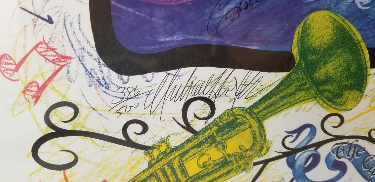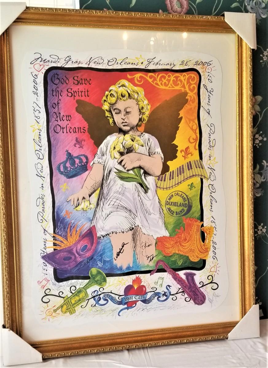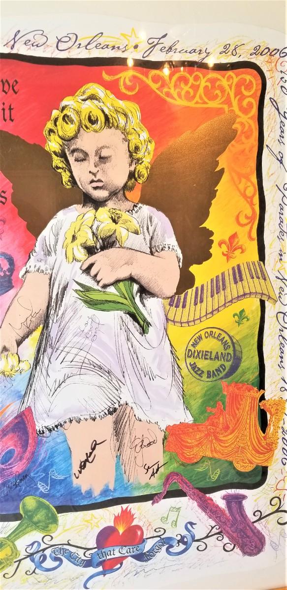 150 Years of Parades - New Orleans Dixieland Jazz Bands - 2006 limited edition 386/500. Signed - 35" tall, 27" across. Nicely framed. Note: in one place a few bits of dust has worked its way under the glass - see photo.