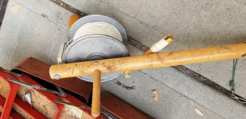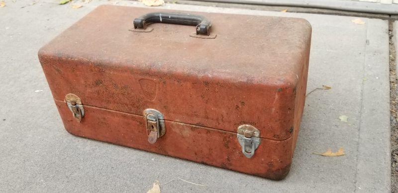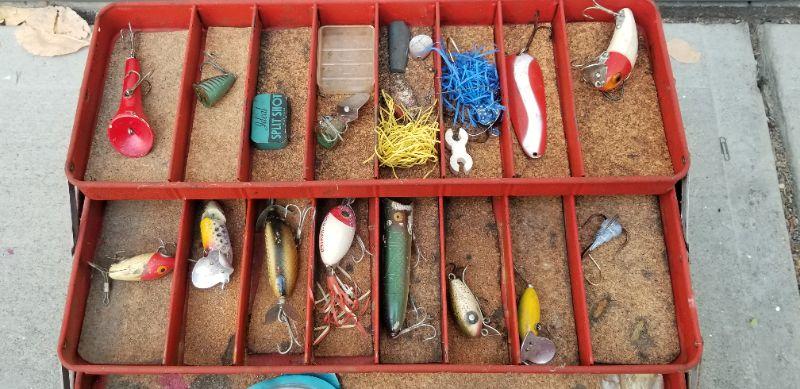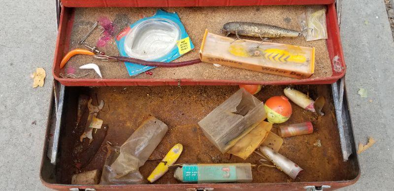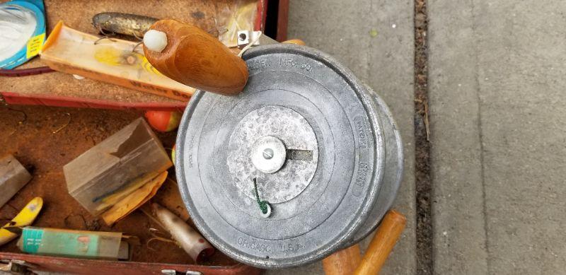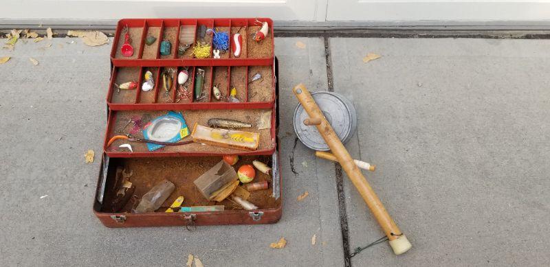 Lot #303: Vintage Large Fishing Reel and Tackle Box w/ Assortment
