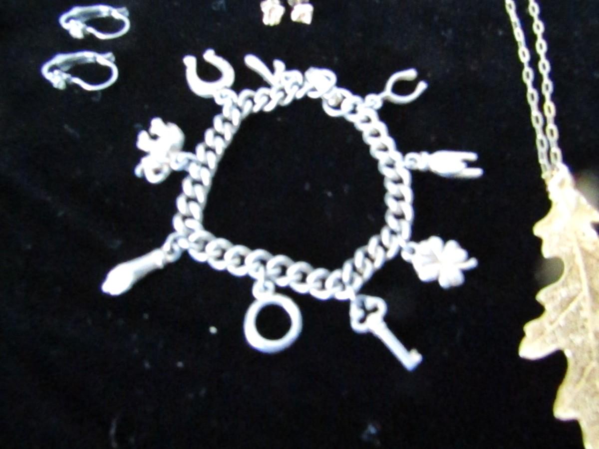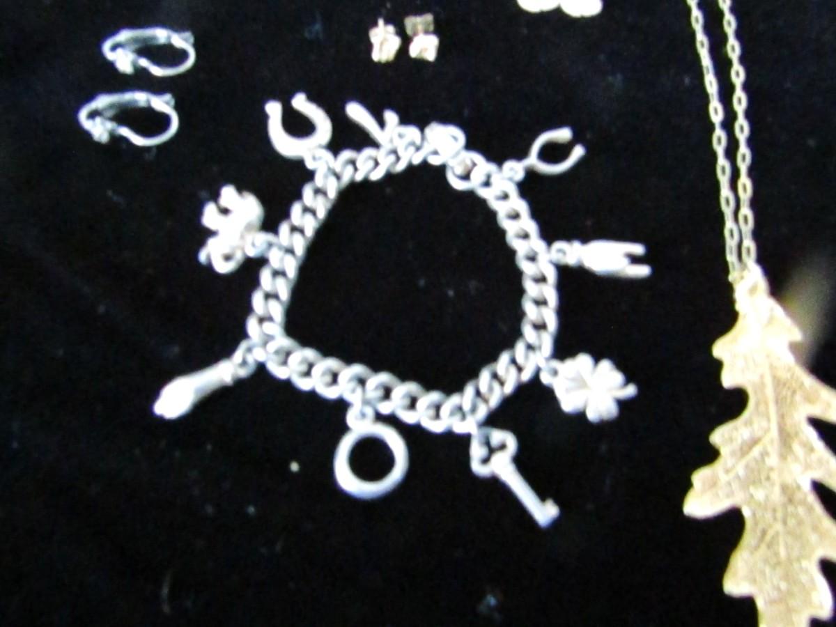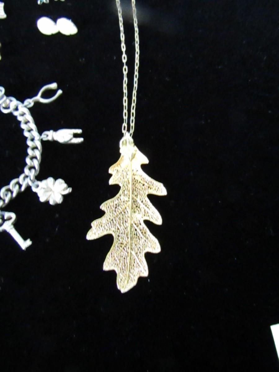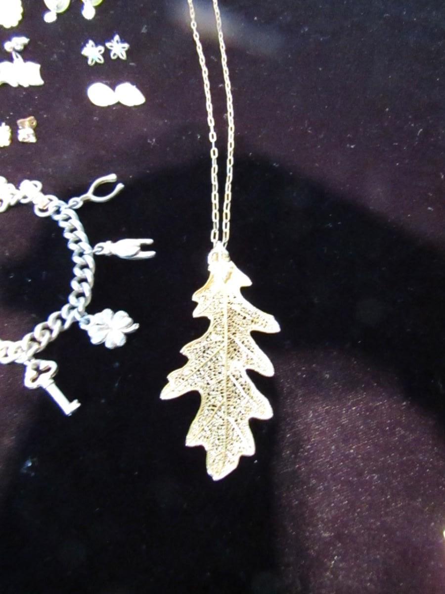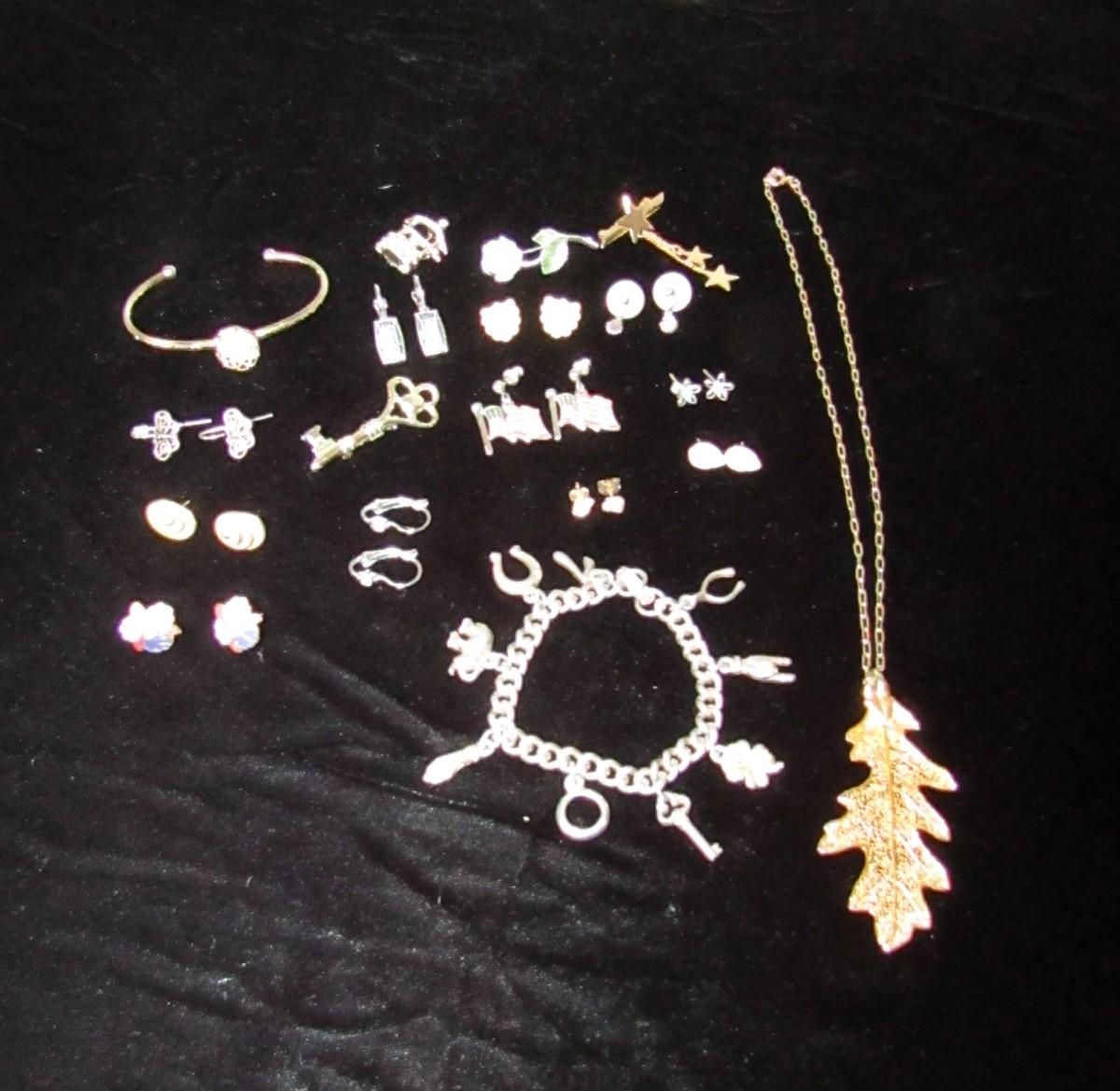 PIERCED EARRINGS, GOLD LEAF NECKLACE, CHARM BRACELET, LAPEL PINS