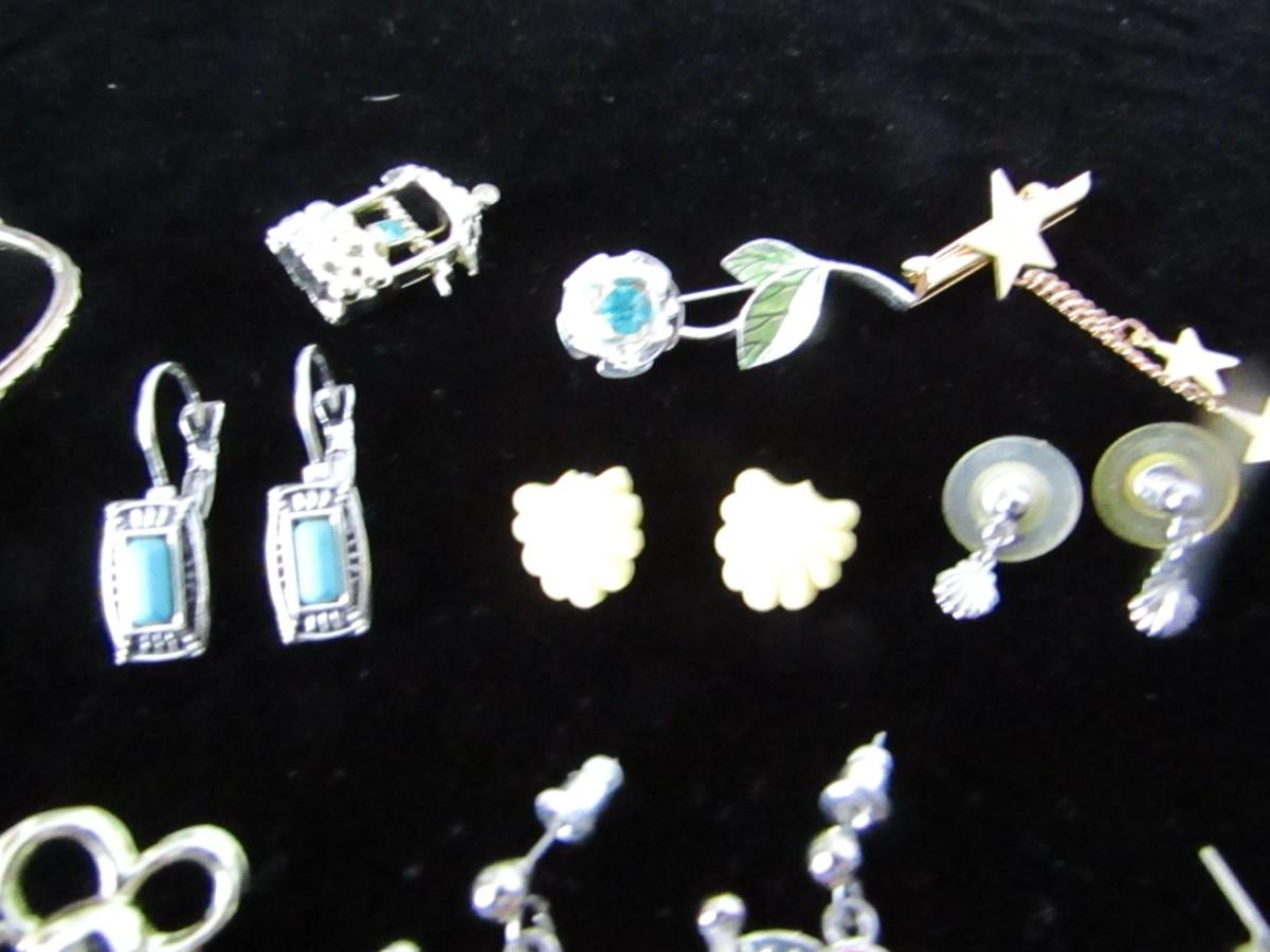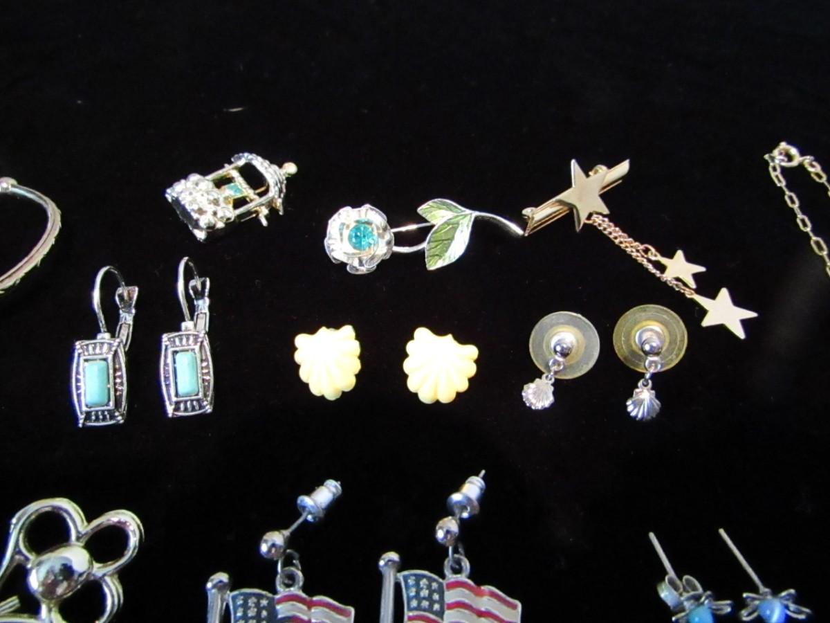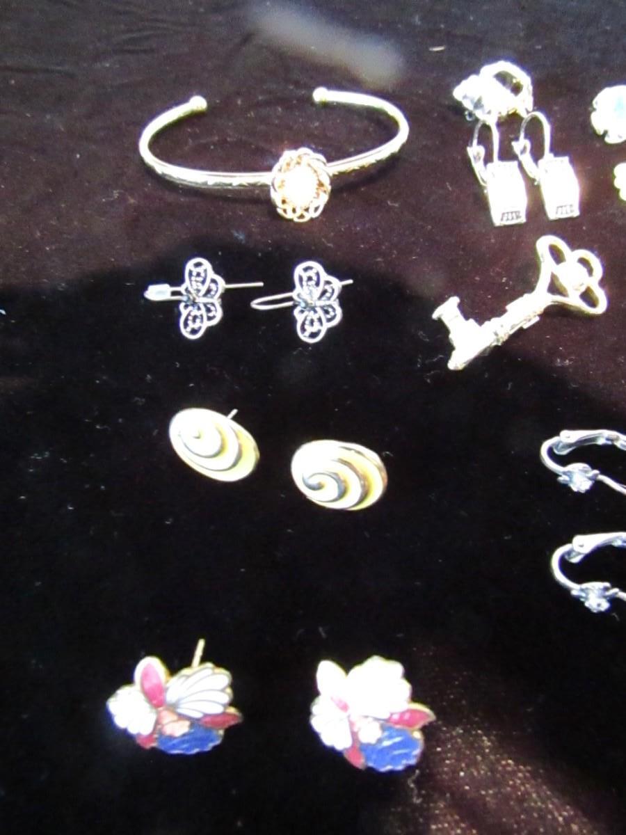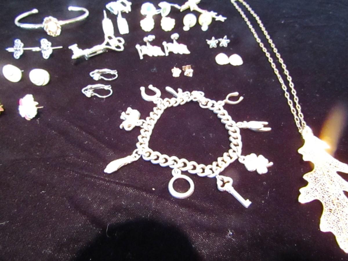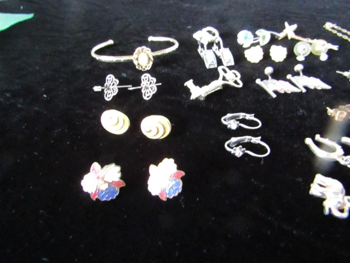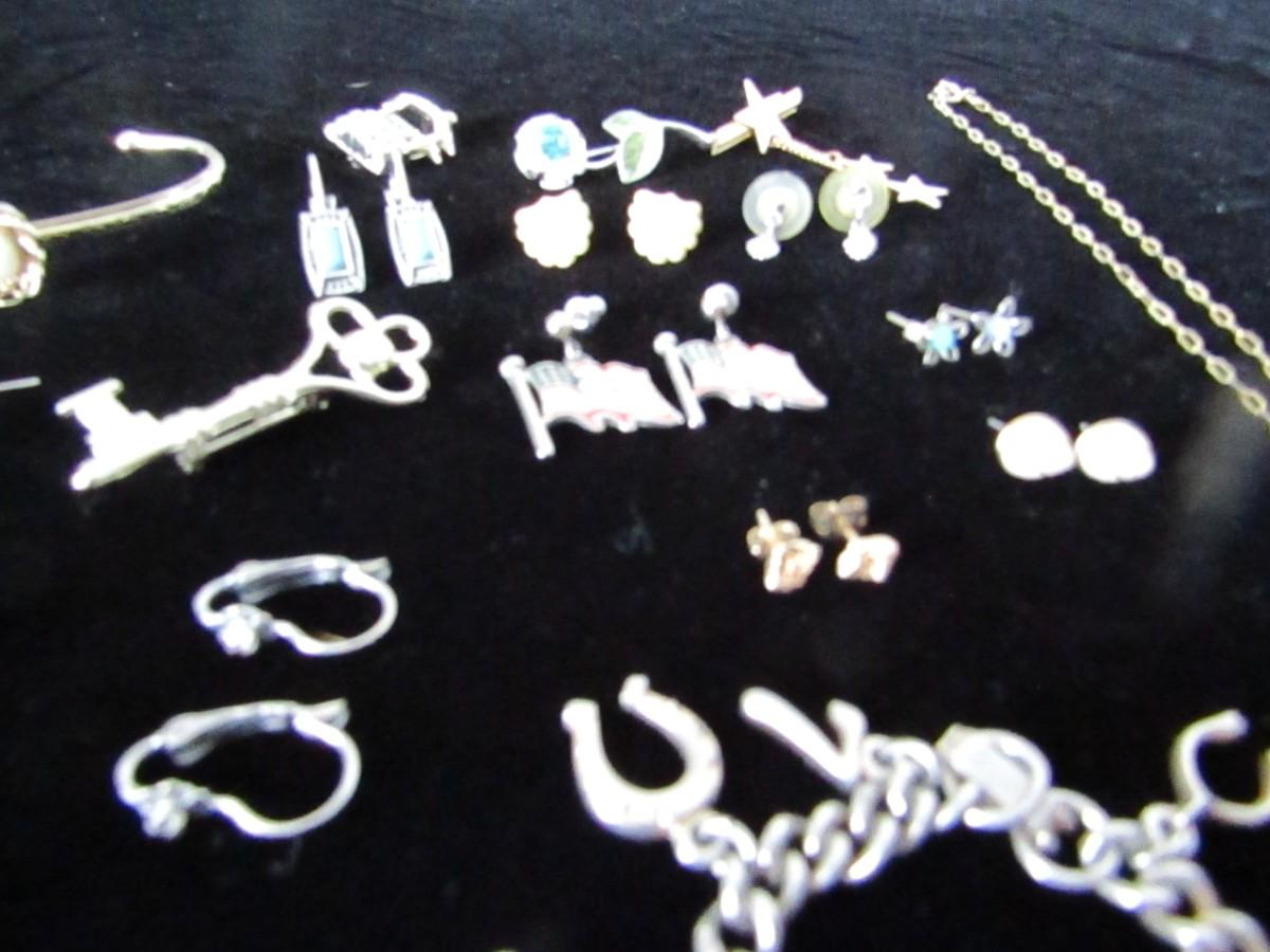 PIERCED EARRINGS, GOLD LEAF NECKLACE, CHARM BRACELET, LAPEL PINS