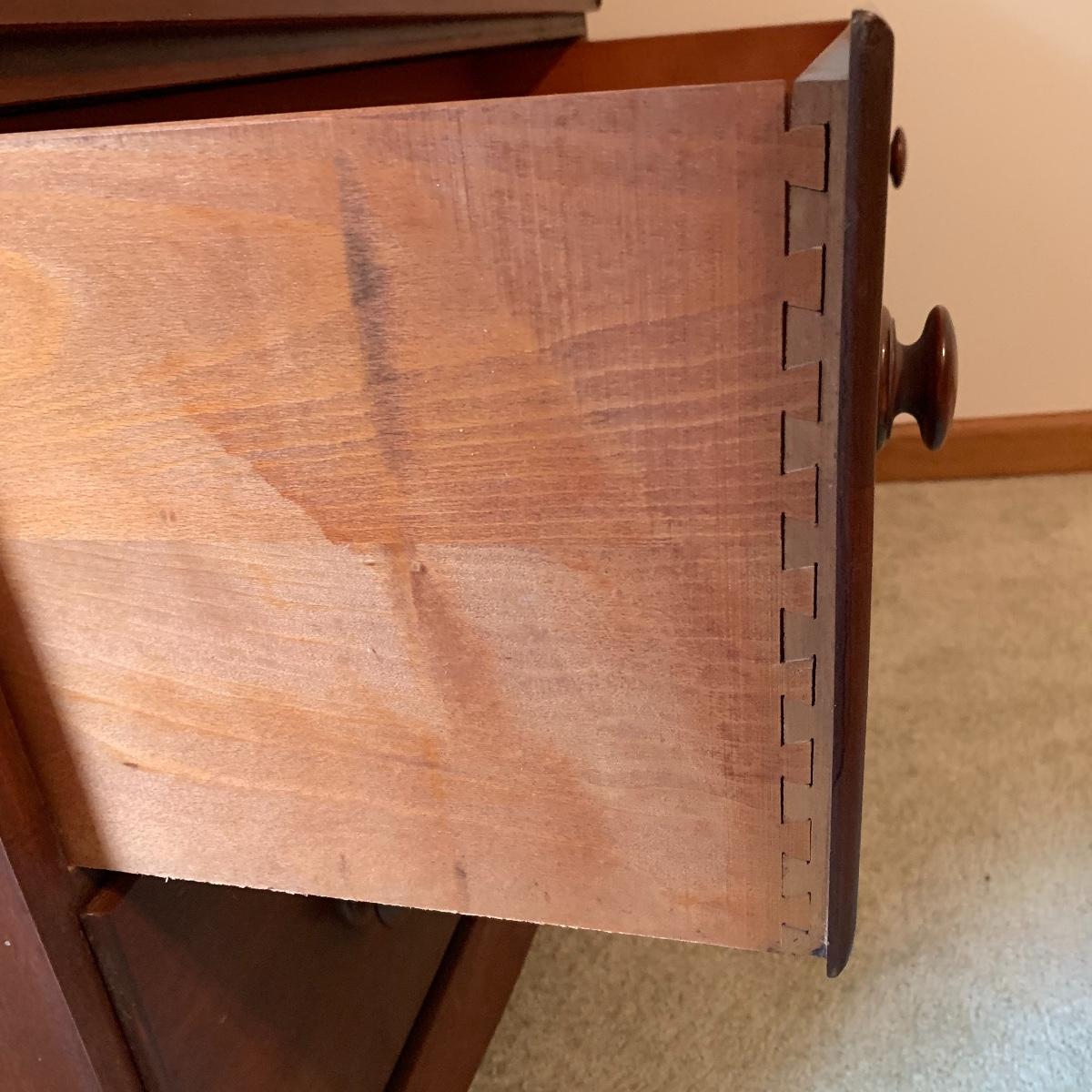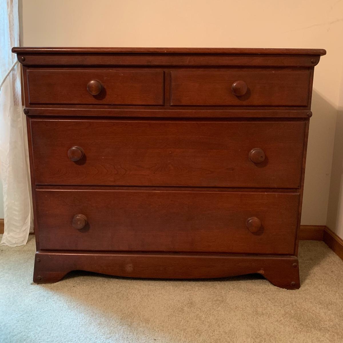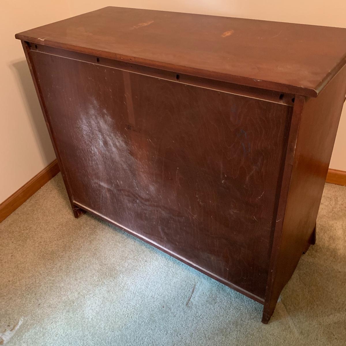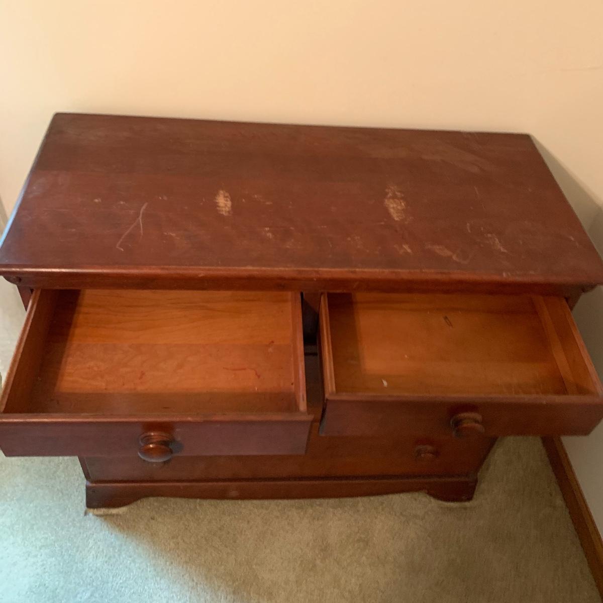 This lovely wooden chest of drawers matches the larger one found in lot 299. It has two smaller dovetailed drawers on the top and two larger dovetailed drawers on the bottom. It is in used condition with some scratches on the surface. The white seen on the back of the unit appears to be chalk. The unit is very sturdy. It measures 42” x 19” x 35”. Local pickup only. Please note that the winning bidder will need to move this heavy item from the second floor of the house.