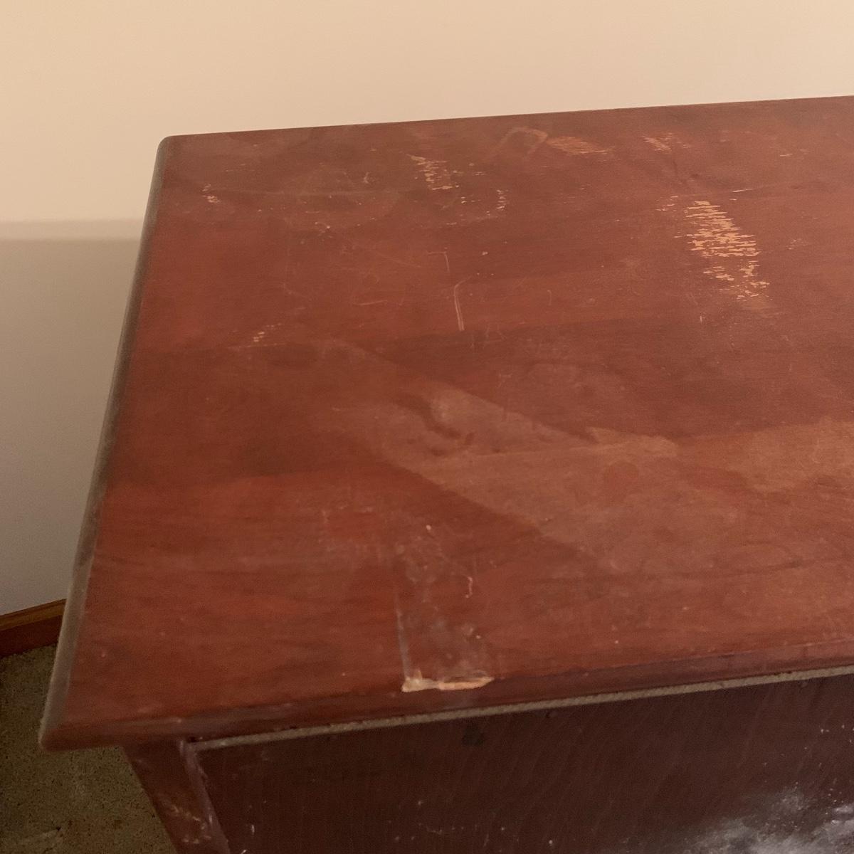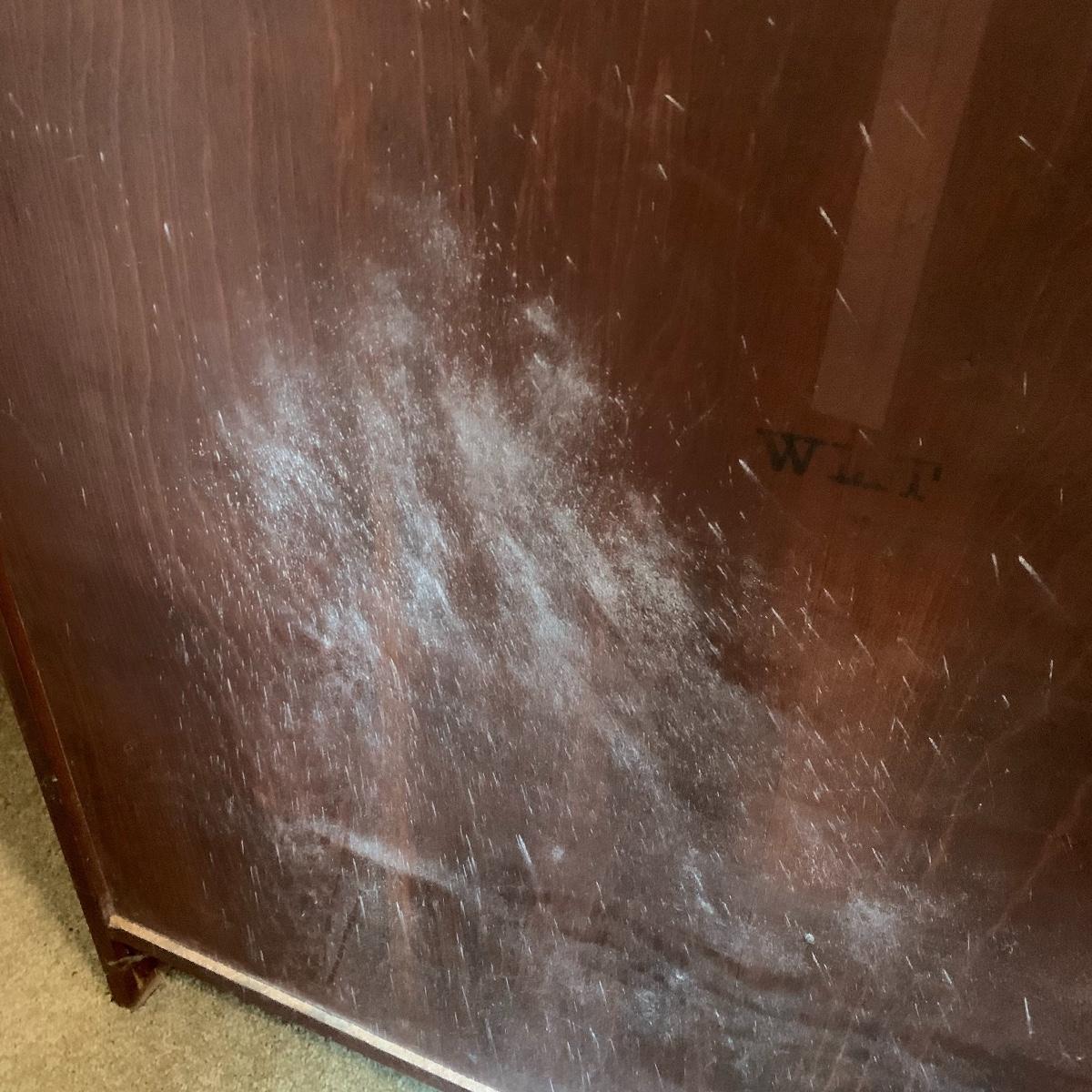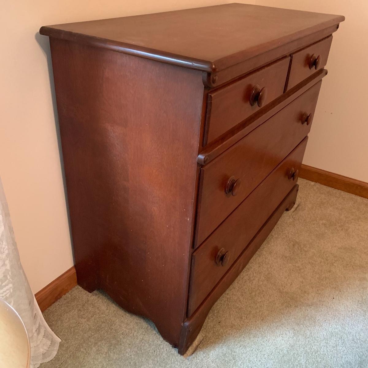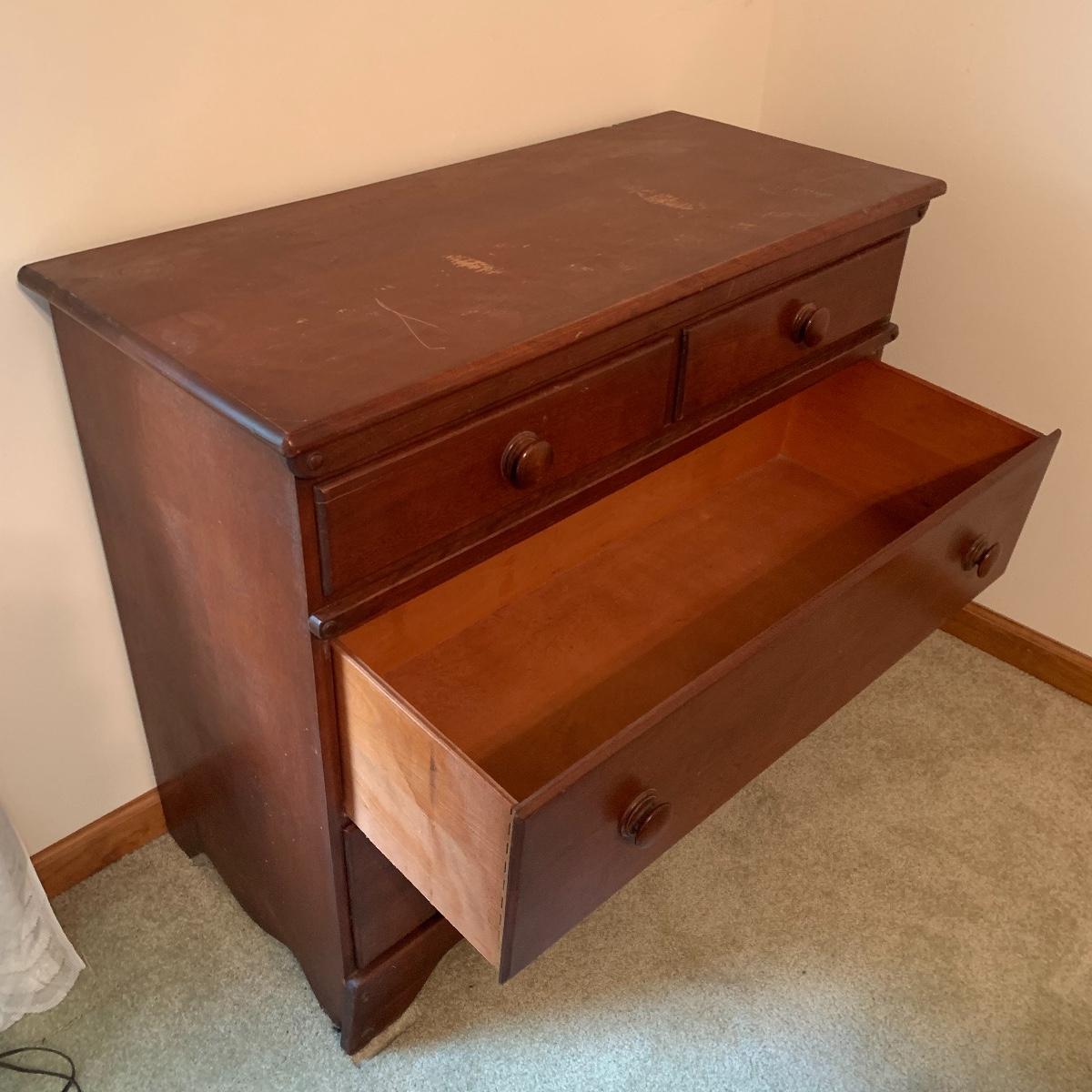 This lovely wooden chest of drawers matches the larger one found in lot 299. It has two smaller dovetailed drawers on the top and two larger dovetailed drawers on the bottom. It is in used condition with some scratches on the surface. The white seen on the back of the unit appears to be chalk. The unit is very sturdy. It measures 42” x 19” x 35”. Local pickup only. Please note that the winning bidder will need to move this heavy item from the second floor of the house.