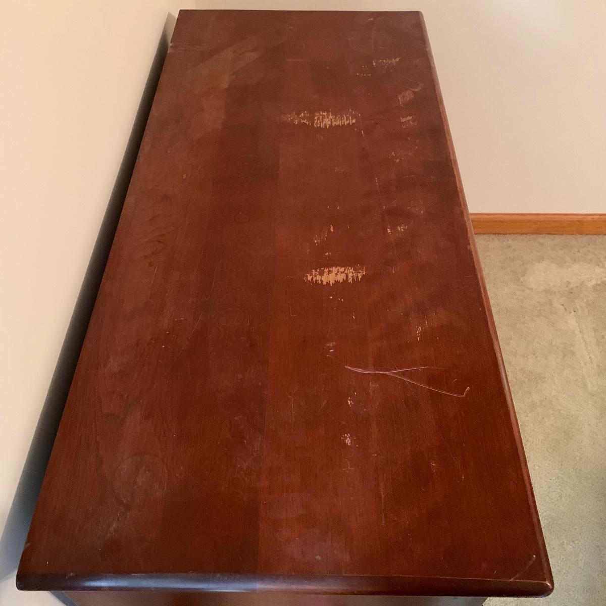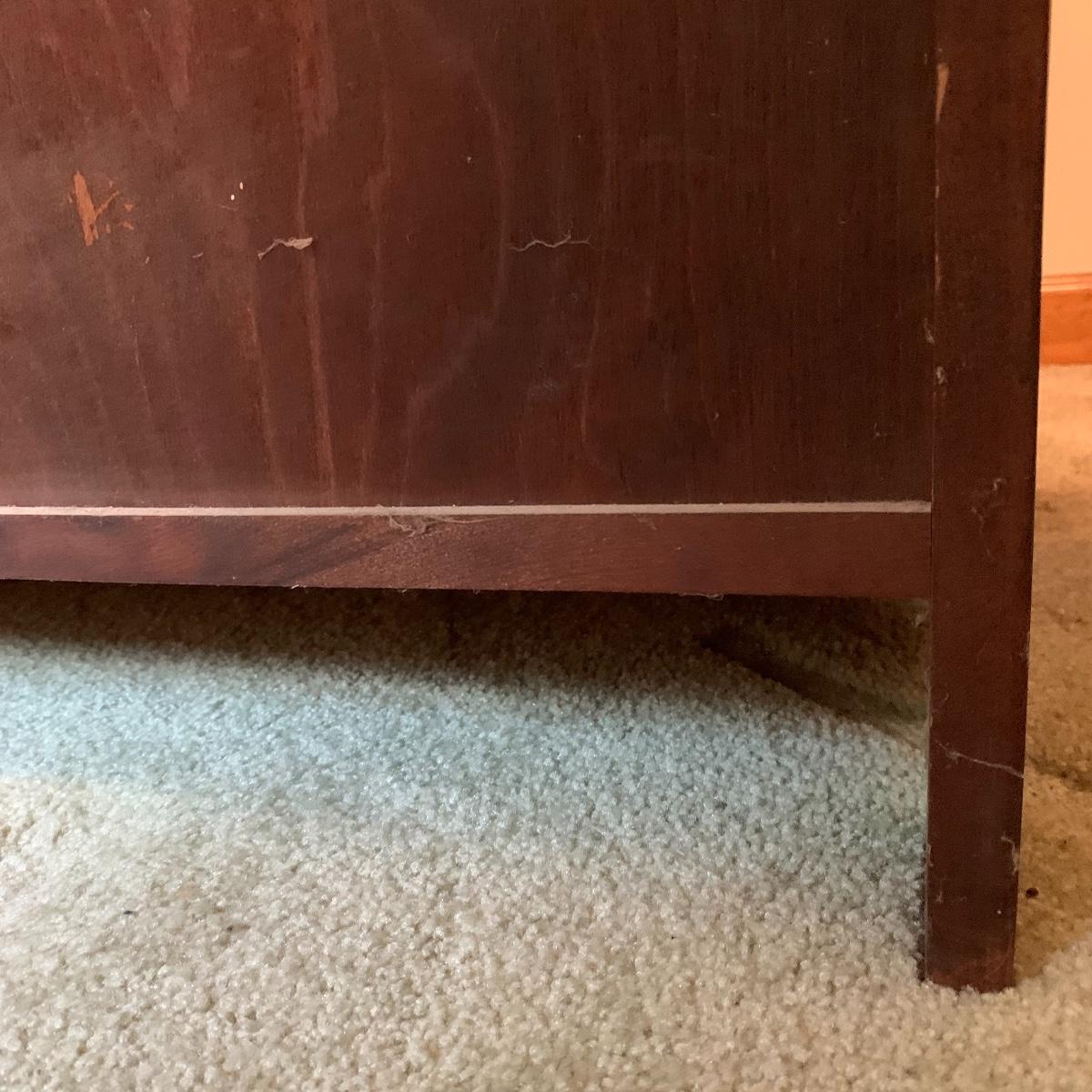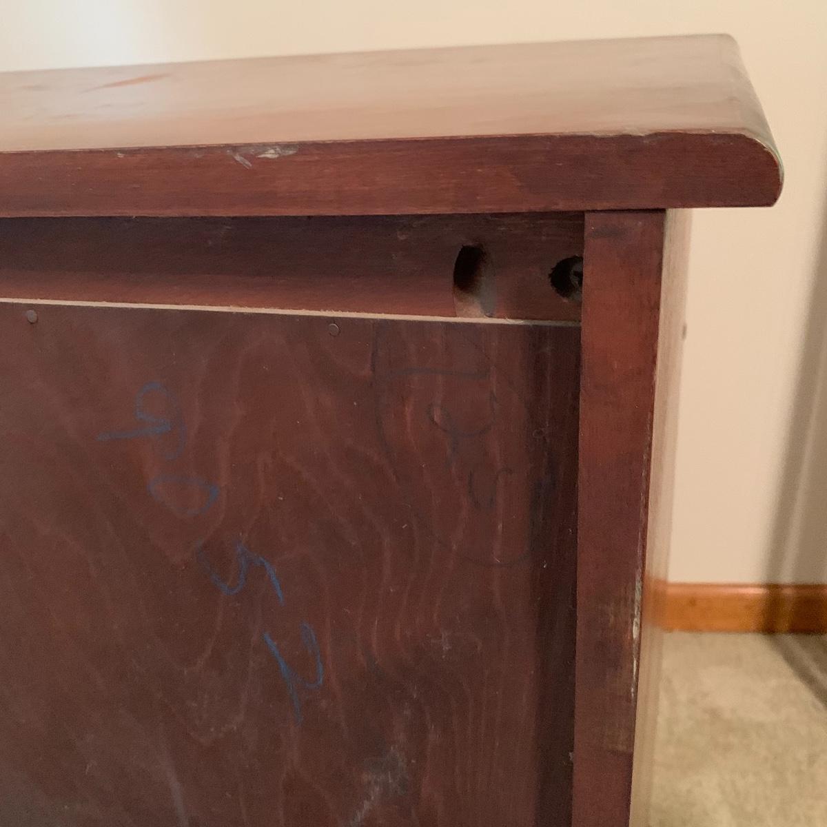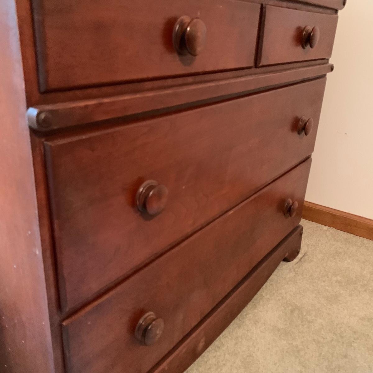 This lovely wooden chest of drawers matches the larger one found in lot 299. It has two smaller dovetailed drawers on the top and two larger dovetailed drawers on the bottom. It is in used condition with some scratches on the surface. The white seen on the back of the unit appears to be chalk. The unit is very sturdy. It measures 42” x 19” x 35”. Local pickup only. Please note that the winning bidder will need to move this heavy item from the second floor of the house.