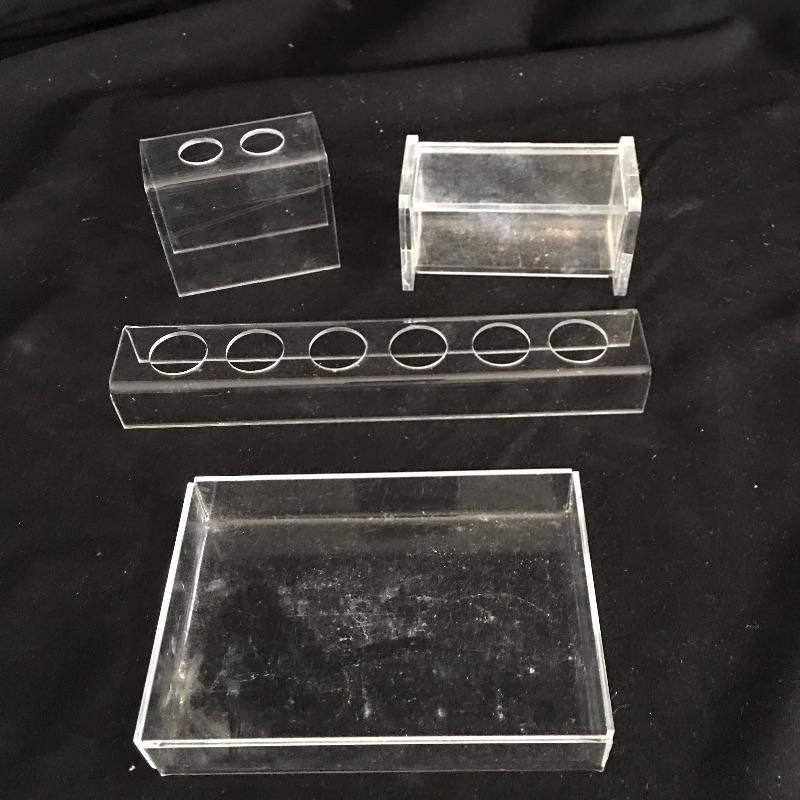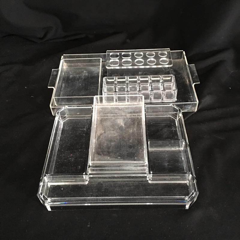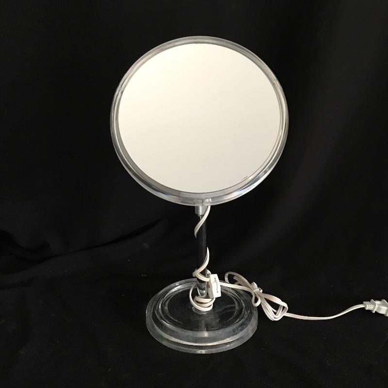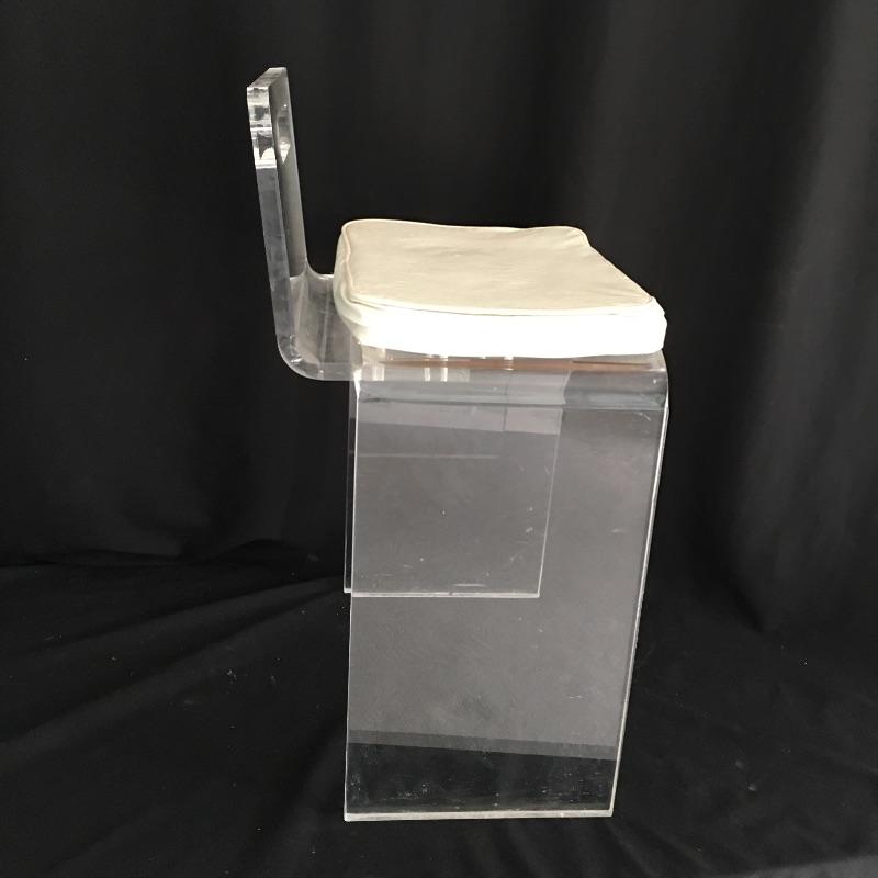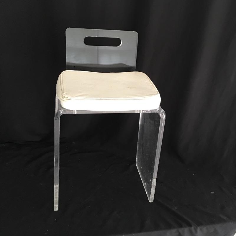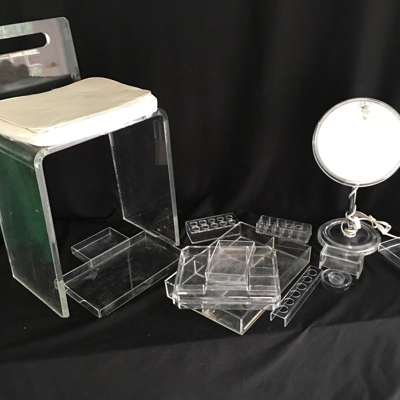 Lucite vanity seat, lighted mirror and assortment of containers and holders. Seat measures 12” x 14” x 24”. Lucite measures 5/8” thick.
