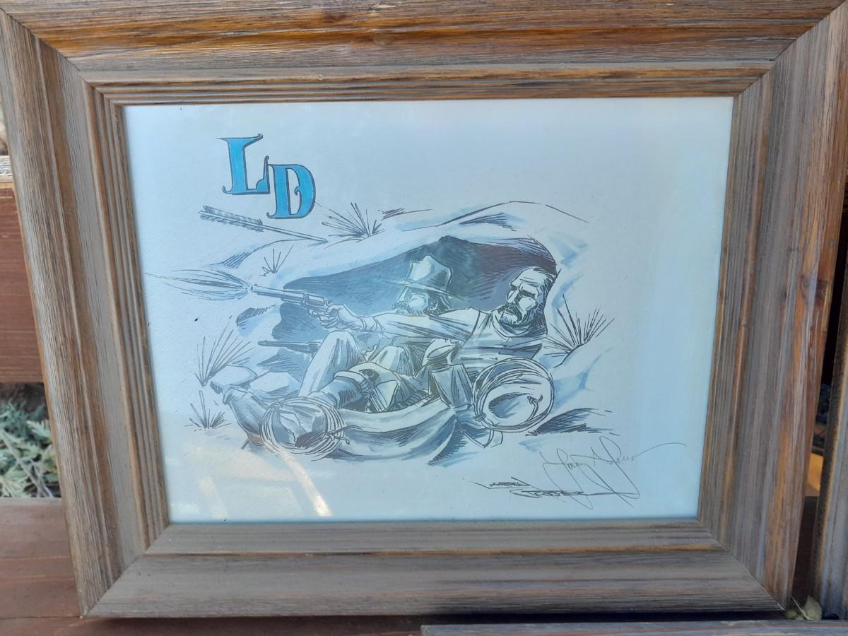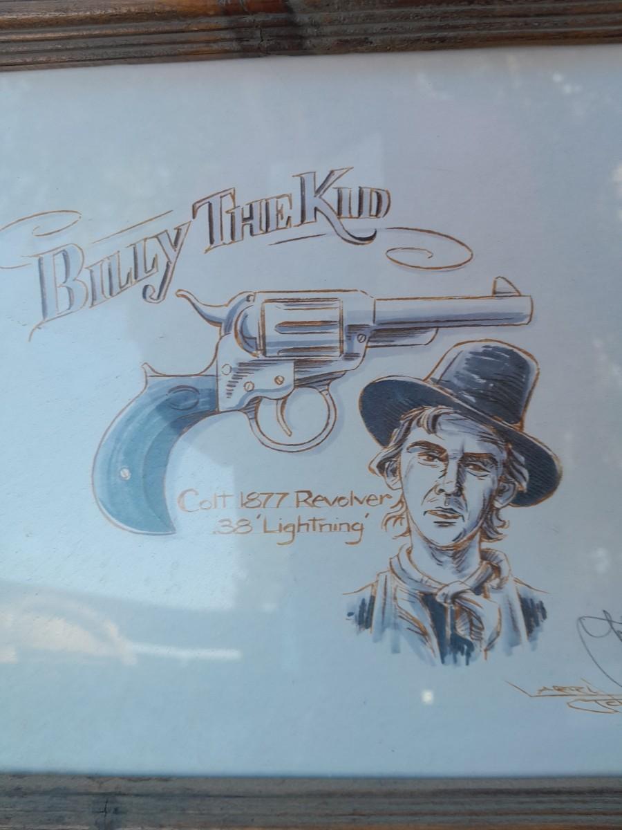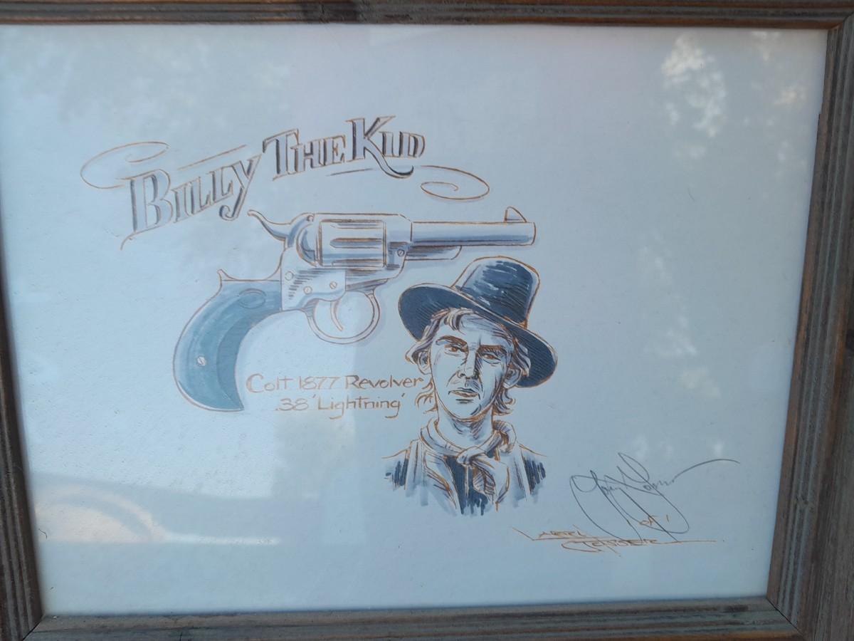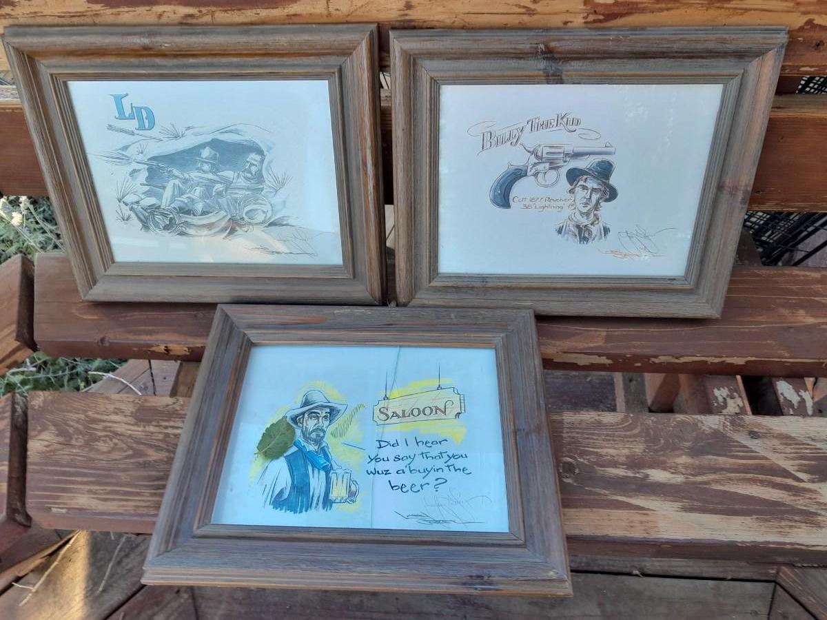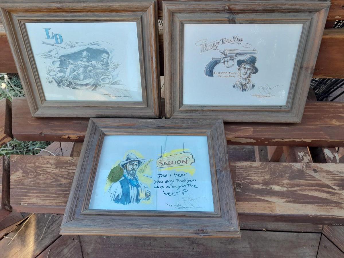 THREE RUSTIC FRAMED, SIGNED DRAWINGS (one has broken glass) BILLY THE KID, SALOON COWBOY, AND LD SHOOTING COWBOYS