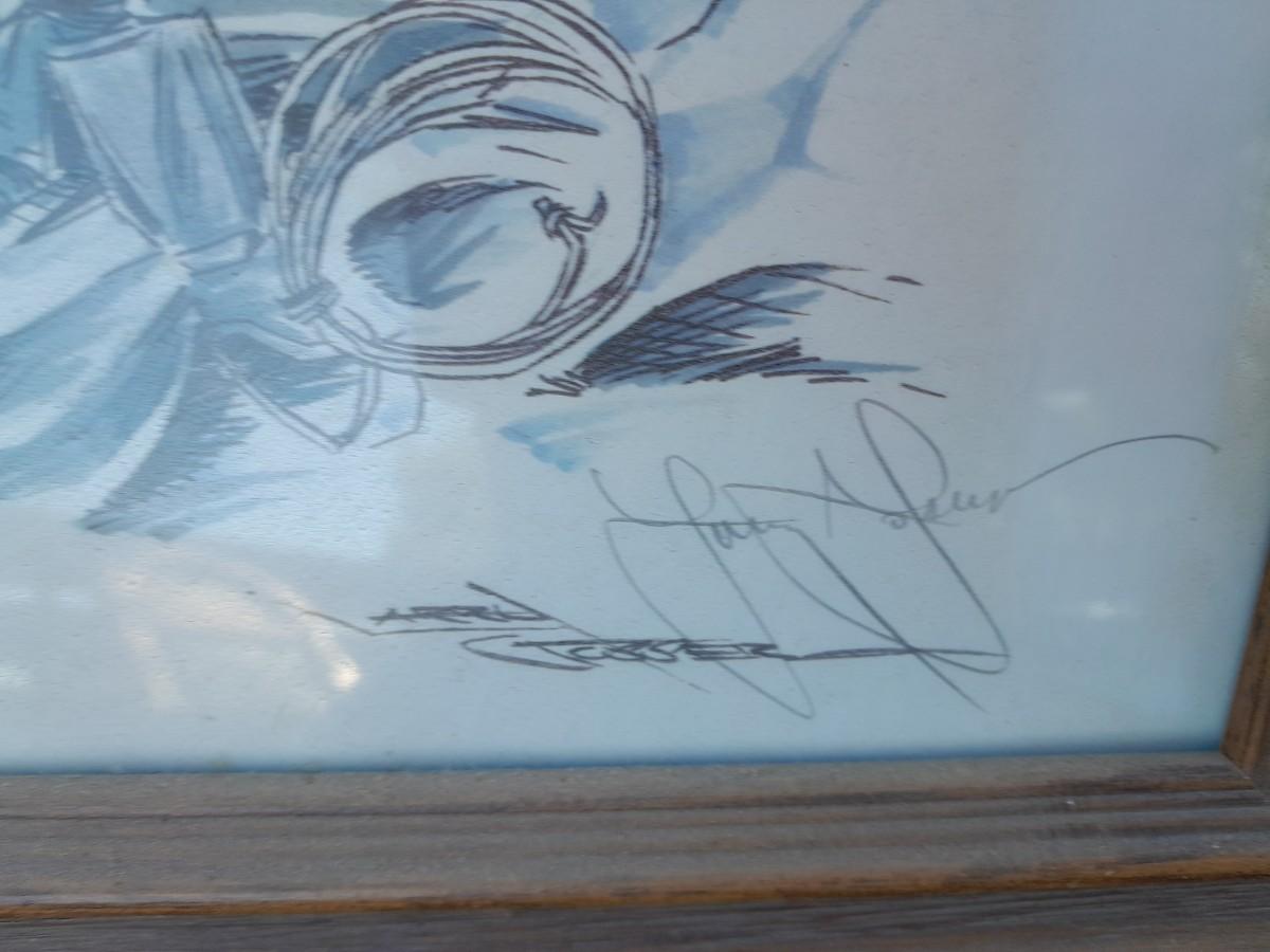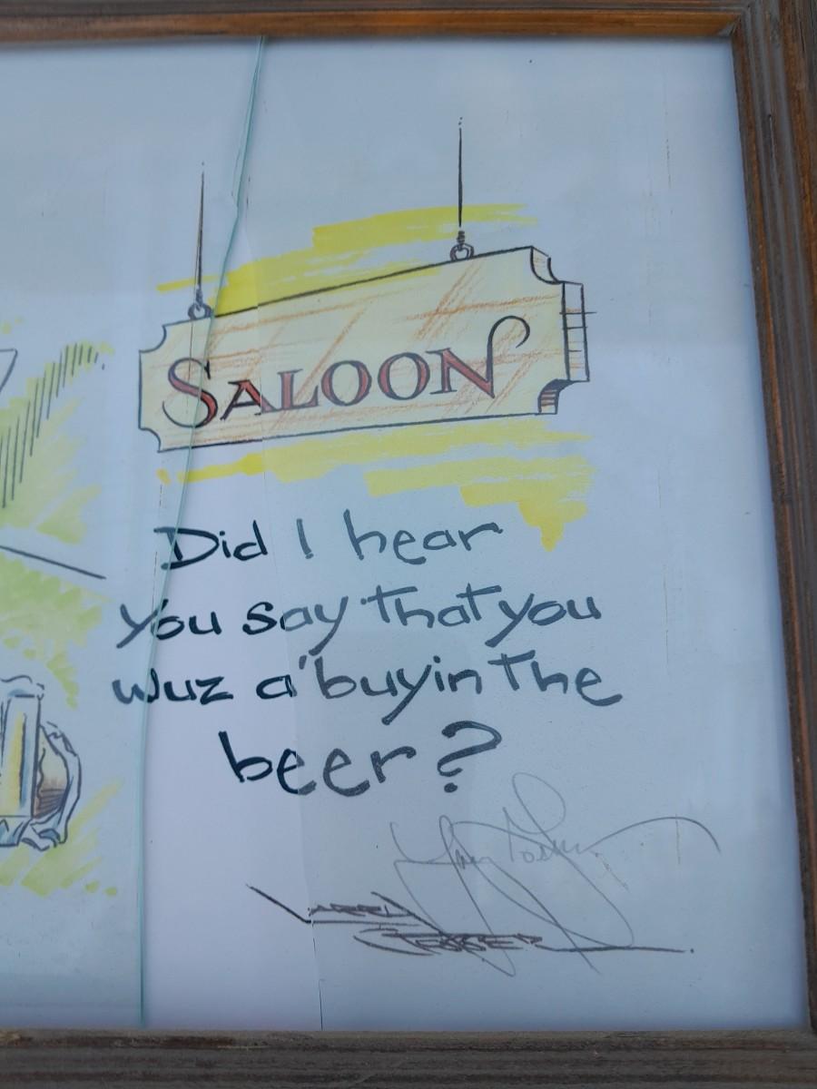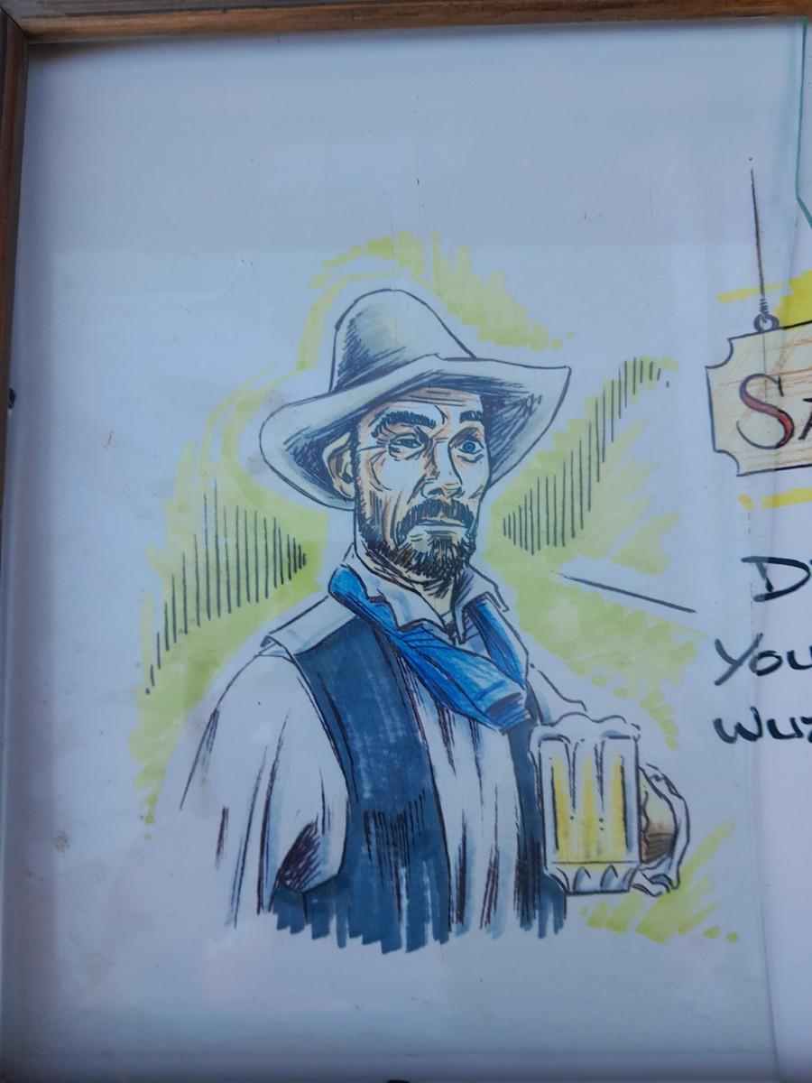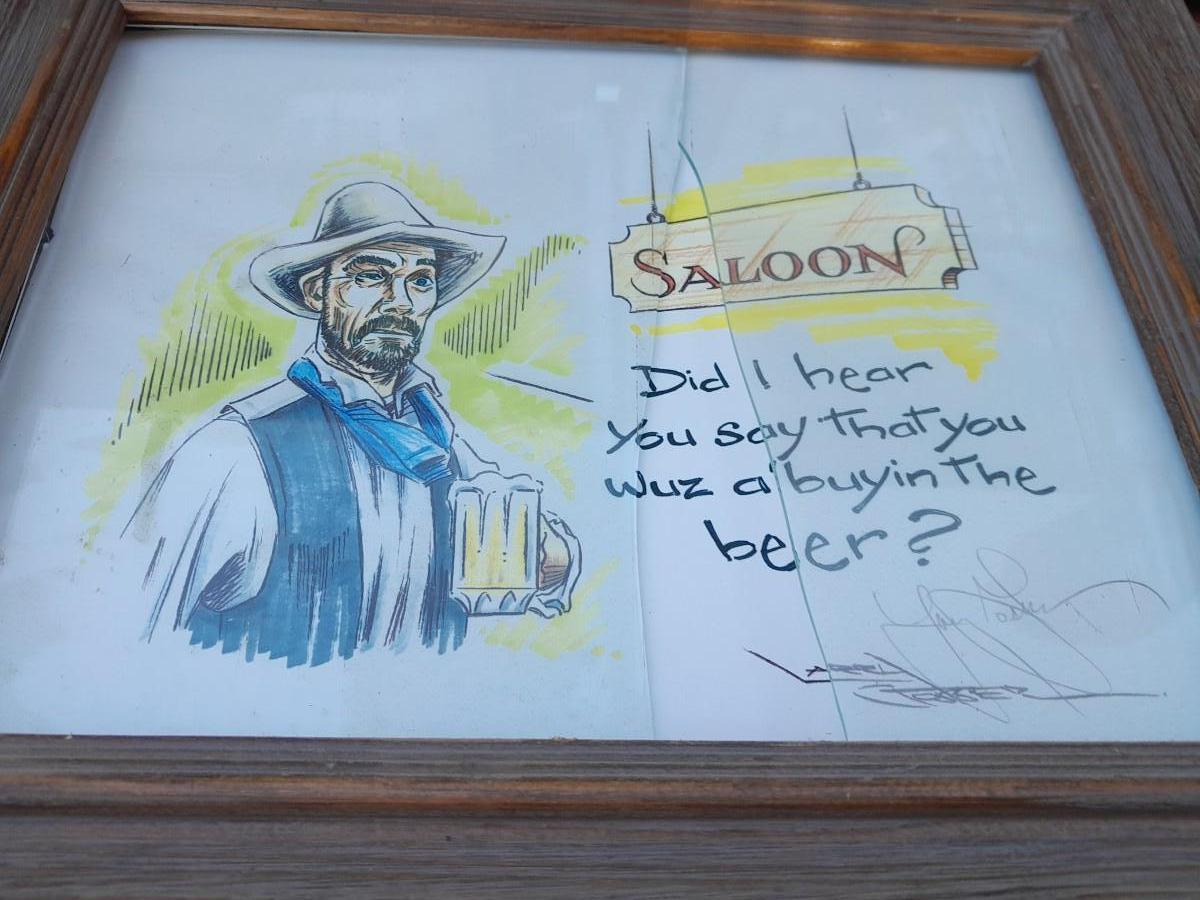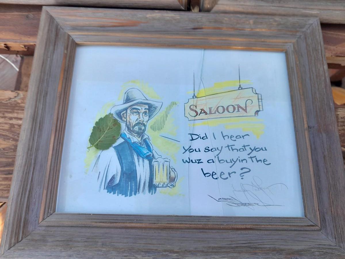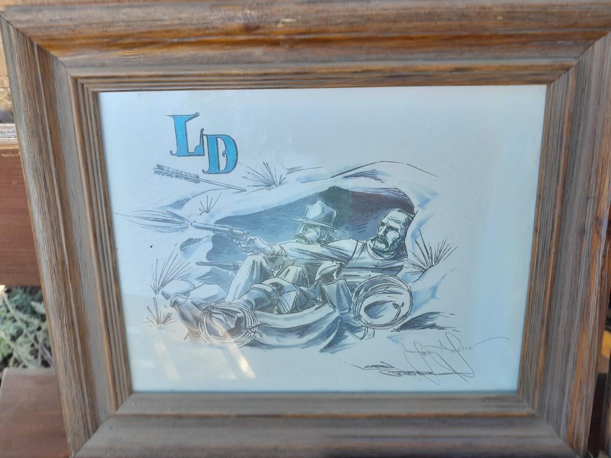 THREE RUSTIC FRAMED, SIGNED DRAWINGS (one has broken glass) BILLY THE KID, SALOON COWBOY, AND LD SHOOTING COWBOYS