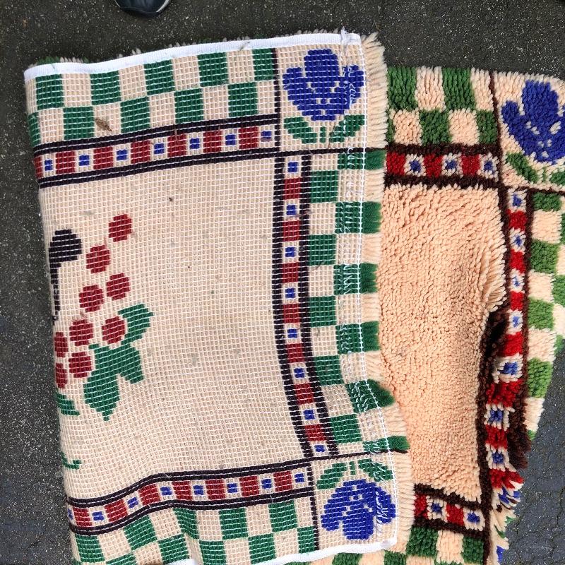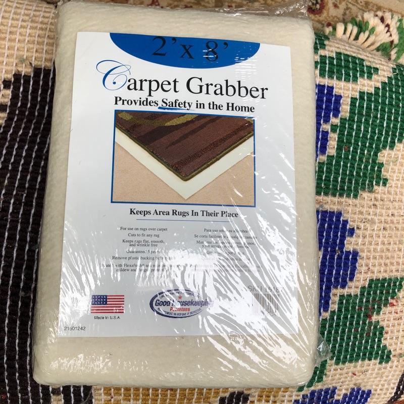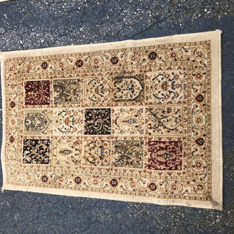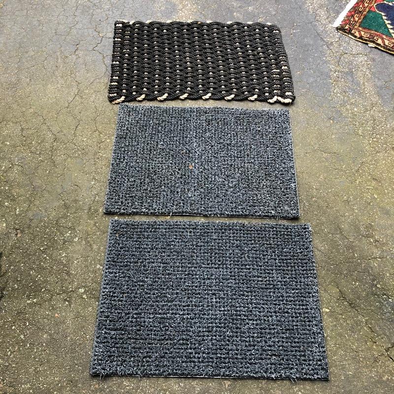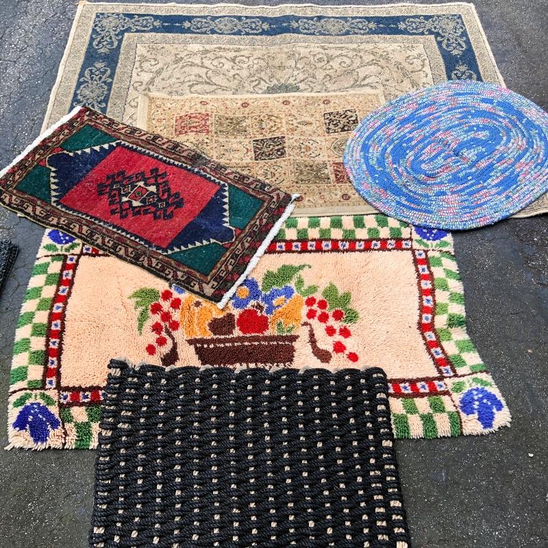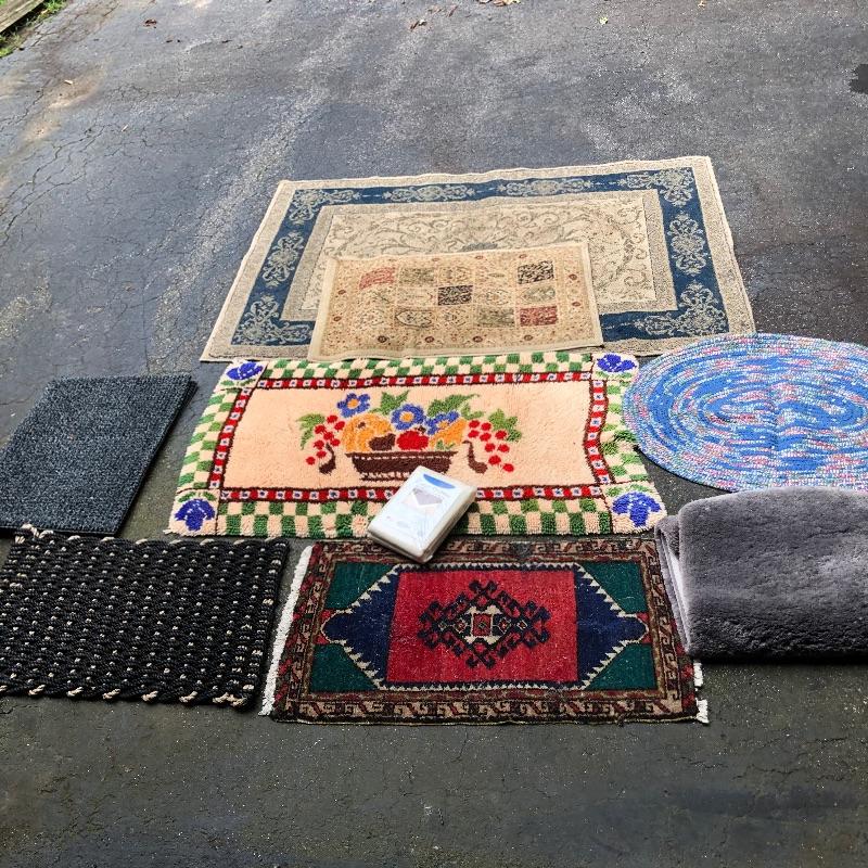 An assortment of both indoor and out door rugs in this useful lot. 3 outdoor doormats, a large grey bath mat (Just needs a good wash), are accompanied by 5 indoor rugs; these include a blue rag rug, two small rugs, (see in images the areas of damage to the green and red rug), a wool rug and the largest rug which is a small area rug in tan and blue. Also included is a 2’ x 8’ rug grabber that is new and still in packaging.