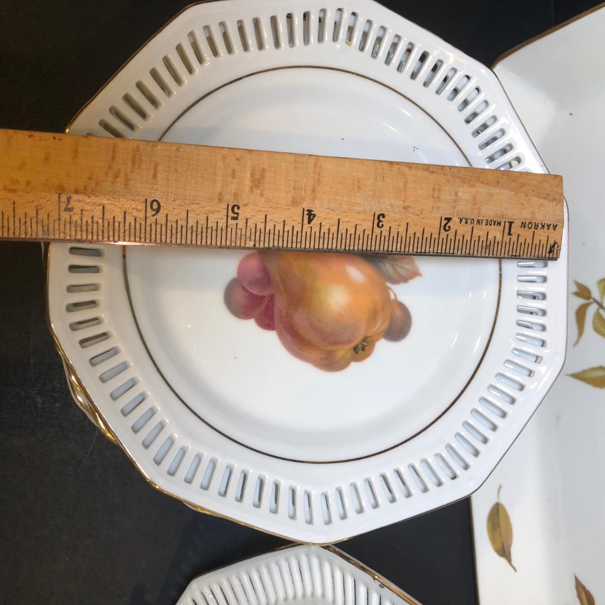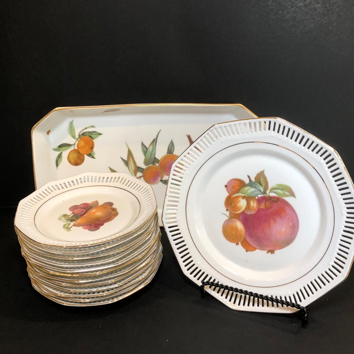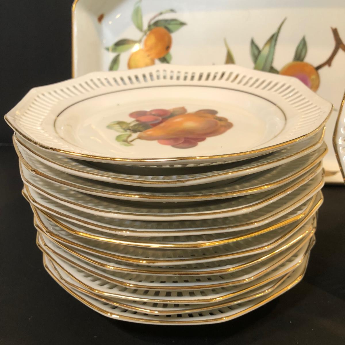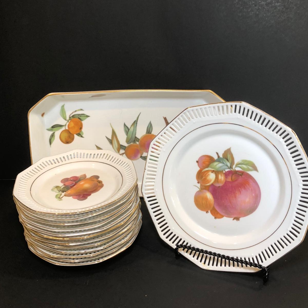 LOT 303K: 12 Vintage Schwarzenhammer Bavaria Fruit Cutout 7" Dessert Plates. 4 Matching 10" Dinner Plates & Royal Worcester Porcelain Tray