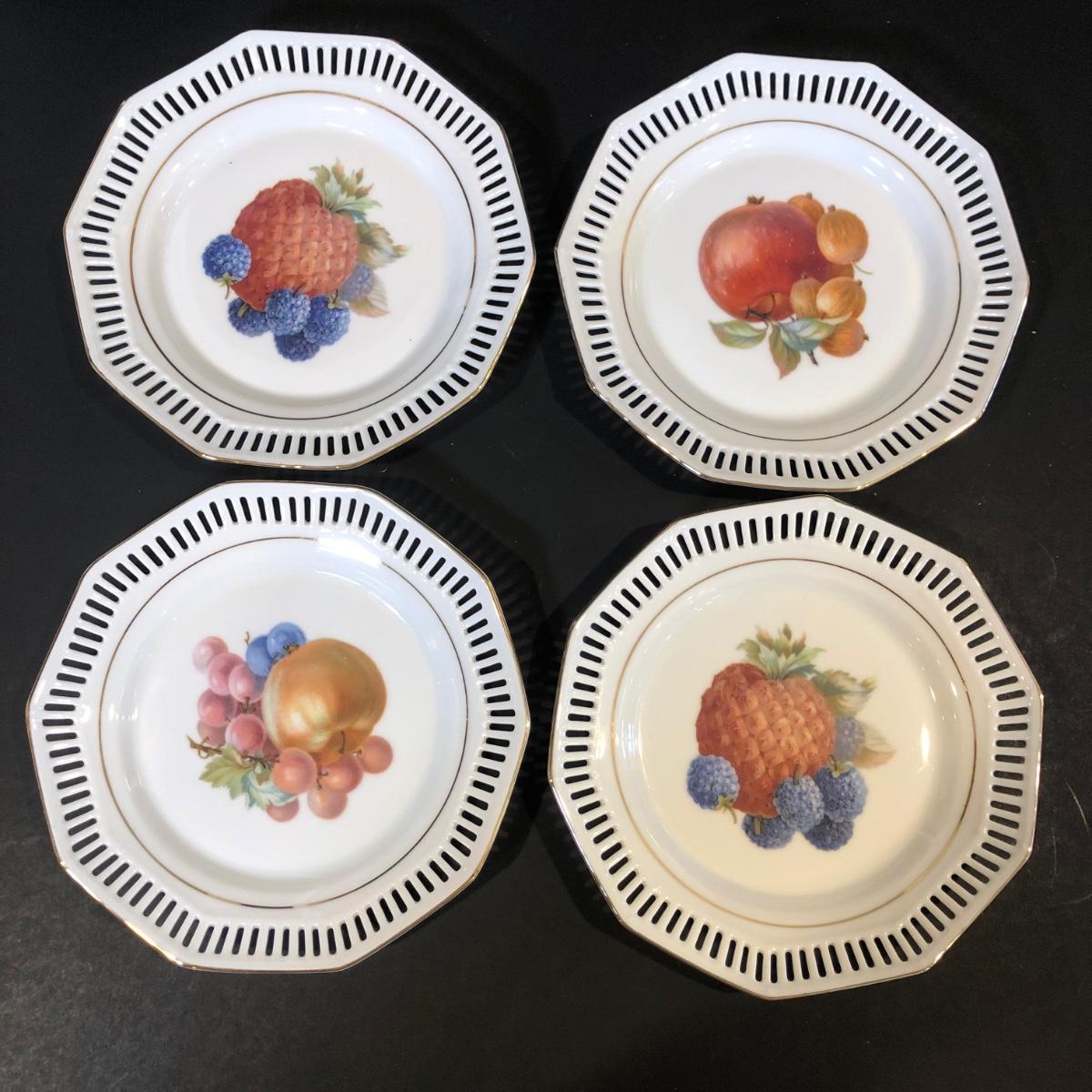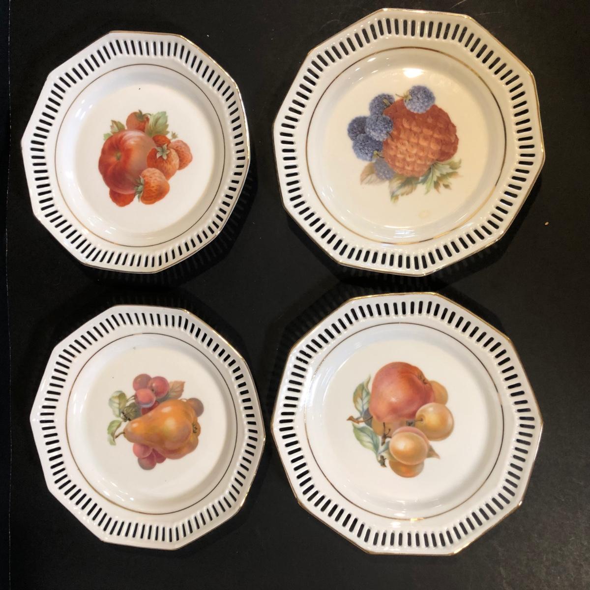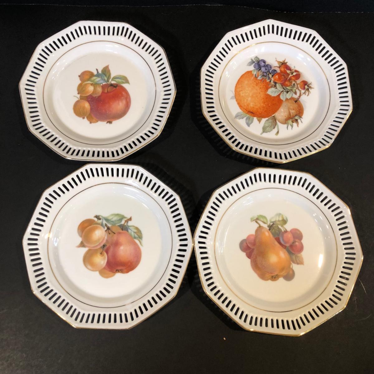LOT 303K: 12 Vintage Schwarzenhammer Bavaria Fruit Cutout 7" Dessert Plates. 4 Matching 10" Dinner Plates & Royal Worcester Porcelain Tray
