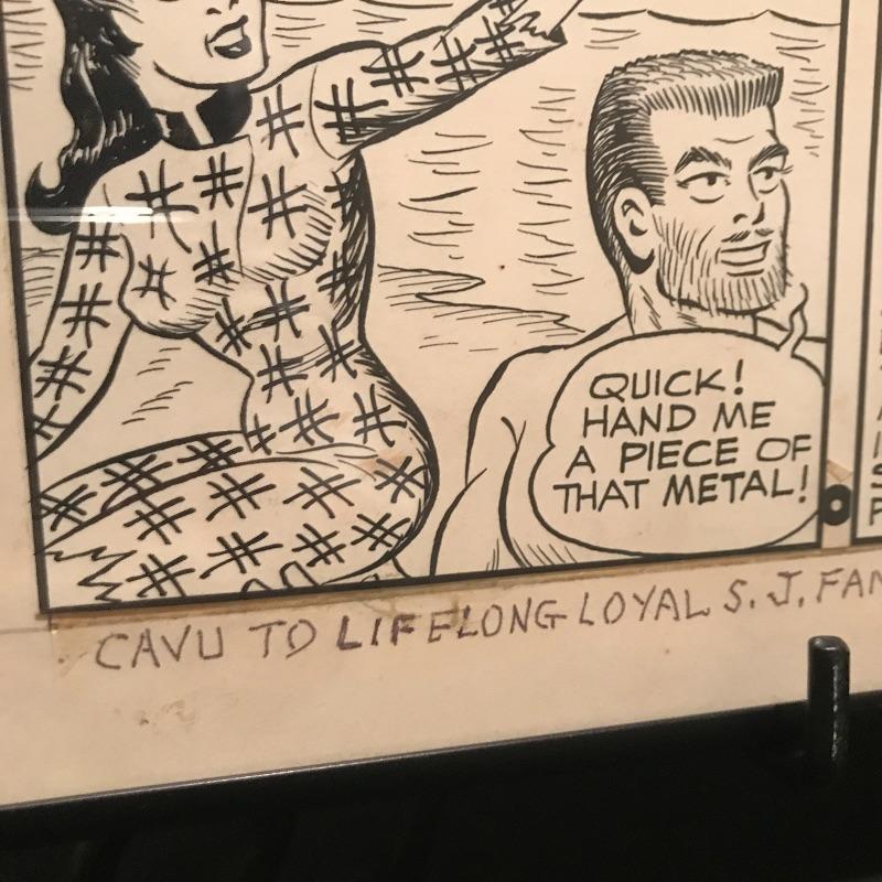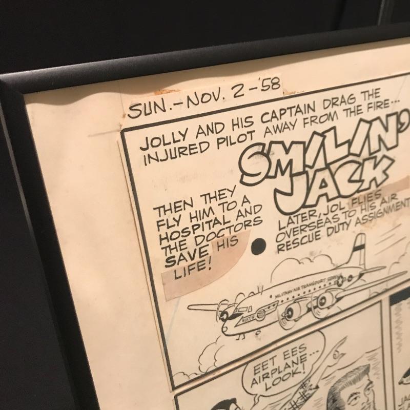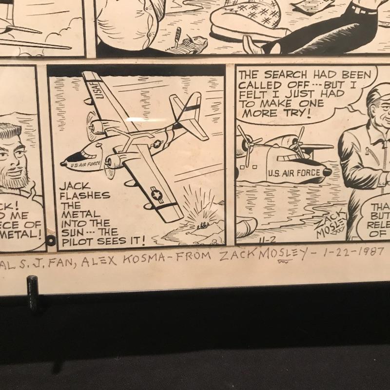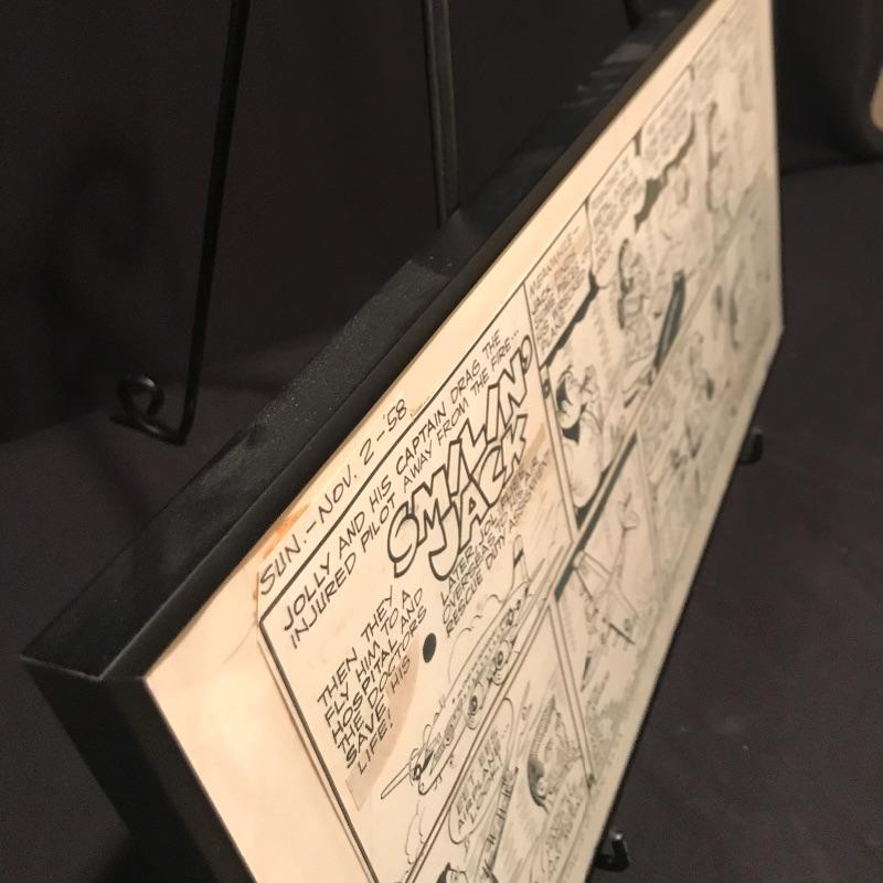 Similar to the artwork in Lot 303 and 305, this is a framed The Adventures of Smilin’ Jack comic original art panels framed and signed by Zack Mosley, the comic strip artist. The art is dated Nov. 2, 1958 and the signature is dated 1-22-87. There is some yellowing to the artwork from its age. Measures 22.5” x 11”. Shipping available.