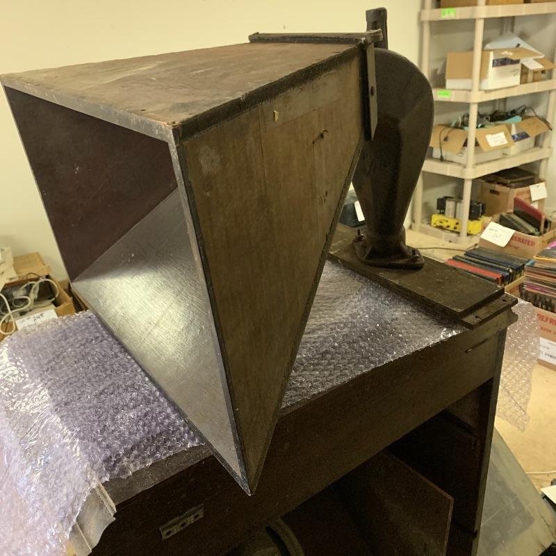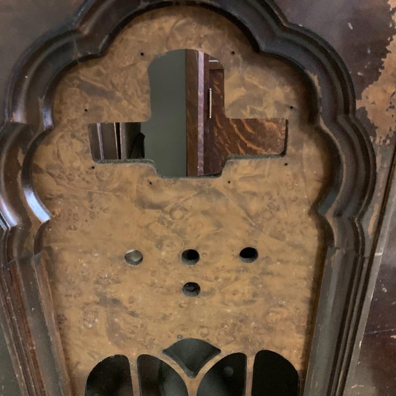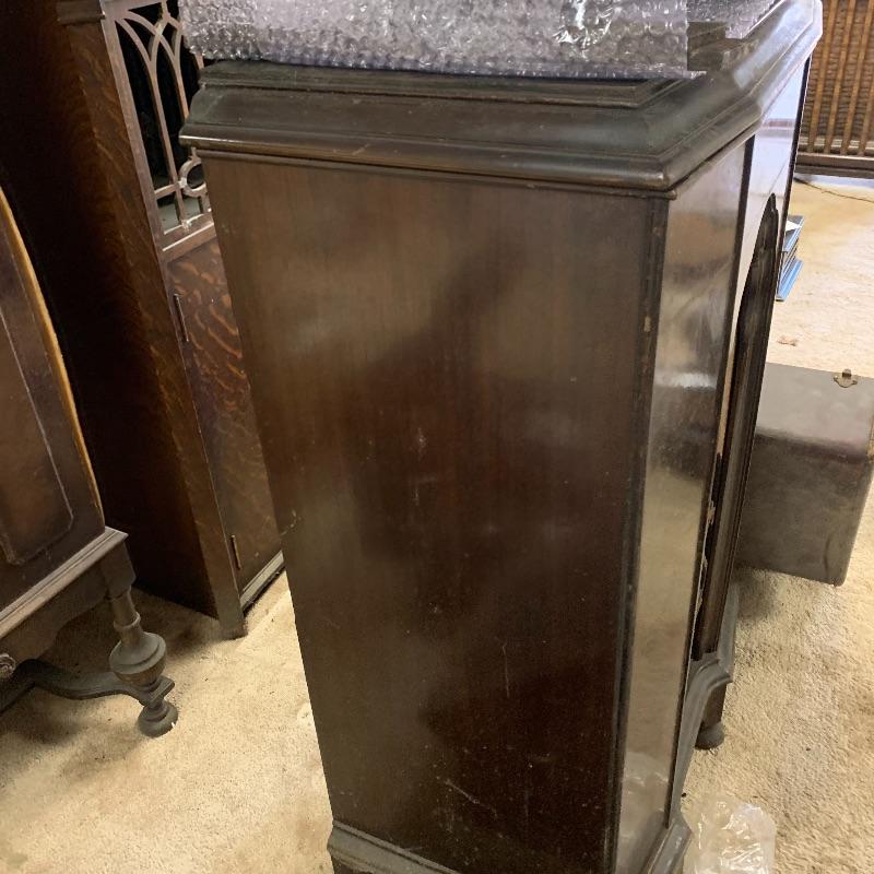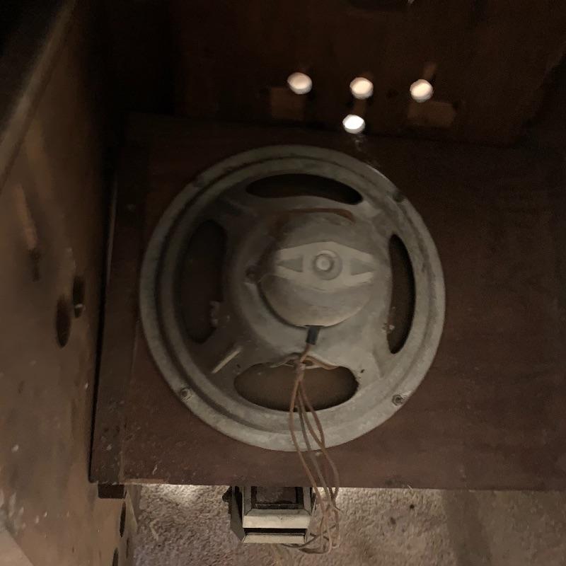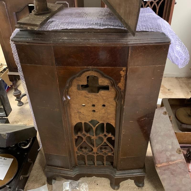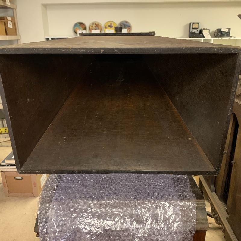 Floor tube radio cabinet and speaker. This cabinet measures 24” wide, 42” tall, and 14” deep. Cabinet comes with rectangular gramophone speaker. This unit could be easily repurposed into something else.