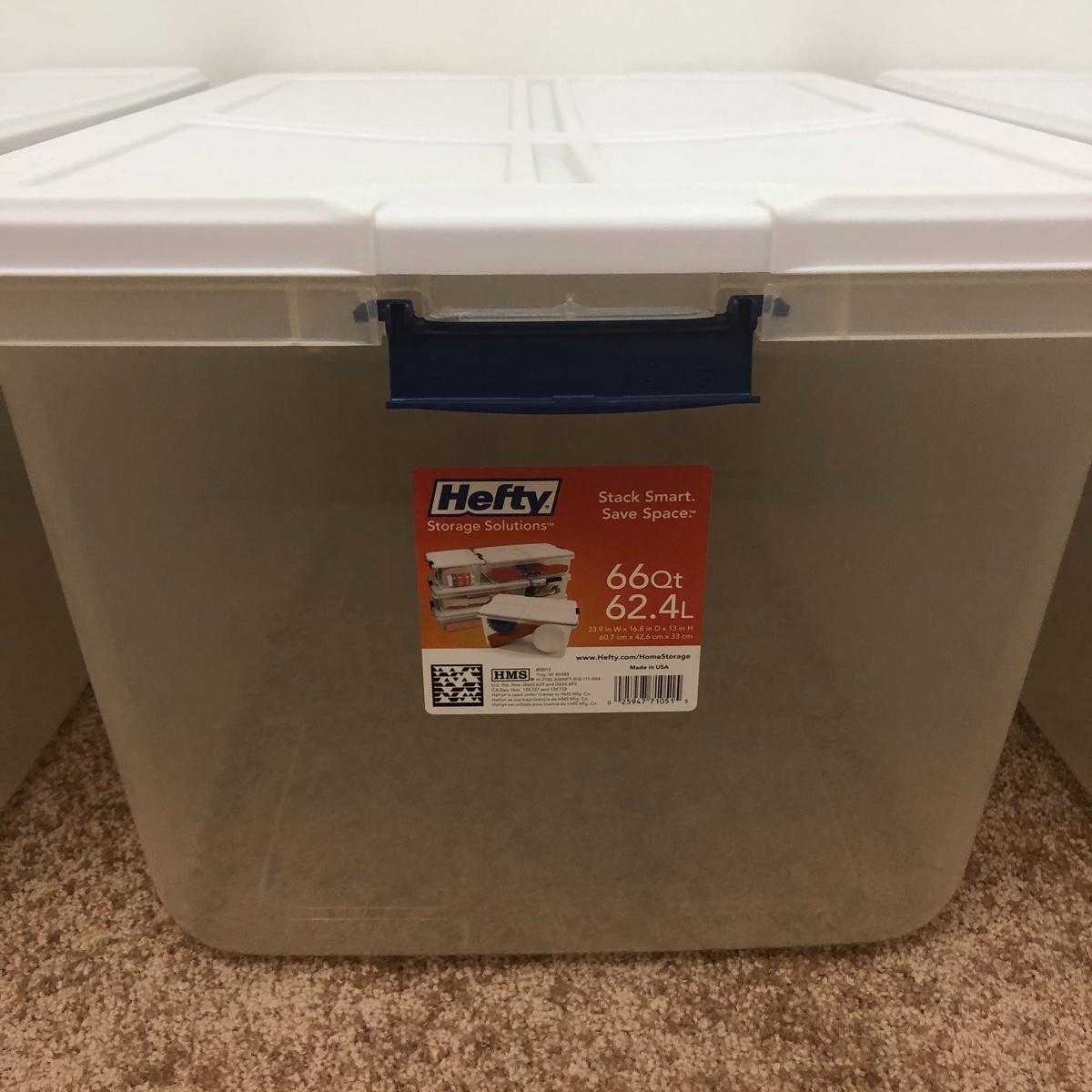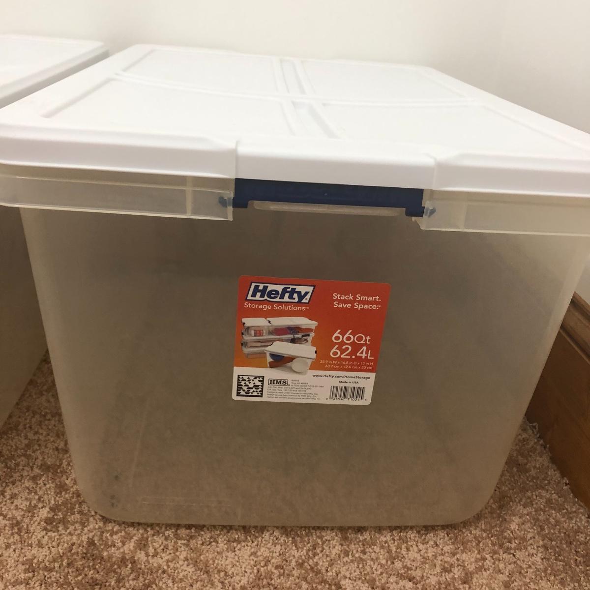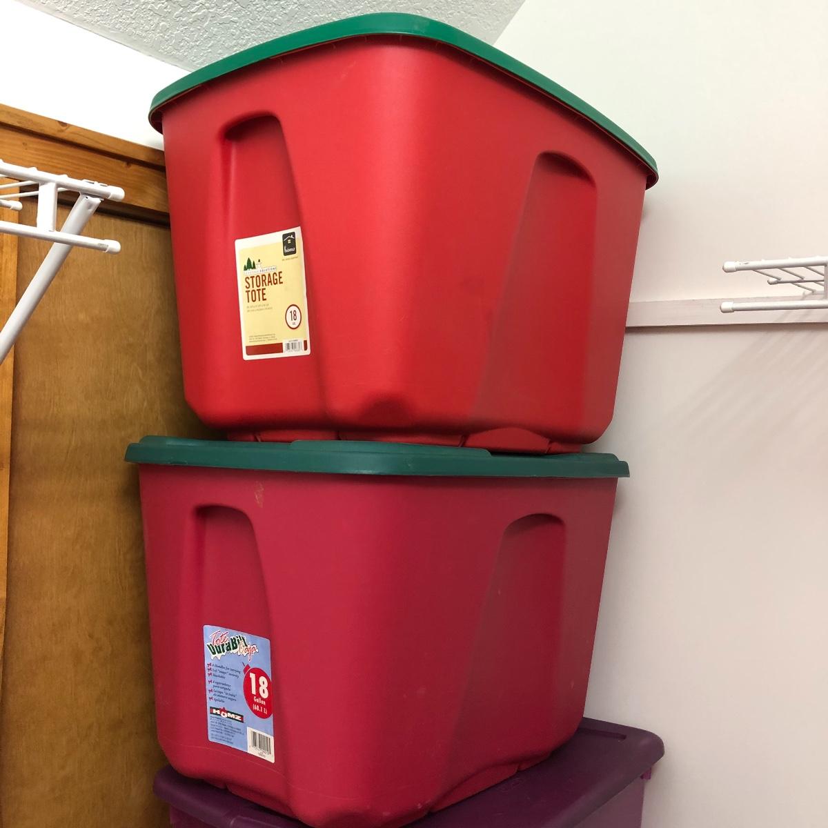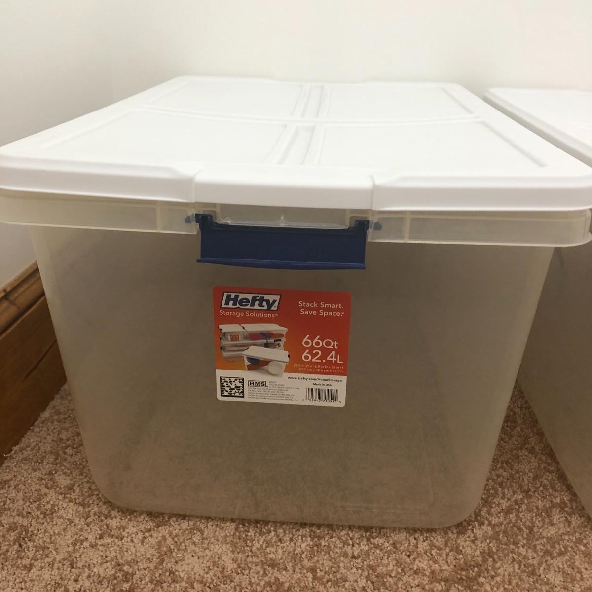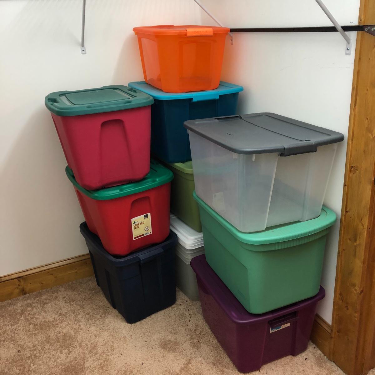 In this lot is a Sterlite 66 quart clear bottomed tote with a gray lid, a green Sterlite 20 gallon tote, a purple translucent bottomed Sterlite 66 quart tote, two 18 gallon Homz totes with a red body and green lid with one tote having darker colors than the other, a Rubbermaid roughneck 18 gallon dark blue tote, an orange translucent Bella 39 quart tote, a blue translucent Sterlite 66 quart tote, an 18 gallon sage green Rubbermaid tote, a cardboard ornament storage box, and lastly three clear 66 quart Hefty storage totes with white lids and blue latching handles. The three clear Hefty storage bins are 23.9” x 16.8” x 13”