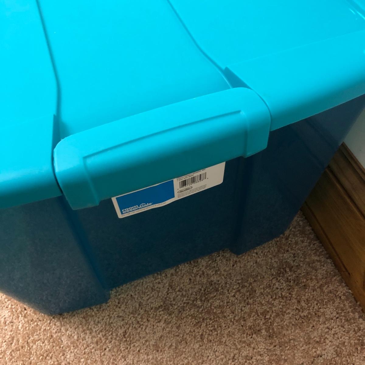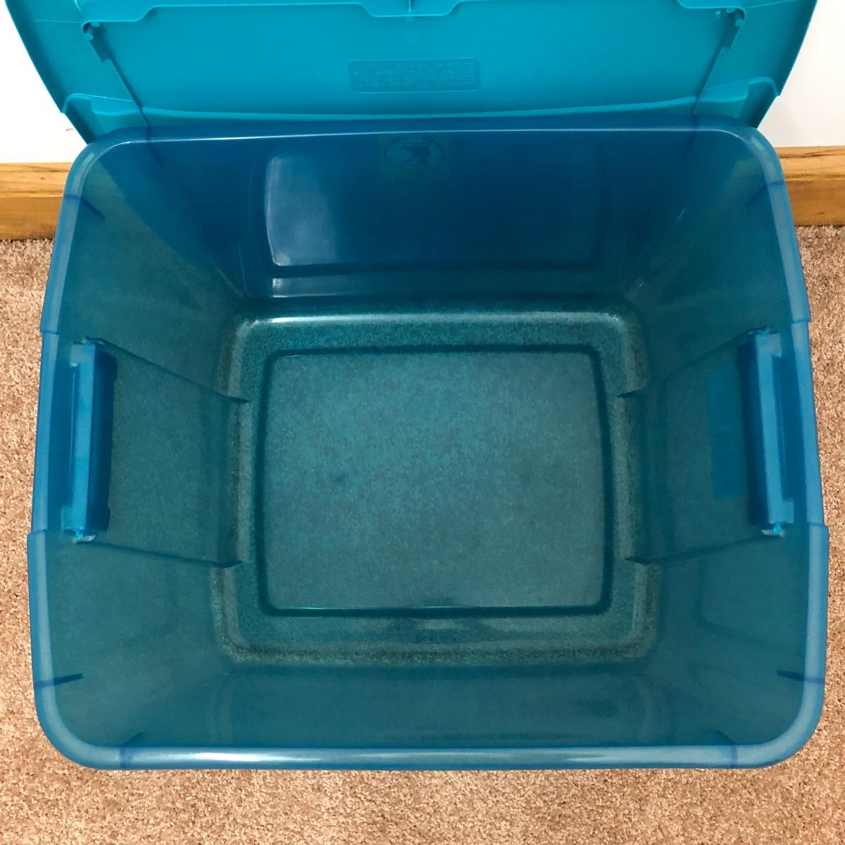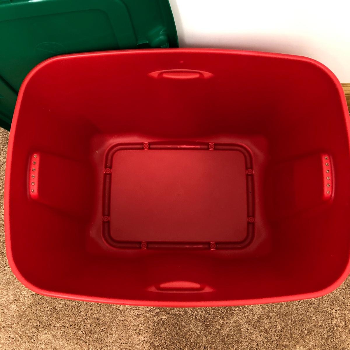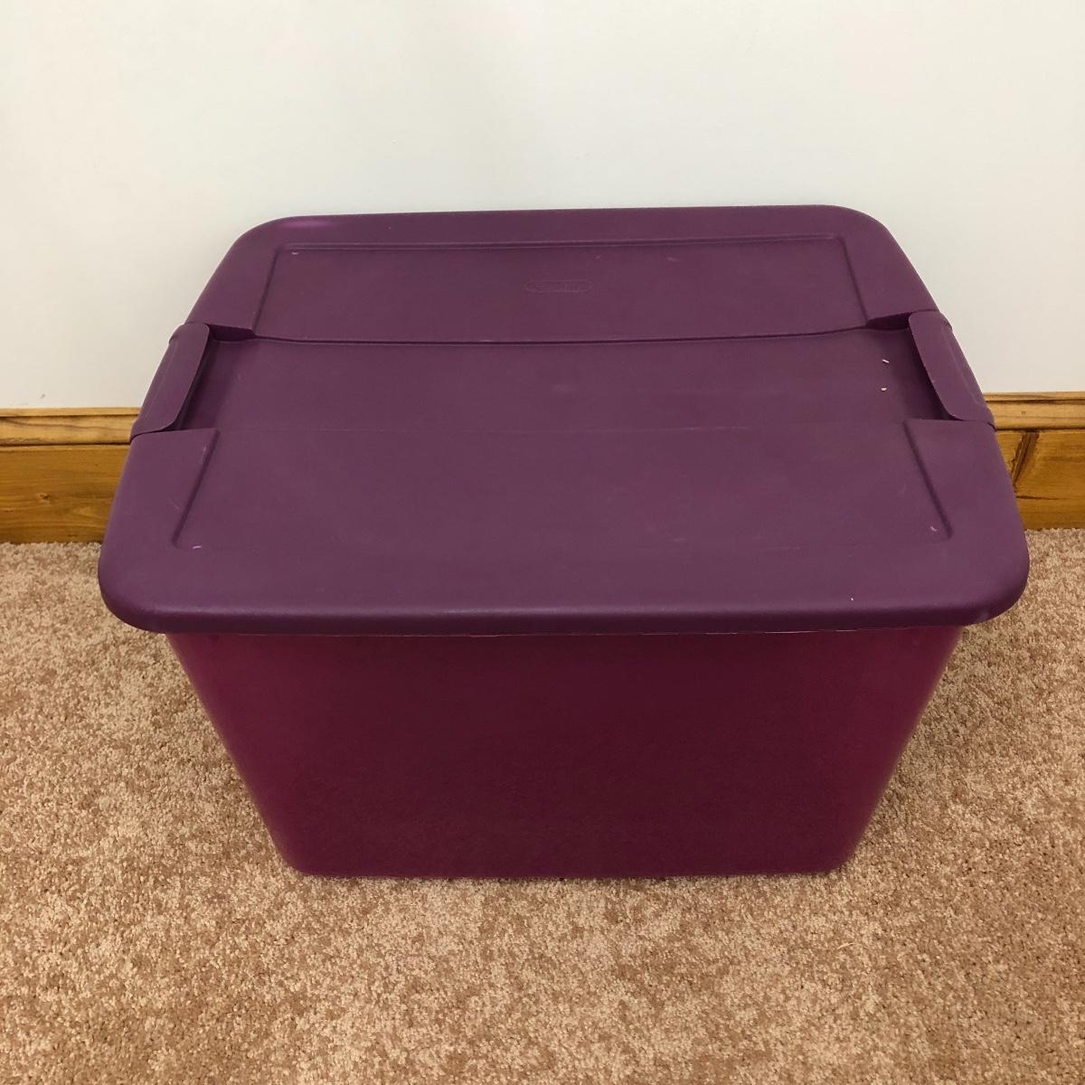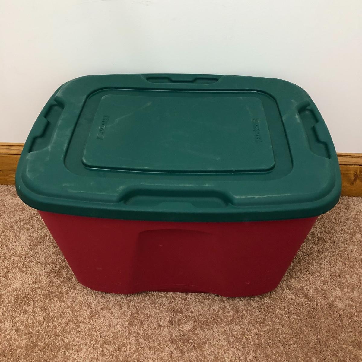 In this lot is a Sterlite 66 quart clear bottomed tote with a gray lid, a green Sterlite 20 gallon tote, a purple translucent bottomed Sterlite 66 quart tote, two 18 gallon Homz totes with a red body and green lid with one tote having darker colors than the other, a Rubbermaid roughneck 18 gallon dark blue tote, an orange translucent Bella 39 quart tote, a blue translucent Sterlite 66 quart tote, an 18 gallon sage green Rubbermaid tote, a cardboard ornament storage box, and lastly three clear 66 quart Hefty storage totes with white lids and blue latching handles. The three clear Hefty storage bins are 23.9” x 16.8” x 13”
