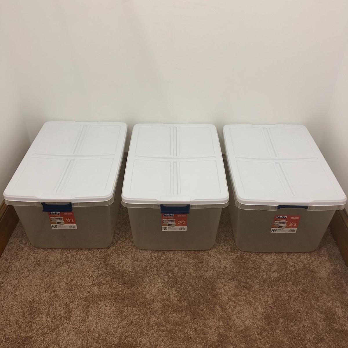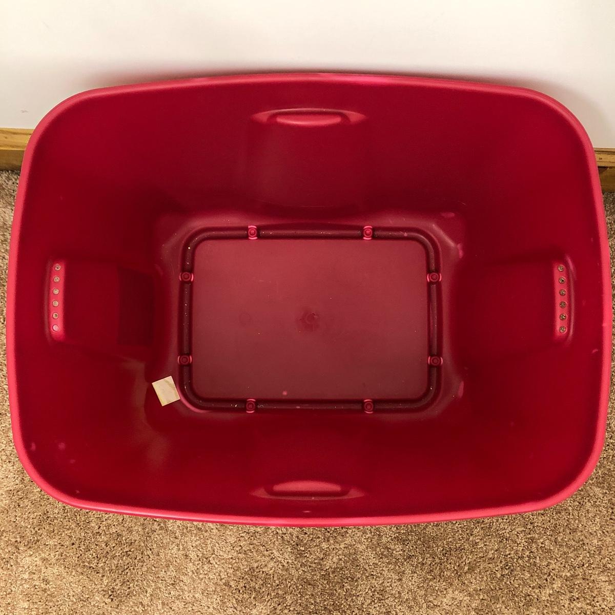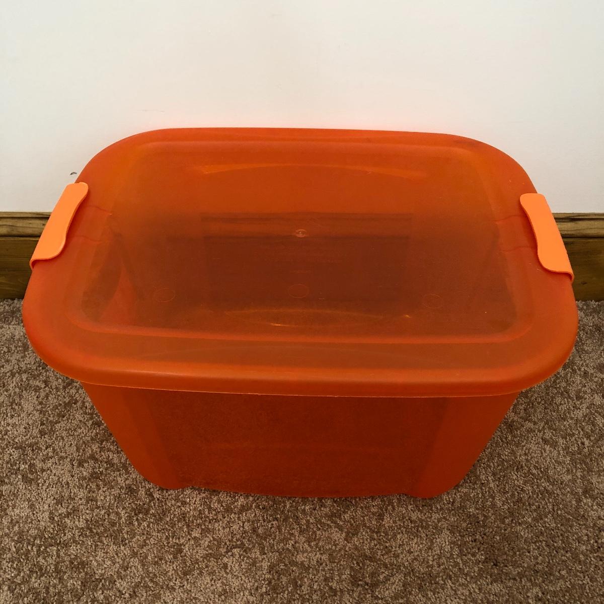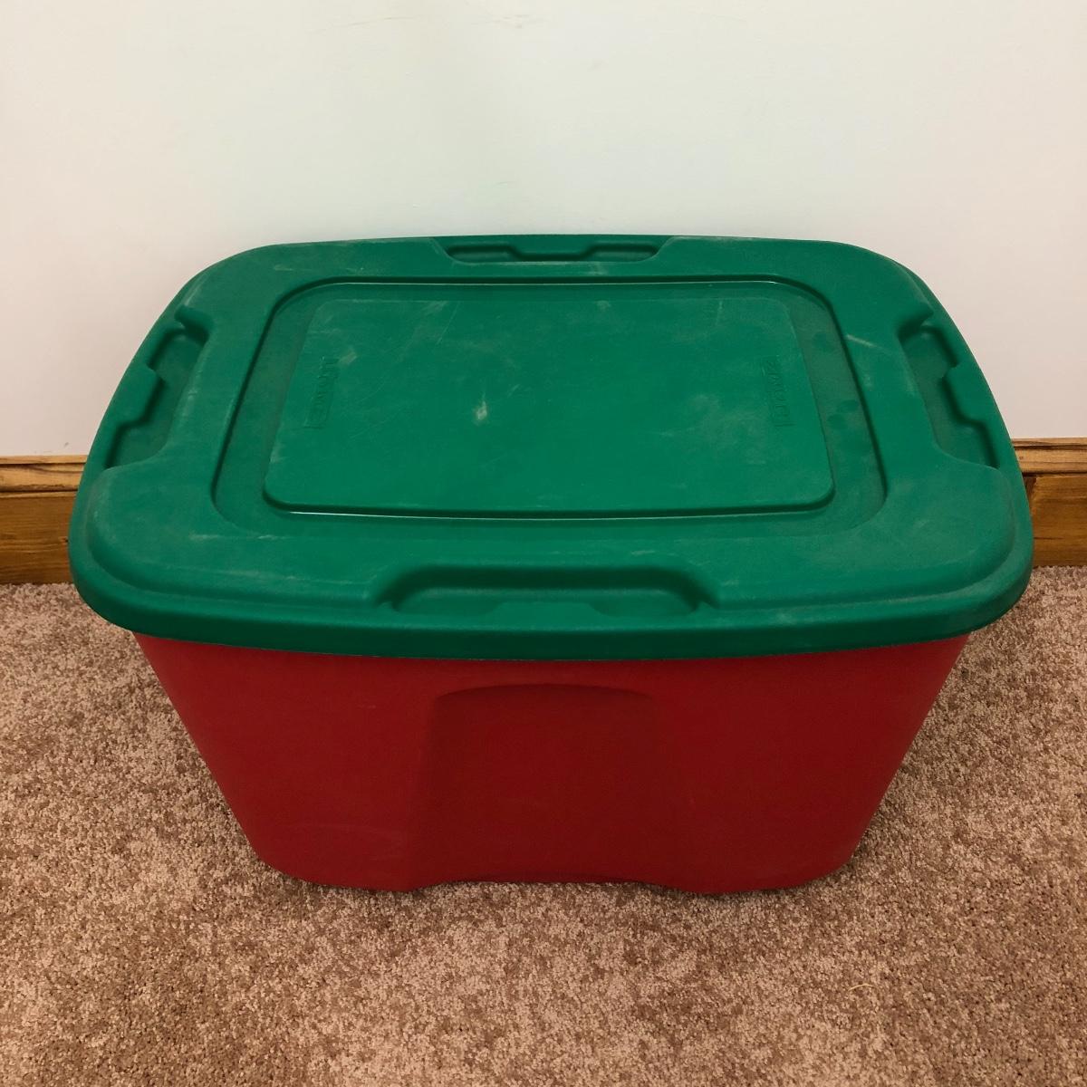 In this lot is a Sterlite 66 quart clear bottomed tote with a gray lid, a green Sterlite 20 gallon tote, a purple translucent bottomed Sterlite 66 quart tote, two 18 gallon Homz totes with a red body and green lid with one tote having darker colors than the other, a Rubbermaid roughneck 18 gallon dark blue tote, an orange translucent Bella 39 quart tote, a blue translucent Sterlite 66 quart tote, an 18 gallon sage green Rubbermaid tote, a cardboard ornament storage box, and lastly three clear 66 quart Hefty storage totes with white lids and blue latching handles. The three clear Hefty storage bins are 23.9” x 16.8” x 13”