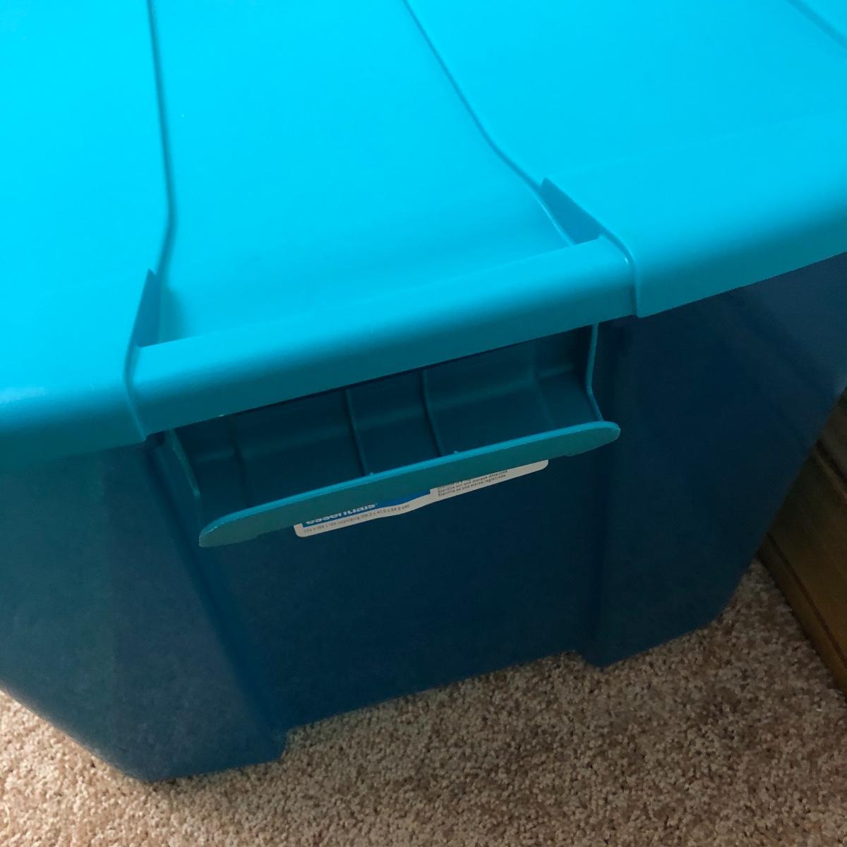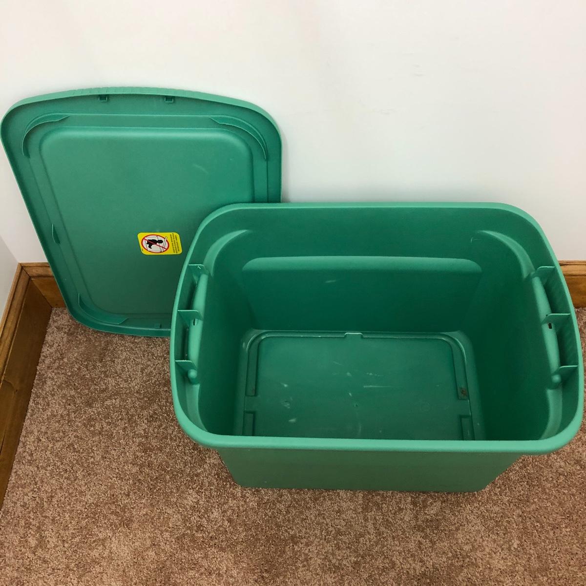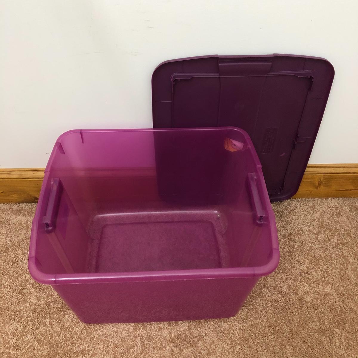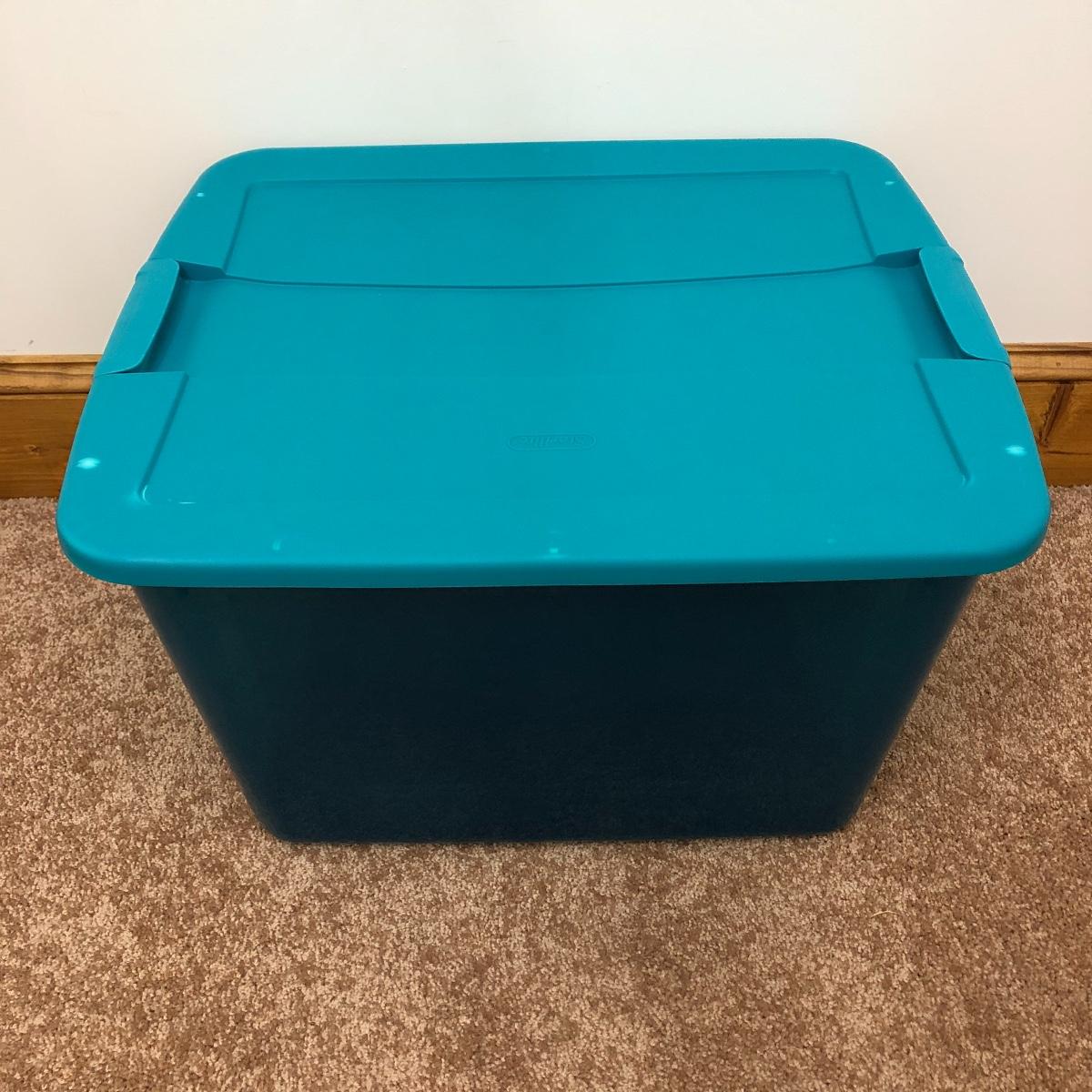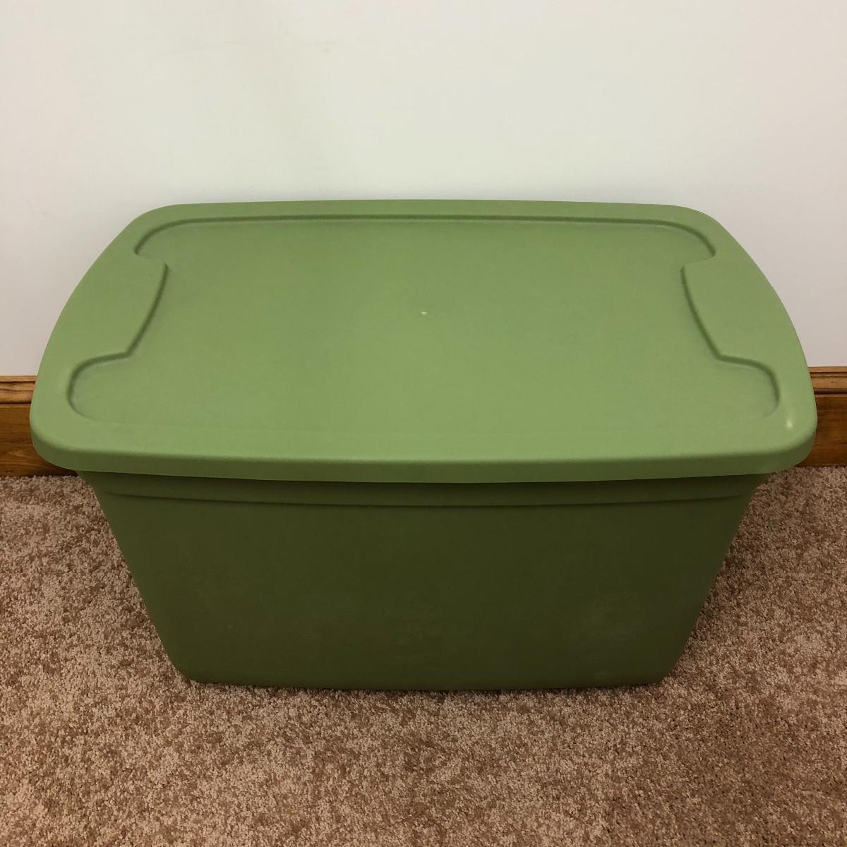 In this lot is a Sterlite 66 quart clear bottomed tote with a gray lid, a green Sterlite 20 gallon tote, a purple translucent bottomed Sterlite 66 quart tote, two 18 gallon Homz totes with a red body and green lid with one tote having darker colors than the other, a Rubbermaid roughneck 18 gallon dark blue tote, an orange translucent Bella 39 quart tote, a blue translucent Sterlite 66 quart tote, an 18 gallon sage green Rubbermaid tote, a cardboard ornament storage box, and lastly three clear 66 quart Hefty storage totes with white lids and blue latching handles. The three clear Hefty storage bins are 23.9” x 16.8” x 13”