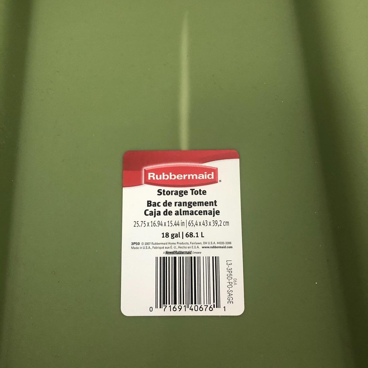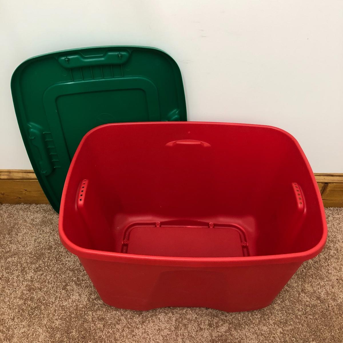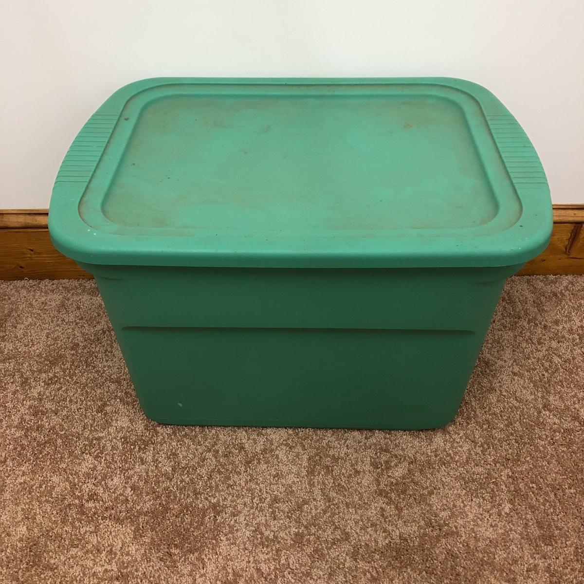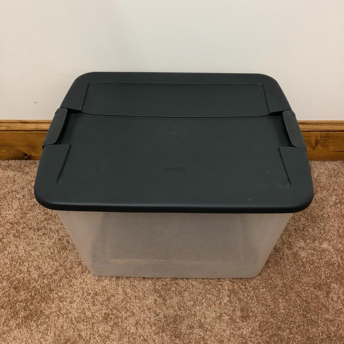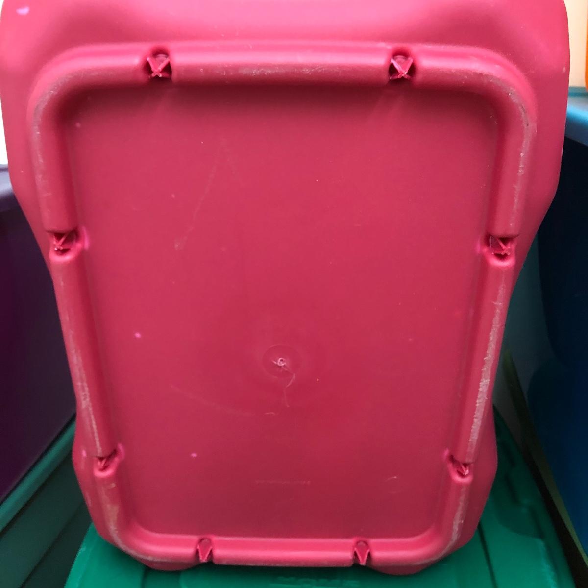 In this lot is a Sterlite 66 quart clear bottomed tote with a gray lid, a green Sterlite 20 gallon tote, a purple translucent bottomed Sterlite 66 quart tote, two 18 gallon Homz totes with a red body and green lid with one tote having darker colors than the other, a Rubbermaid roughneck 18 gallon dark blue tote, an orange translucent Bella 39 quart tote, a blue translucent Sterlite 66 quart tote, an 18 gallon sage green Rubbermaid tote, a cardboard ornament storage box, and lastly three clear 66 quart Hefty storage totes with white lids and blue latching handles. The three clear Hefty storage bins are 23.9” x 16.8” x 13”