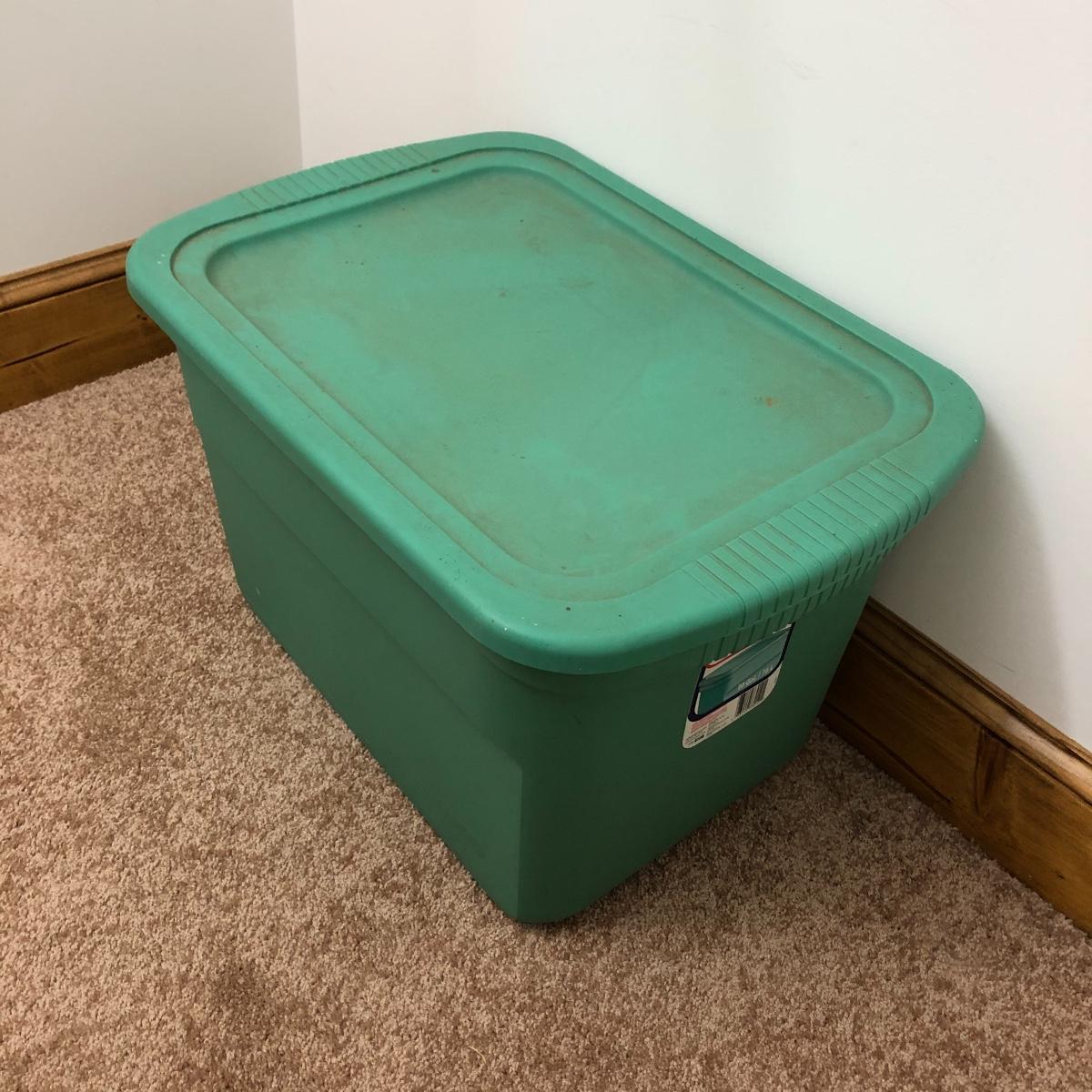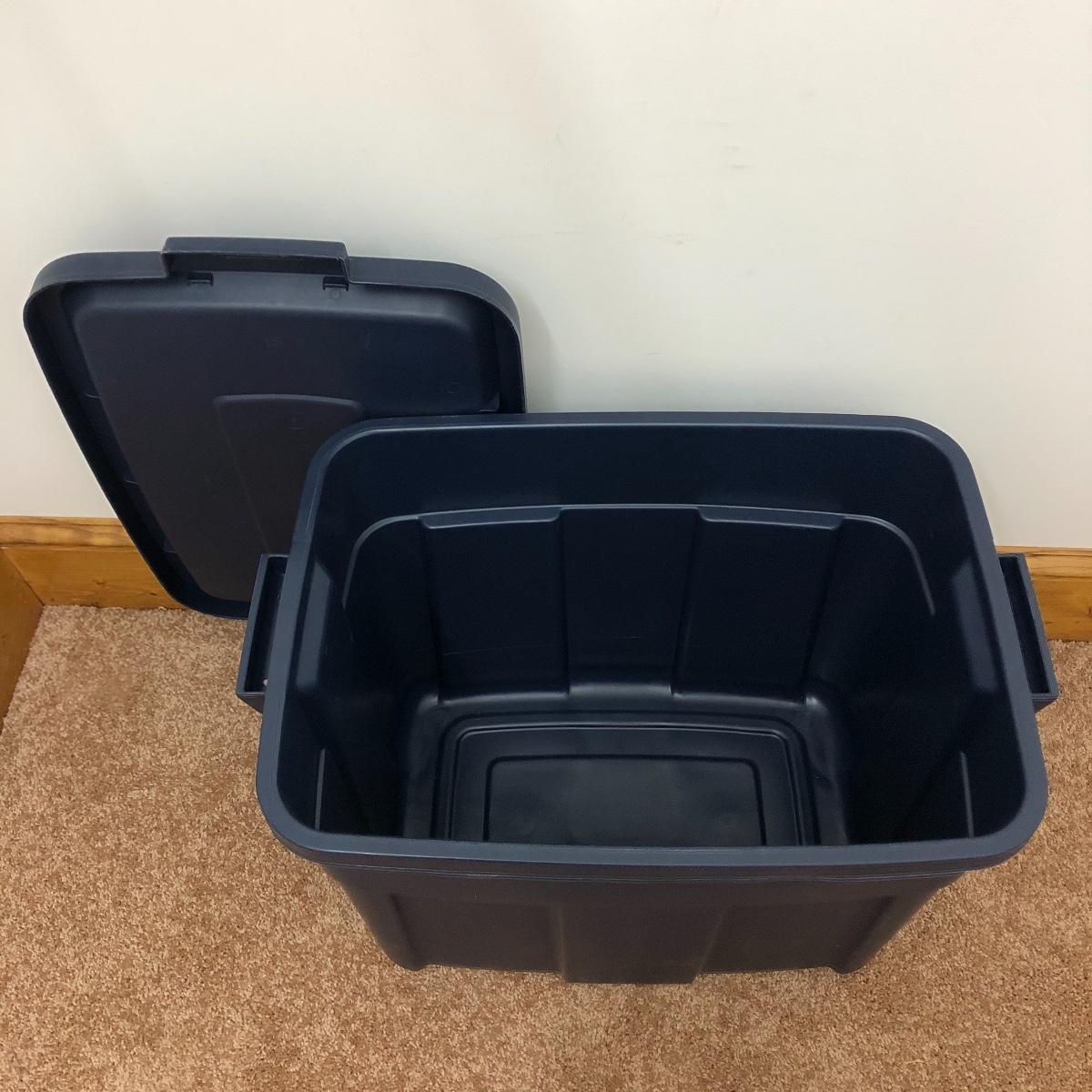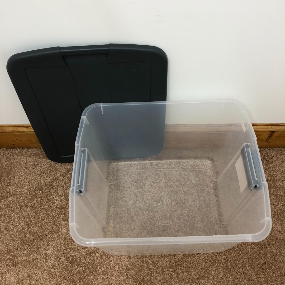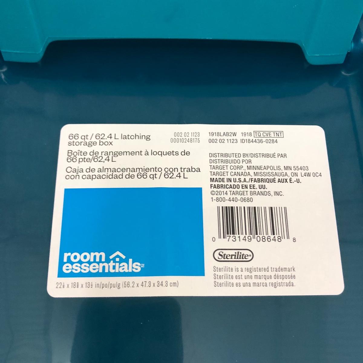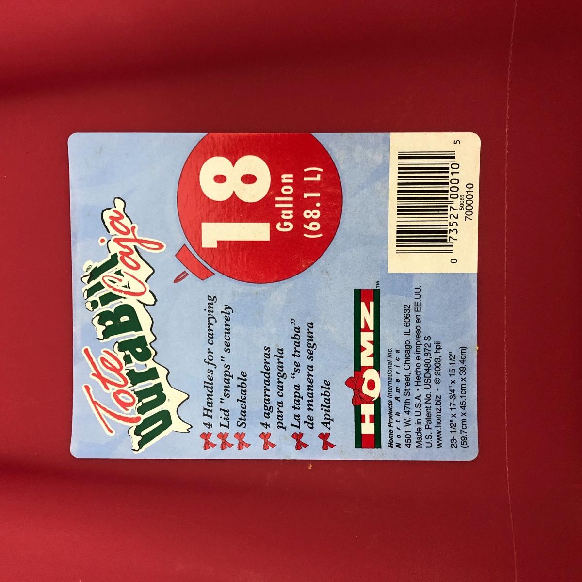 In this lot is a Sterlite 66 quart clear bottomed tote with a gray lid, a green Sterlite 20 gallon tote, a purple translucent bottomed Sterlite 66 quart tote, two 18 gallon Homz totes with a red body and green lid with one tote having darker colors than the other, a Rubbermaid roughneck 18 gallon dark blue tote, an orange translucent Bella 39 quart tote, a blue translucent Sterlite 66 quart tote, an 18 gallon sage green Rubbermaid tote, a cardboard ornament storage box, and lastly three clear 66 quart Hefty storage totes with white lids and blue latching handles. The three clear Hefty storage bins are 23.9” x 16.8” x 13”