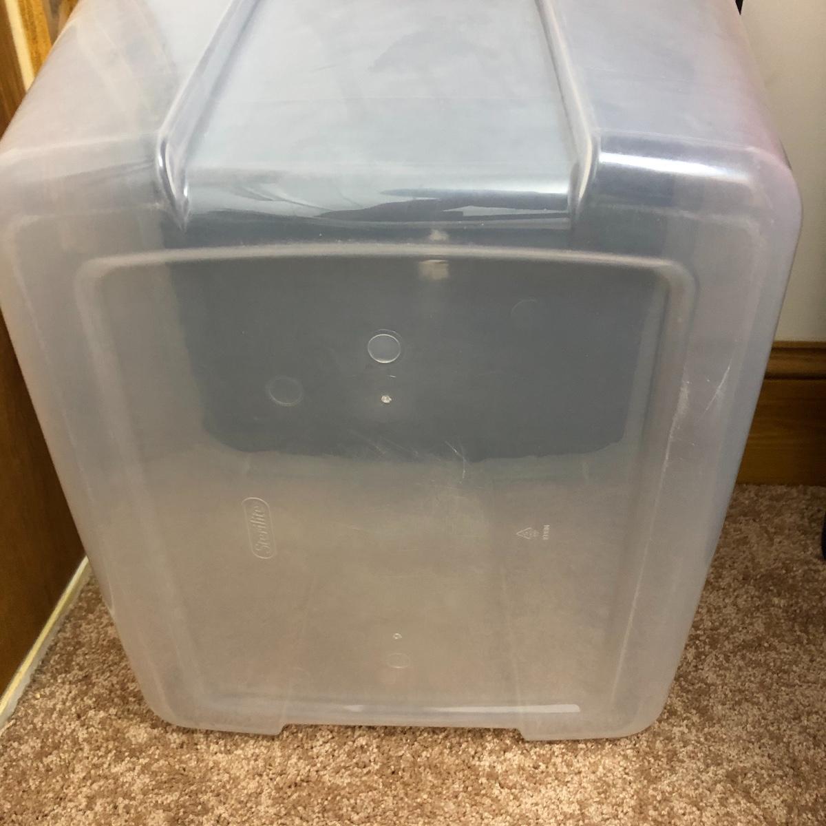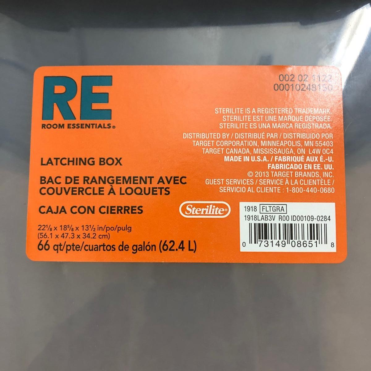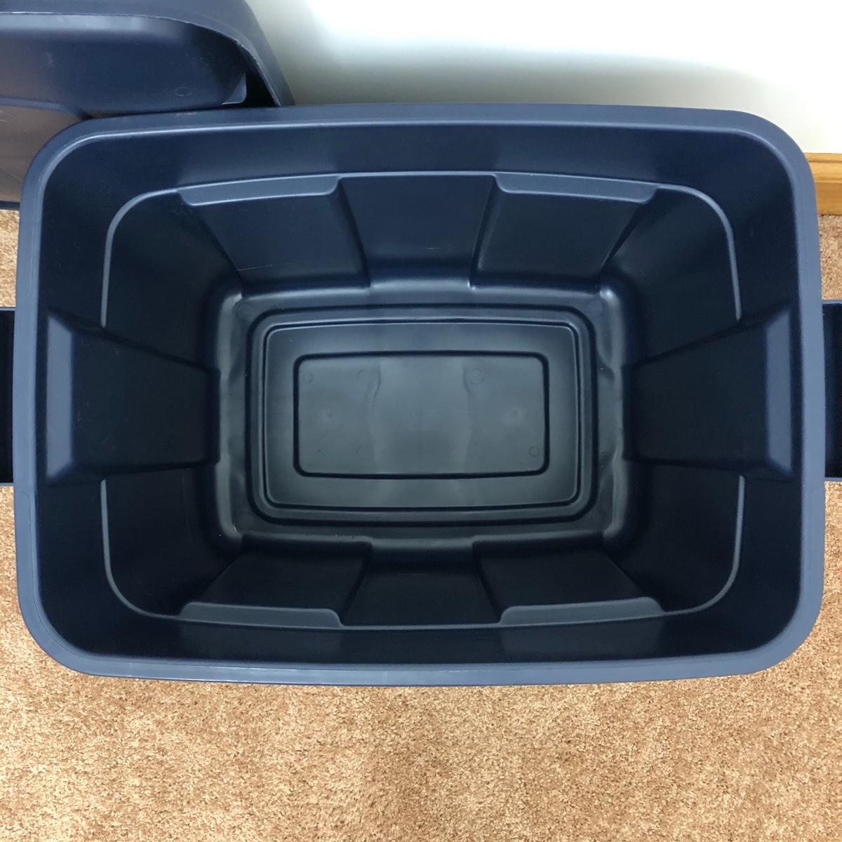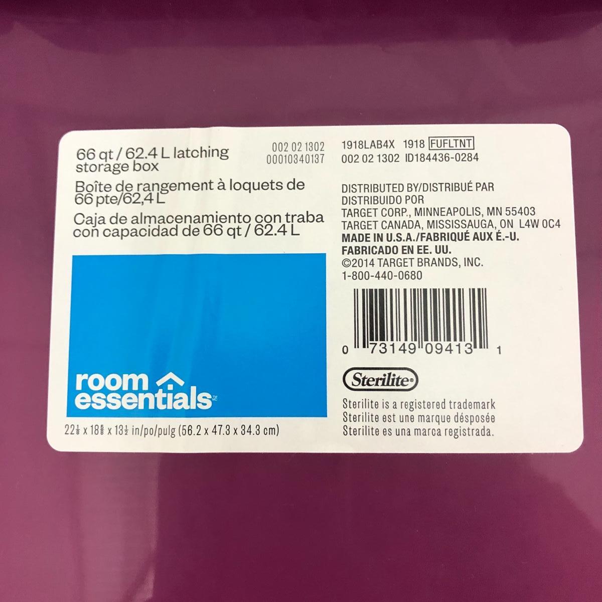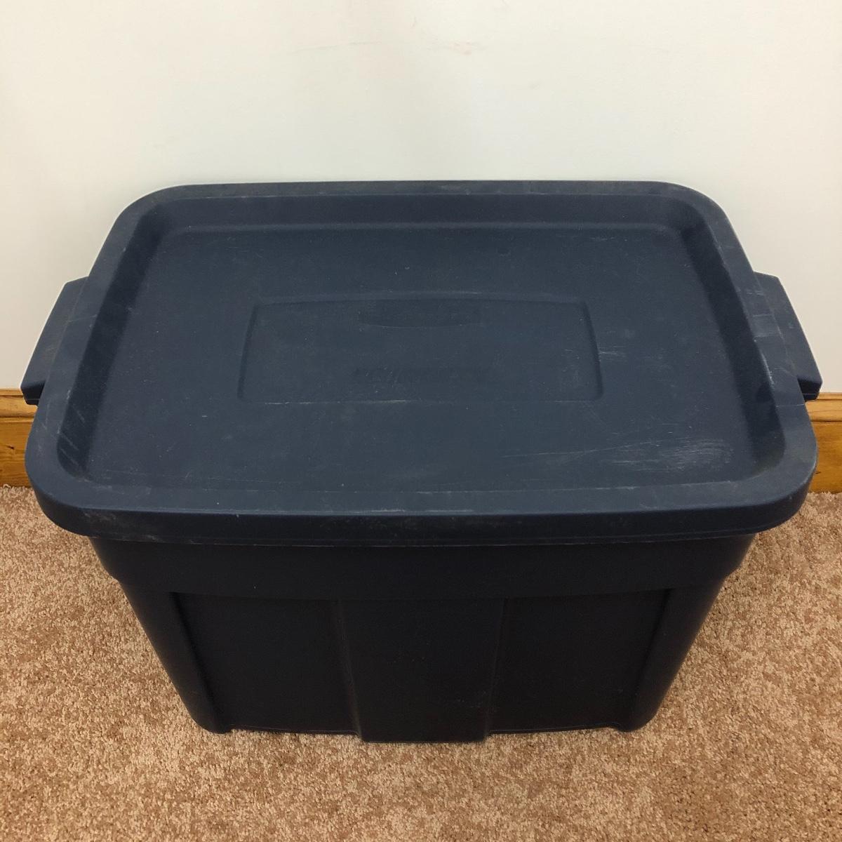 In this lot is a Sterlite 66 quart clear bottomed tote with a gray lid, a green Sterlite 20 gallon tote, a purple translucent bottomed Sterlite 66 quart tote, two 18 gallon Homz totes with a red body and green lid with one tote having darker colors than the other, a Rubbermaid roughneck 18 gallon dark blue tote, an orange translucent Bella 39 quart tote, a blue translucent Sterlite 66 quart tote, an 18 gallon sage green Rubbermaid tote, a cardboard ornament storage box, and lastly three clear 66 quart Hefty storage totes with white lids and blue latching handles. The three clear Hefty storage bins are 23.9” x 16.8” x 13”