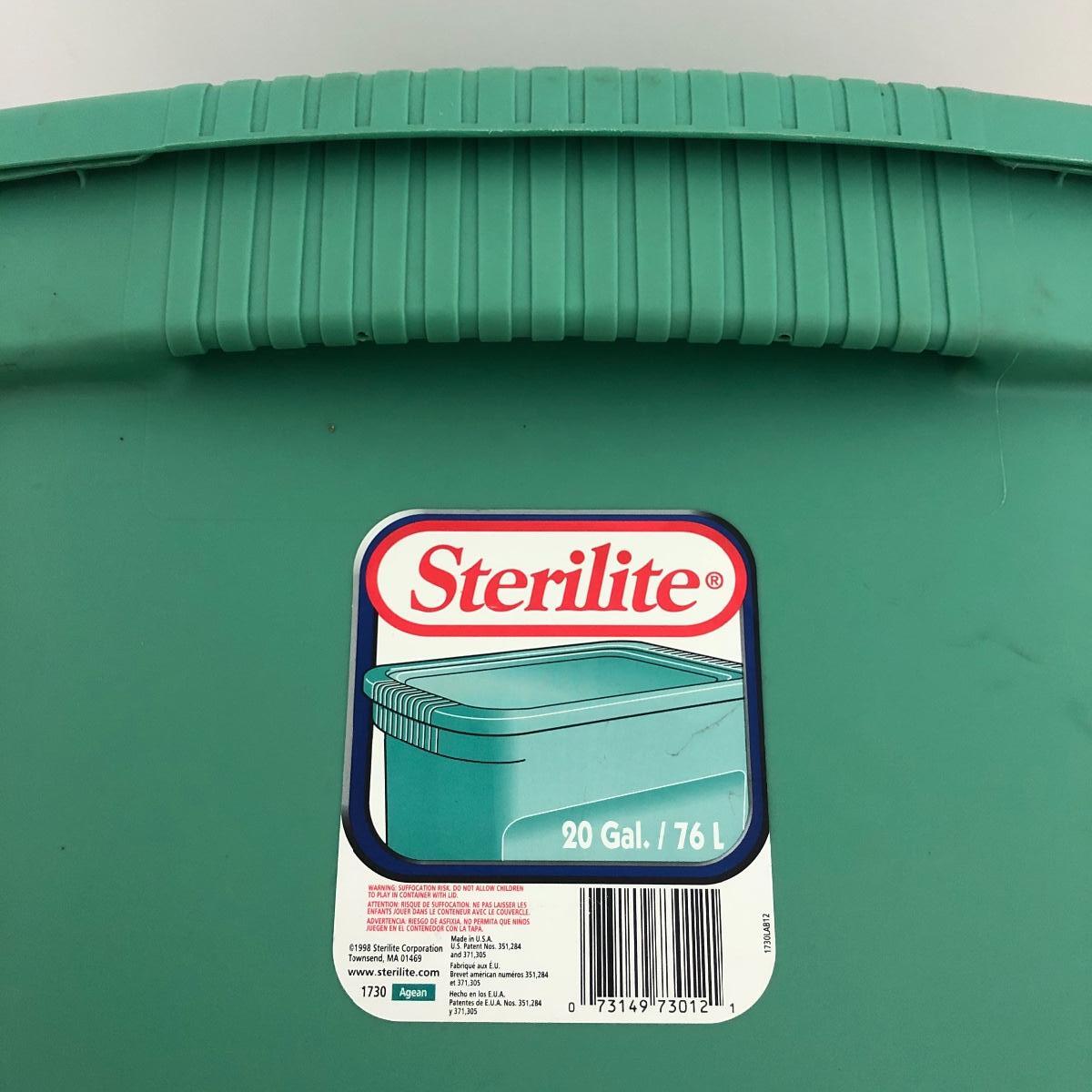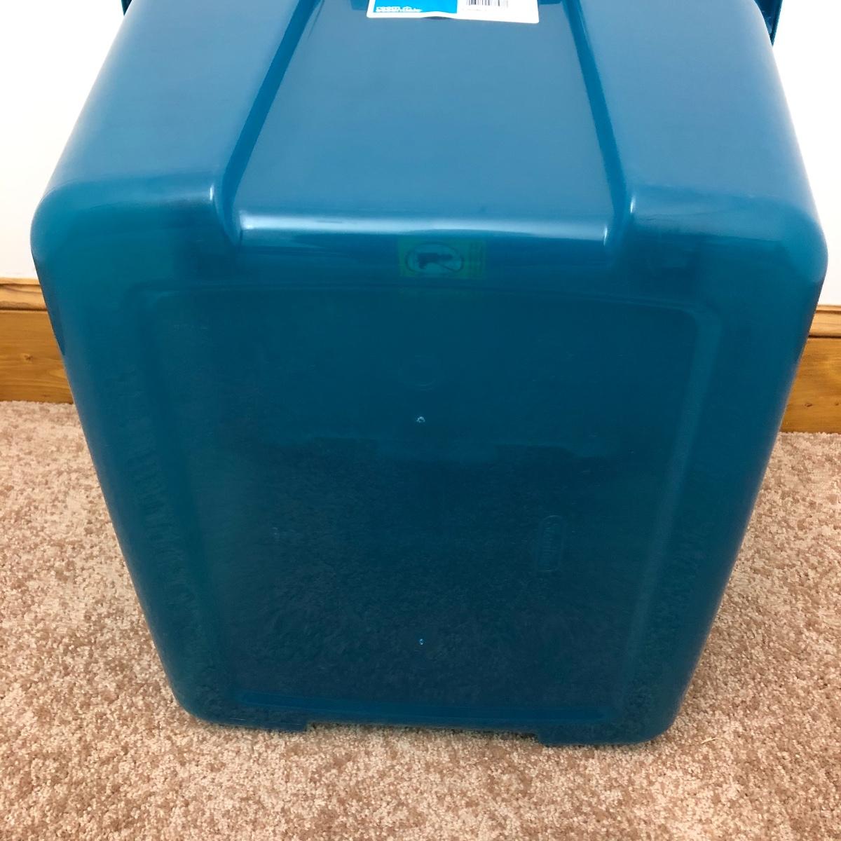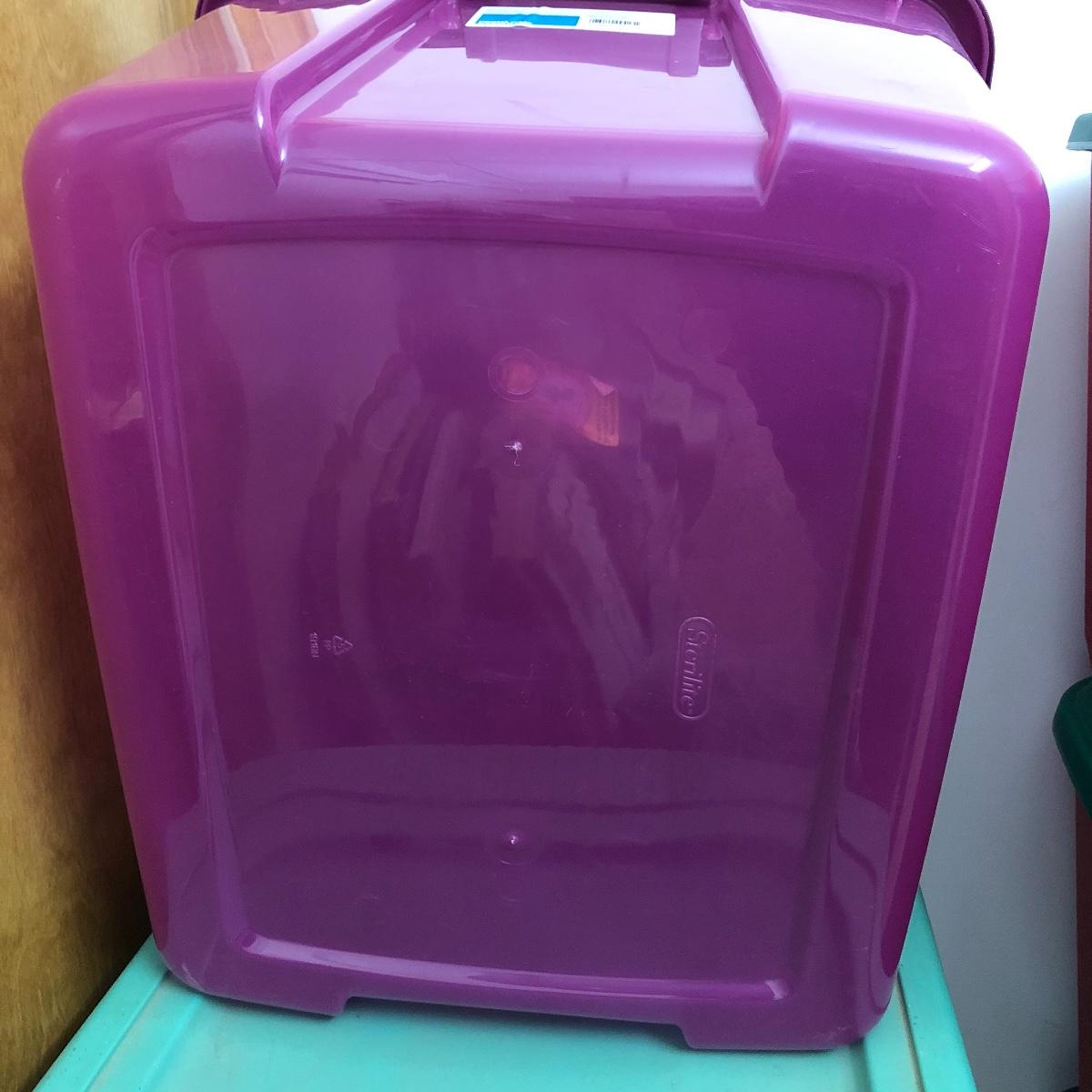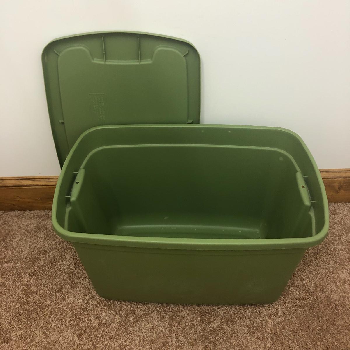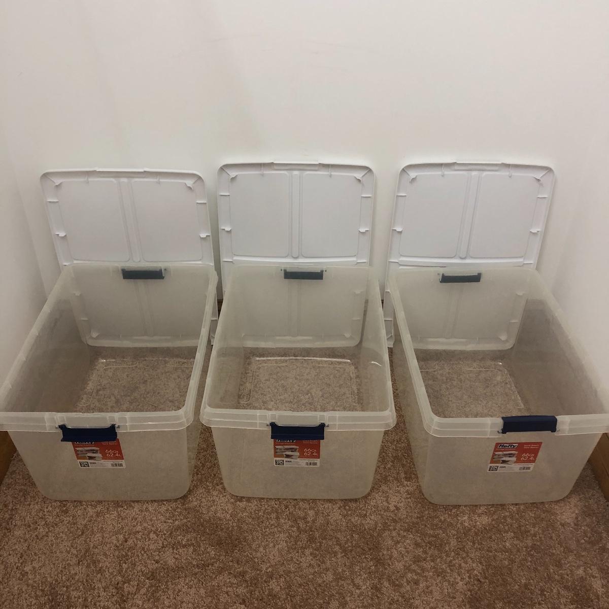 In this lot is a Sterlite 66 quart clear bottomed tote with a gray lid, a green Sterlite 20 gallon tote, a purple translucent bottomed Sterlite 66 quart tote, two 18 gallon Homz totes with a red body and green lid with one tote having darker colors than the other, a Rubbermaid roughneck 18 gallon dark blue tote, an orange translucent Bella 39 quart tote, a blue translucent Sterlite 66 quart tote, an 18 gallon sage green Rubbermaid tote, a cardboard ornament storage box, and lastly three clear 66 quart Hefty storage totes with white lids and blue latching handles. The three clear Hefty storage bins are 23.9” x 16.8” x 13”