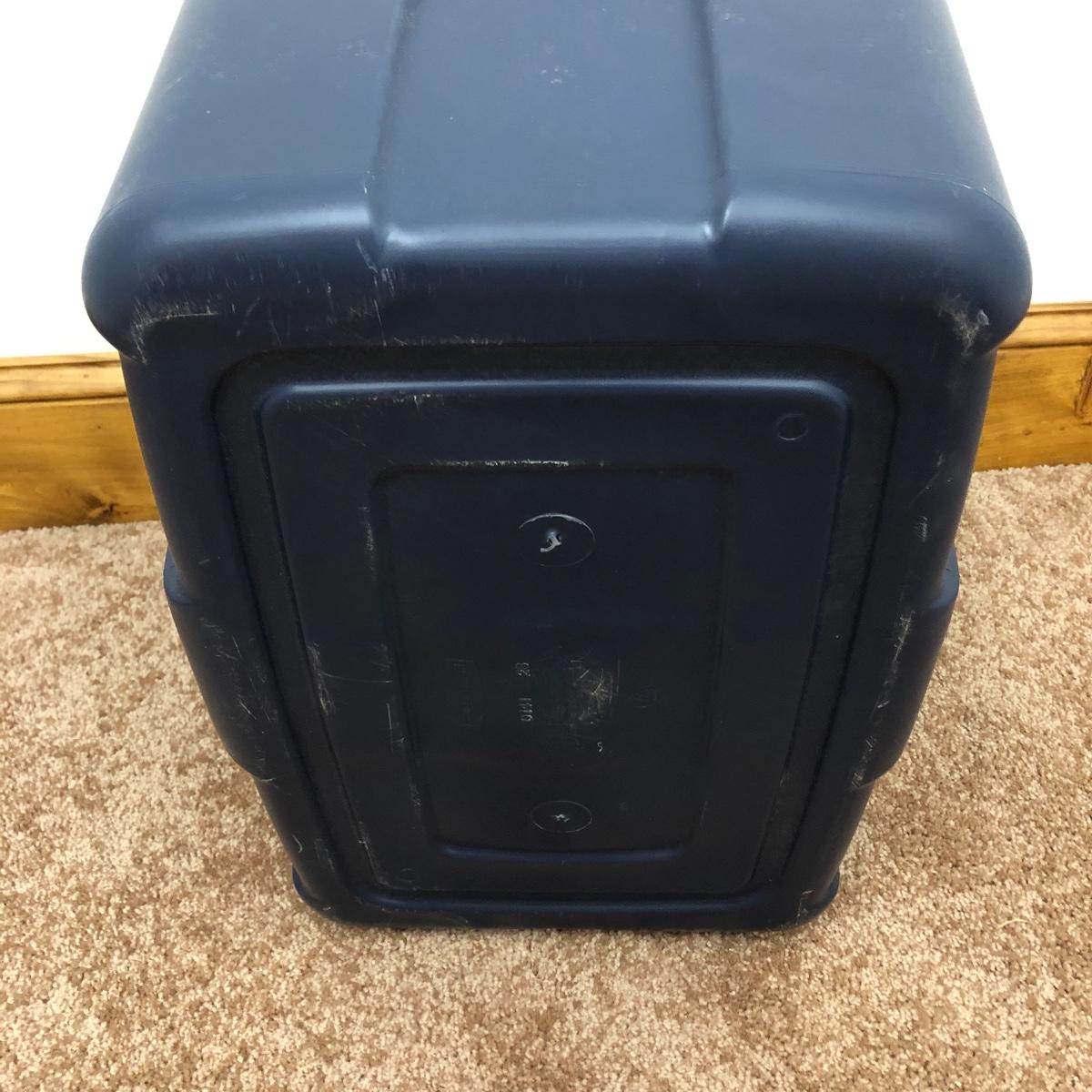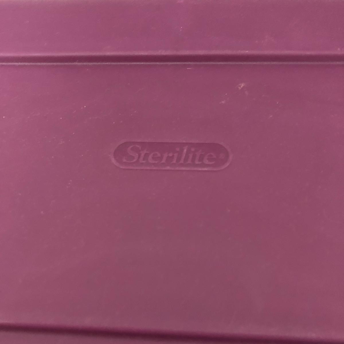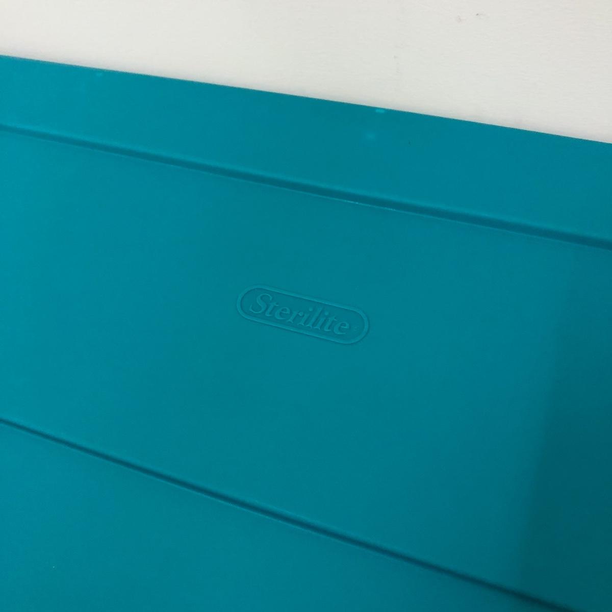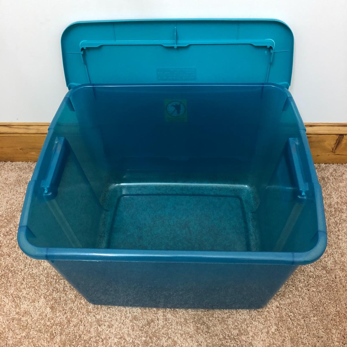 In this lot is a Sterlite 66 quart clear bottomed tote with a gray lid, a green Sterlite 20 gallon tote, a purple translucent bottomed Sterlite 66 quart tote, two 18 gallon Homz totes with a red body and green lid with one tote having darker colors than the other, a Rubbermaid roughneck 18 gallon dark blue tote, an orange translucent Bella 39 quart tote, a blue translucent Sterlite 66 quart tote, an 18 gallon sage green Rubbermaid tote, a cardboard ornament storage box, and lastly three clear 66 quart Hefty storage totes with white lids and blue latching handles. The three clear Hefty storage bins are 23.9” x 16.8” x 13”