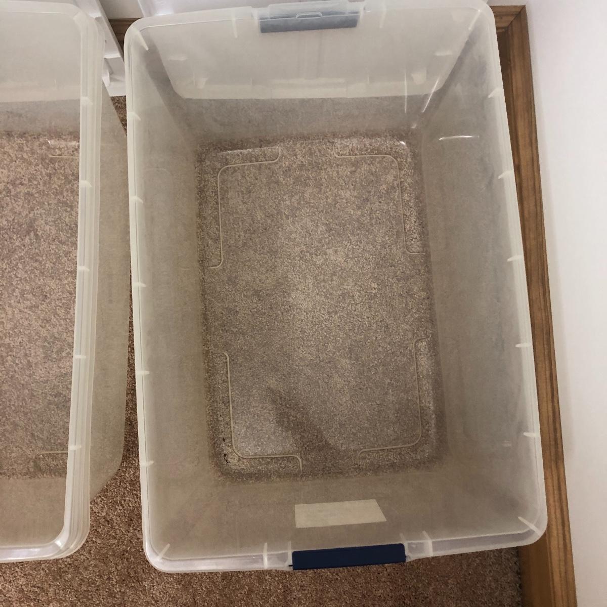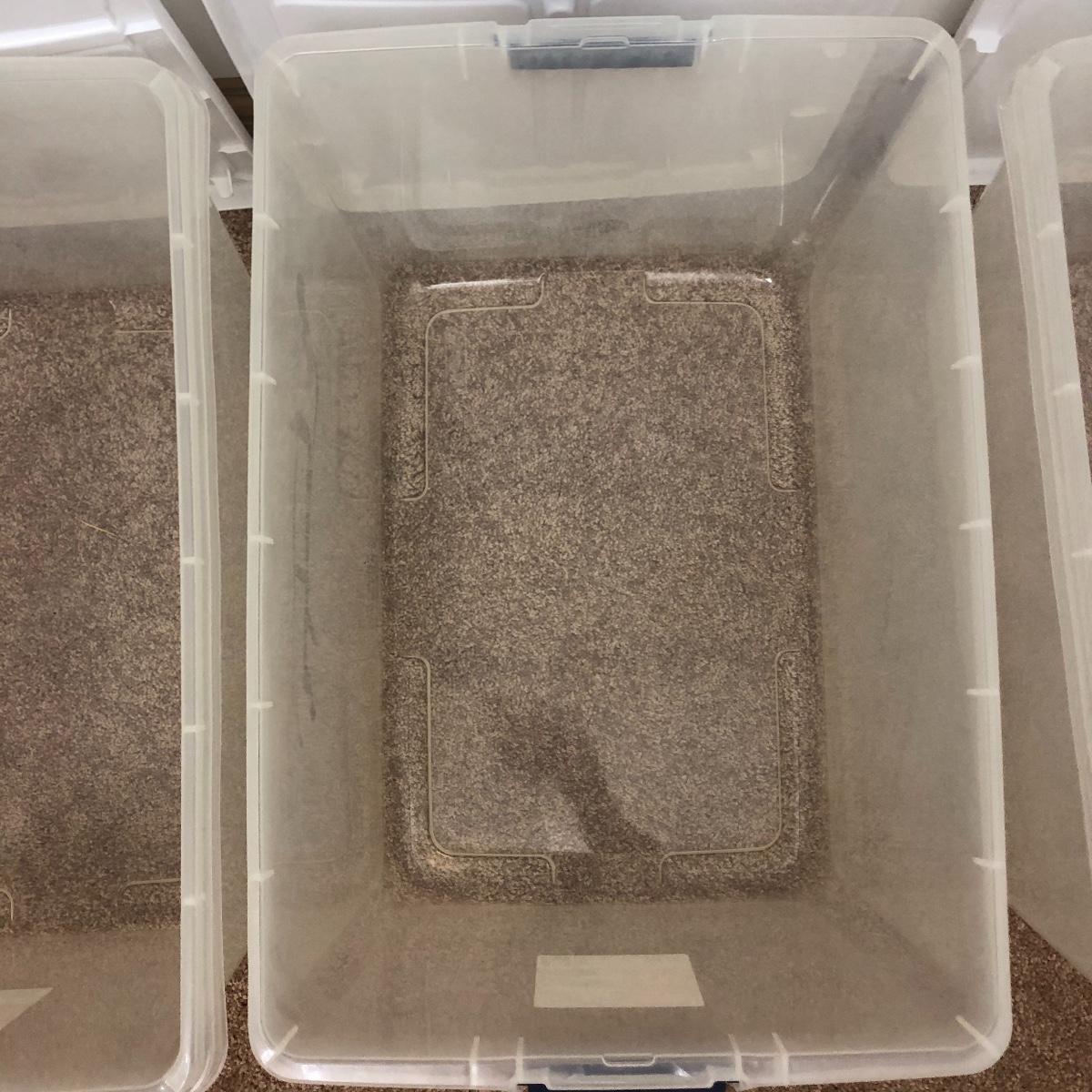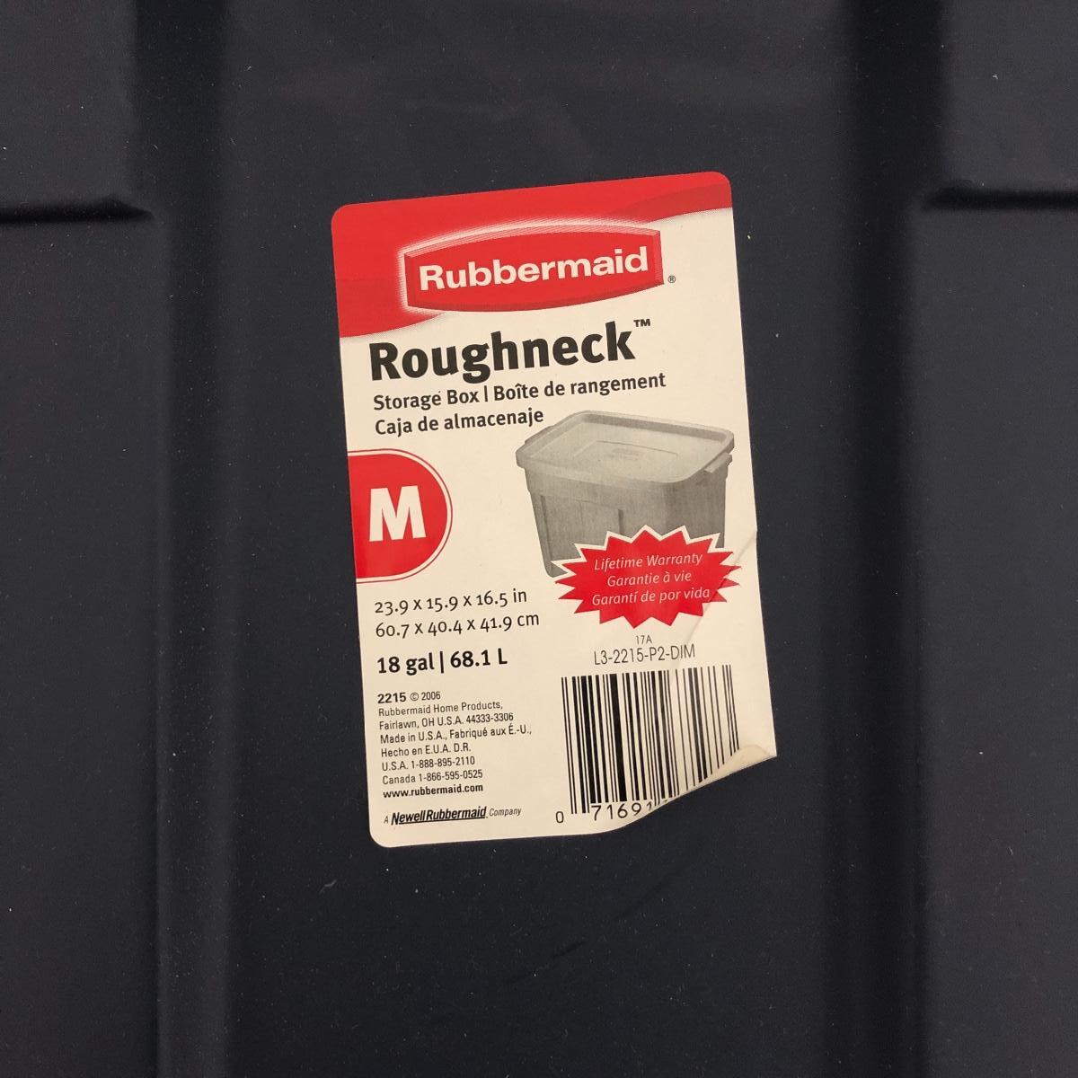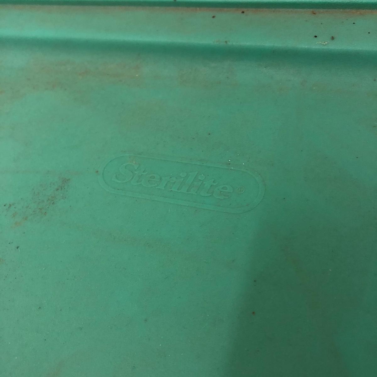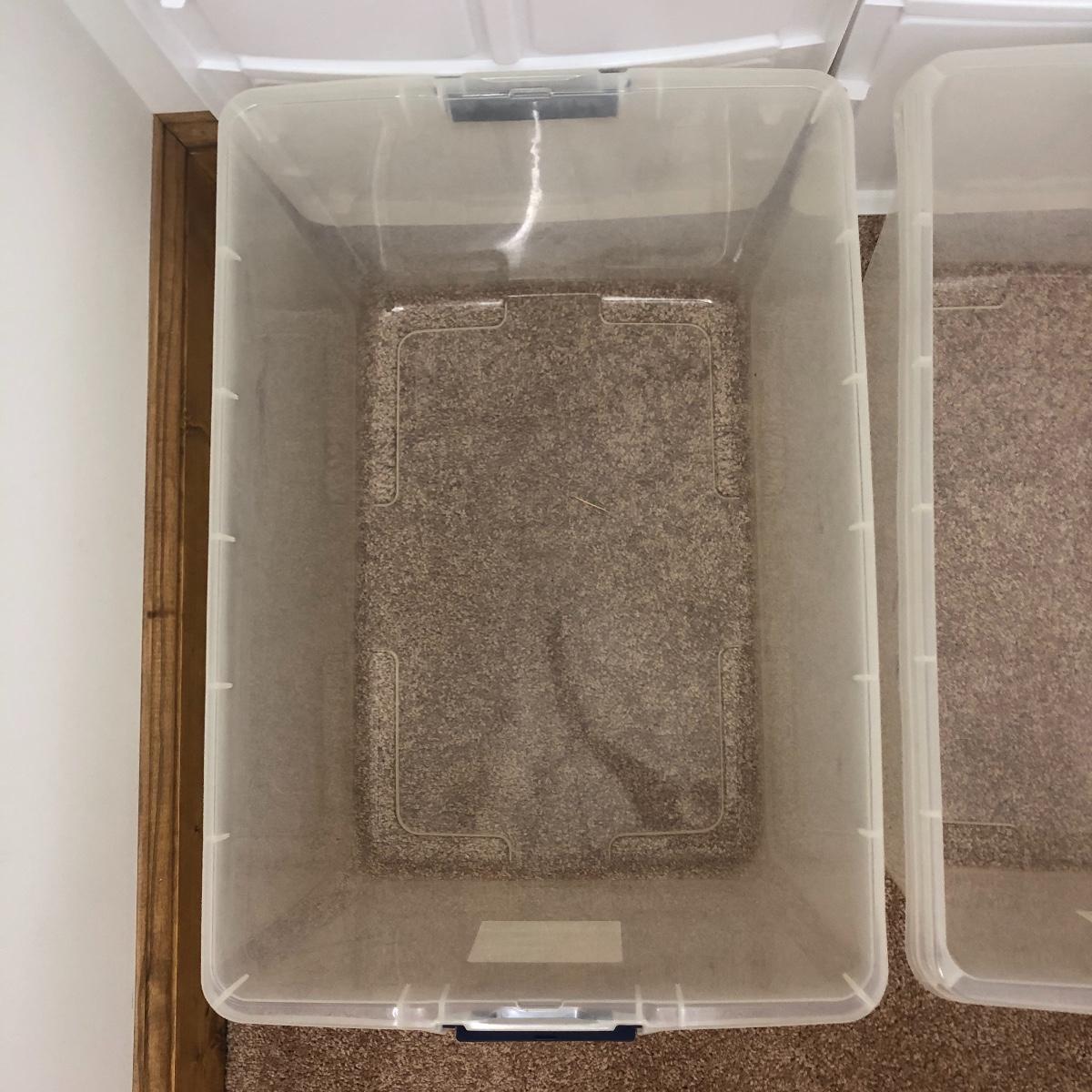 In this lot is a Sterlite 66 quart clear bottomed tote with a gray lid, a green Sterlite 20 gallon tote, a purple translucent bottomed Sterlite 66 quart tote, two 18 gallon Homz totes with a red body and green lid with one tote having darker colors than the other, a Rubbermaid roughneck 18 gallon dark blue tote, an orange translucent Bella 39 quart tote, a blue translucent Sterlite 66 quart tote, an 18 gallon sage green Rubbermaid tote, a cardboard ornament storage box, and lastly three clear 66 quart Hefty storage totes with white lids and blue latching handles. The three clear Hefty storage bins are 23.9” x 16.8” x 13”