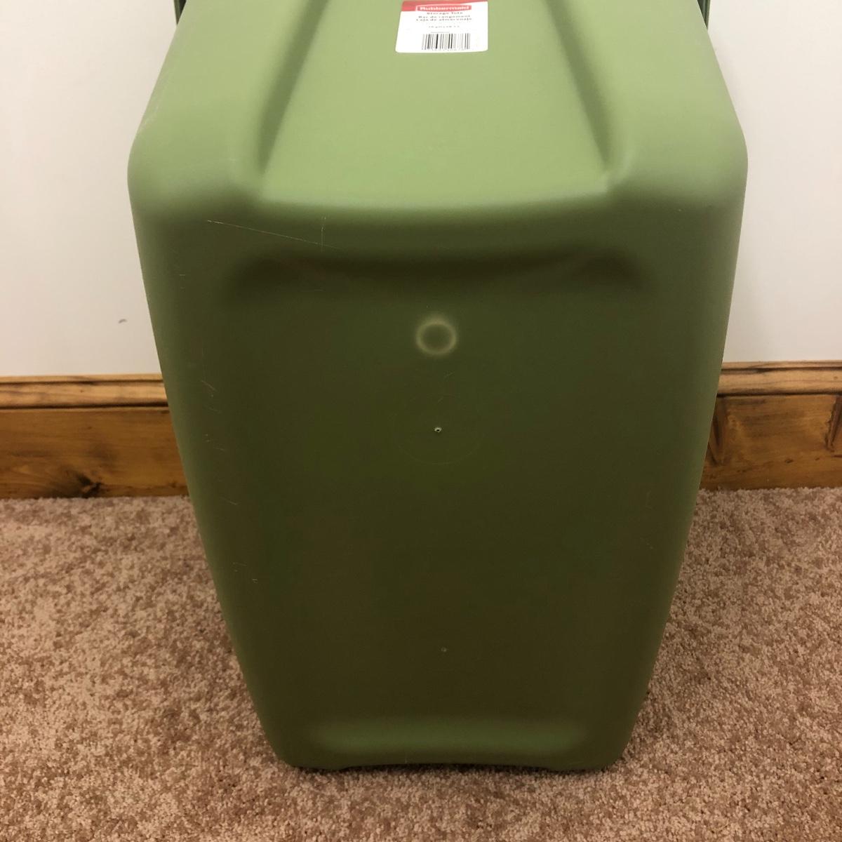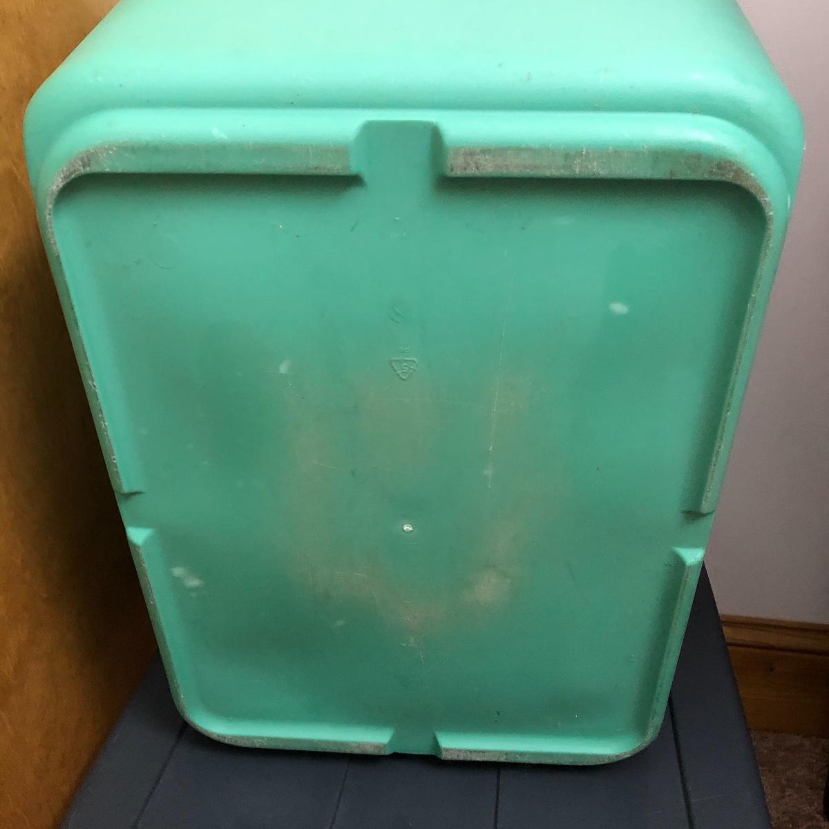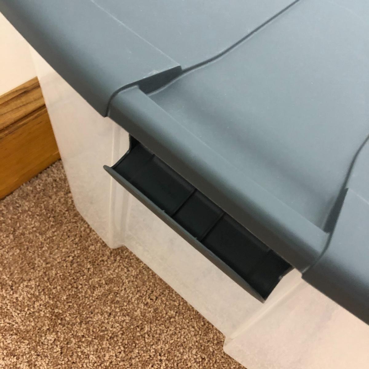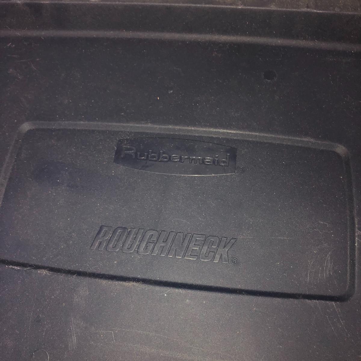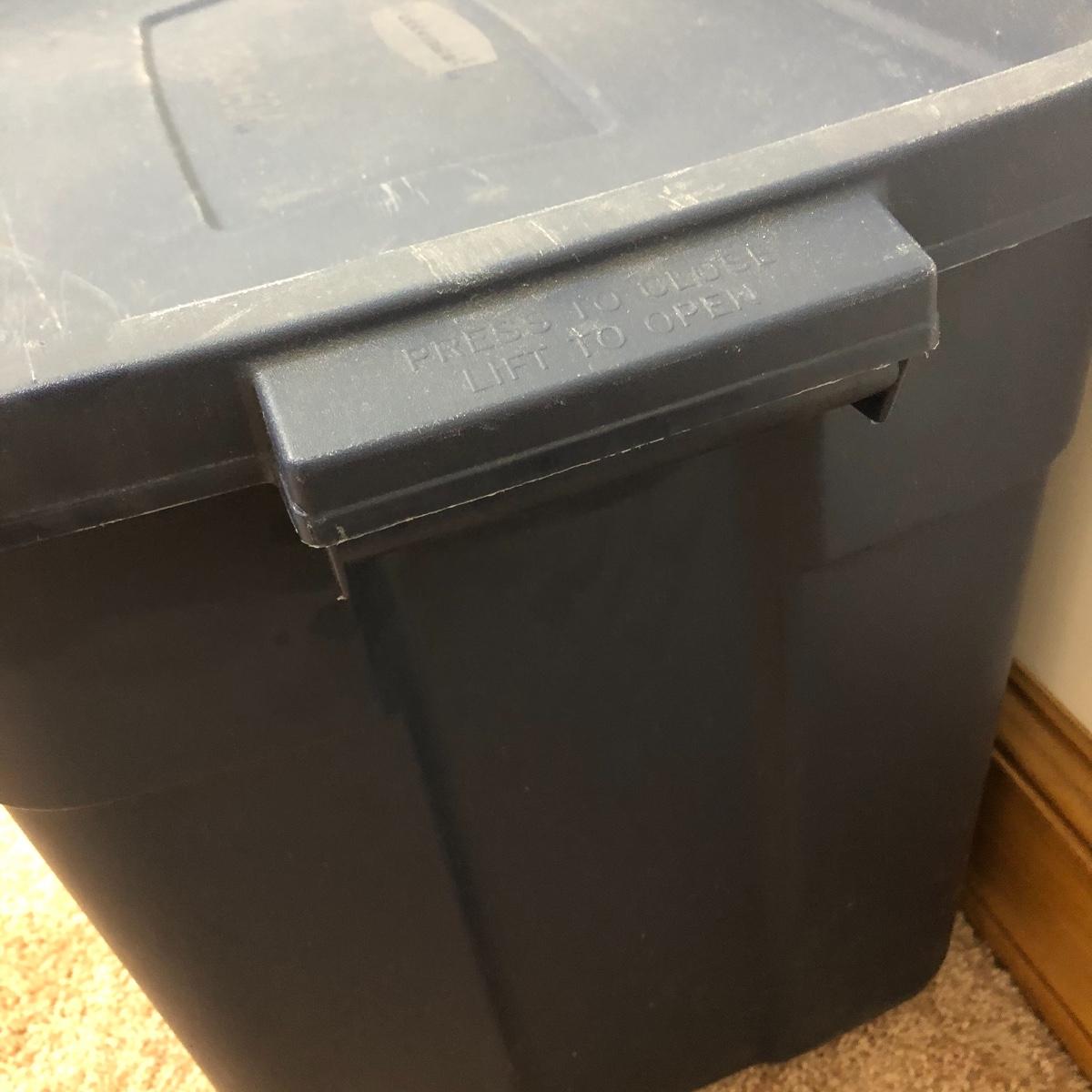 In this lot is a Sterlite 66 quart clear bottomed tote with a gray lid, a green Sterlite 20 gallon tote, a purple translucent bottomed Sterlite 66 quart tote, two 18 gallon Homz totes with a red body and green lid with one tote having darker colors than the other, a Rubbermaid roughneck 18 gallon dark blue tote, an orange translucent Bella 39 quart tote, a blue translucent Sterlite 66 quart tote, an 18 gallon sage green Rubbermaid tote, a cardboard ornament storage box, and lastly three clear 66 quart Hefty storage totes with white lids and blue latching handles. The three clear Hefty storage bins are 23.9” x 16.8” x 13”