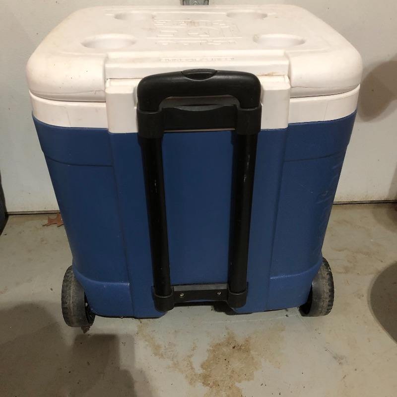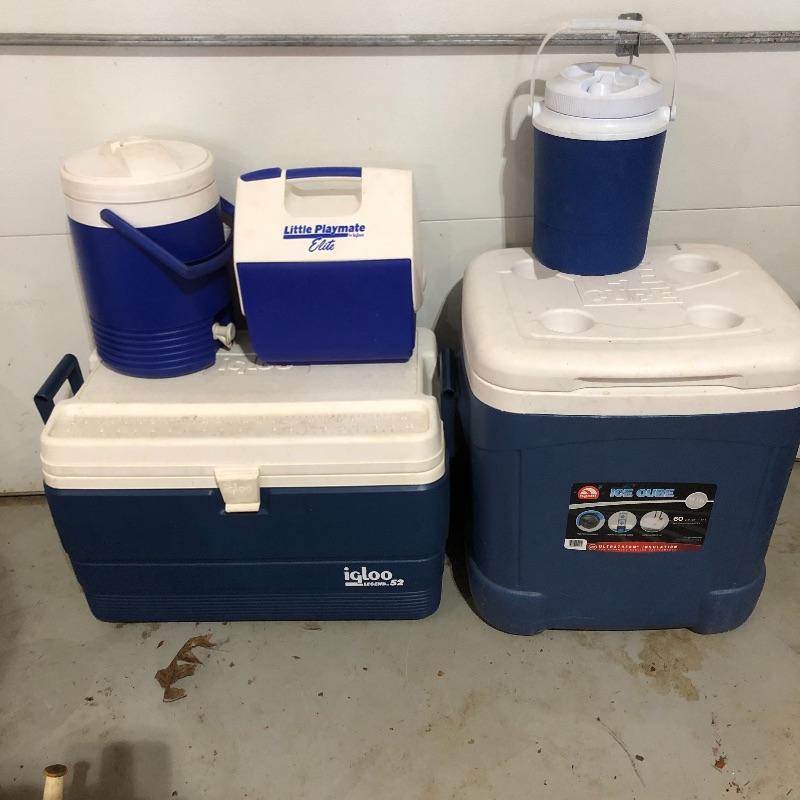 Keep your cool with this cooler collection. Lot includes Igloo sixty quart rolling cooler with telescoping handle, Igloo fifty two quart cooler, Igloo Little Playmate, Igloo two gallon water jug and a Rubbermaid one gallon water jug.