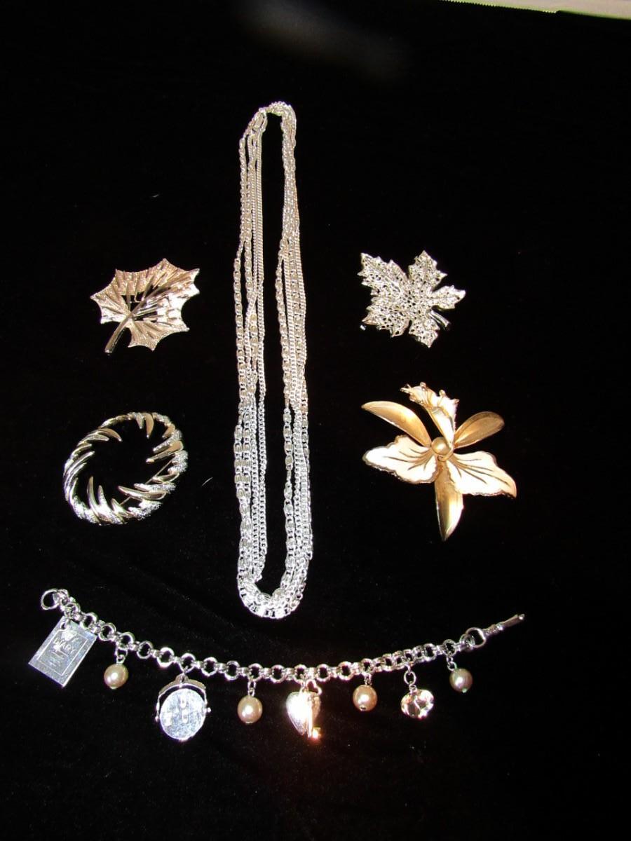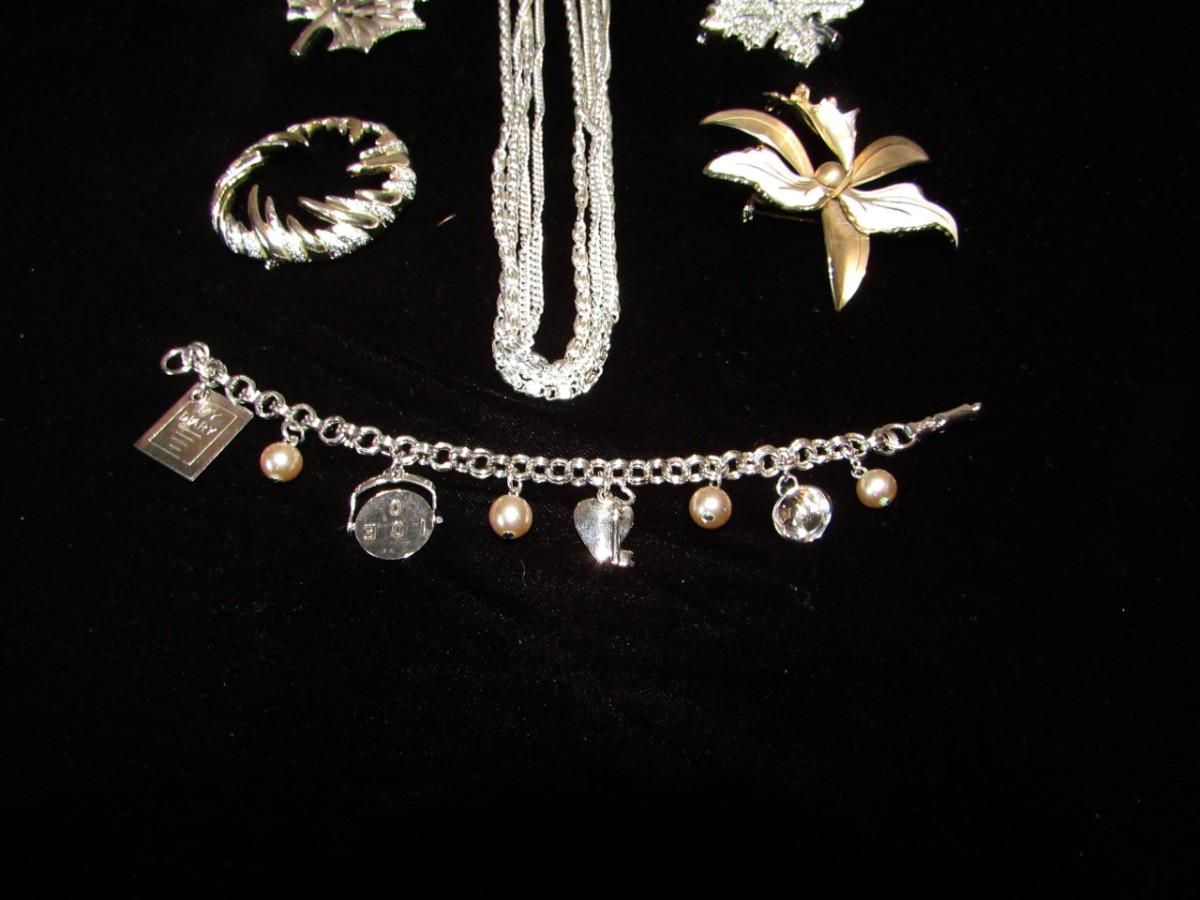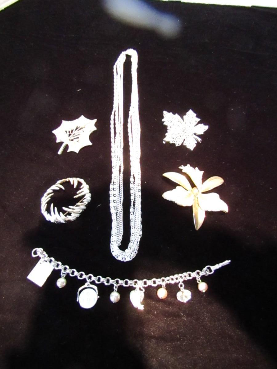 MULTI STRAND NECKLACE, 4 BROOCHES AND A CHARM BRACELET