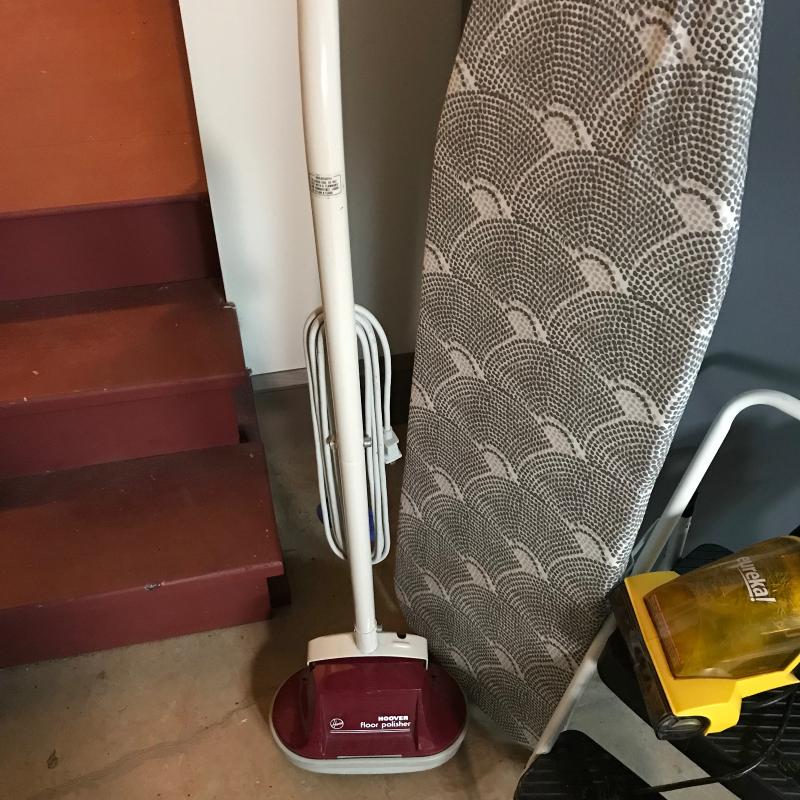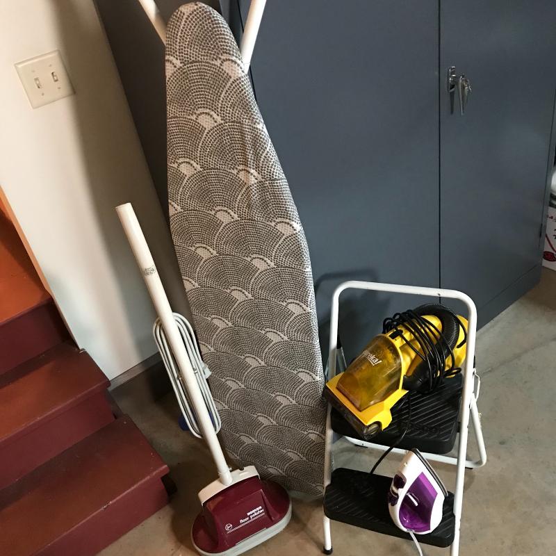 Hoover Floor Polisher, Eureka hand held vacuum, Panasonic steam iron with ironing board and Cosco step ladder. Lot is available for local pick up in Asheville, NC only.