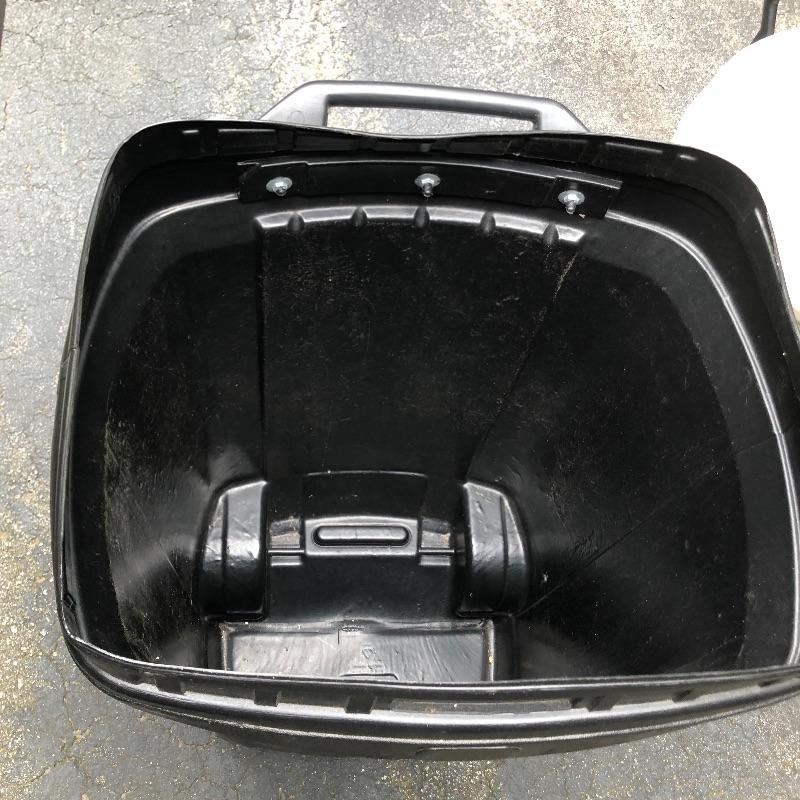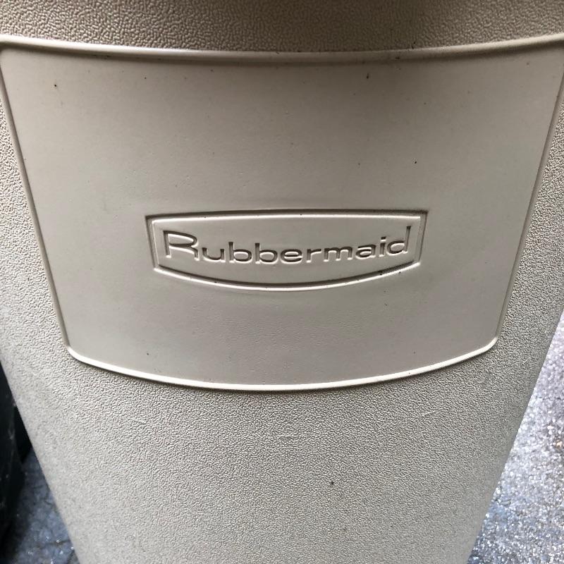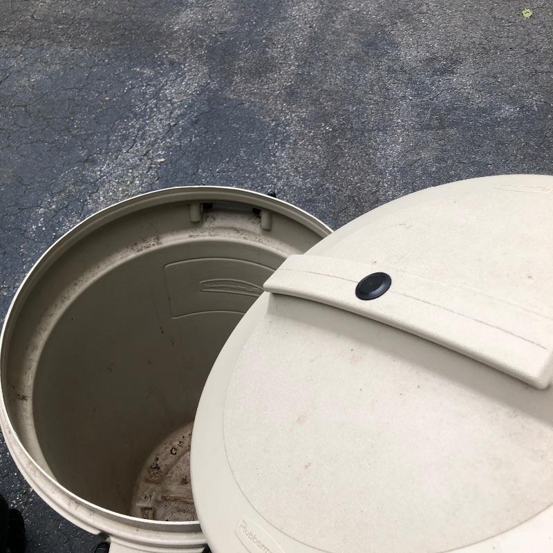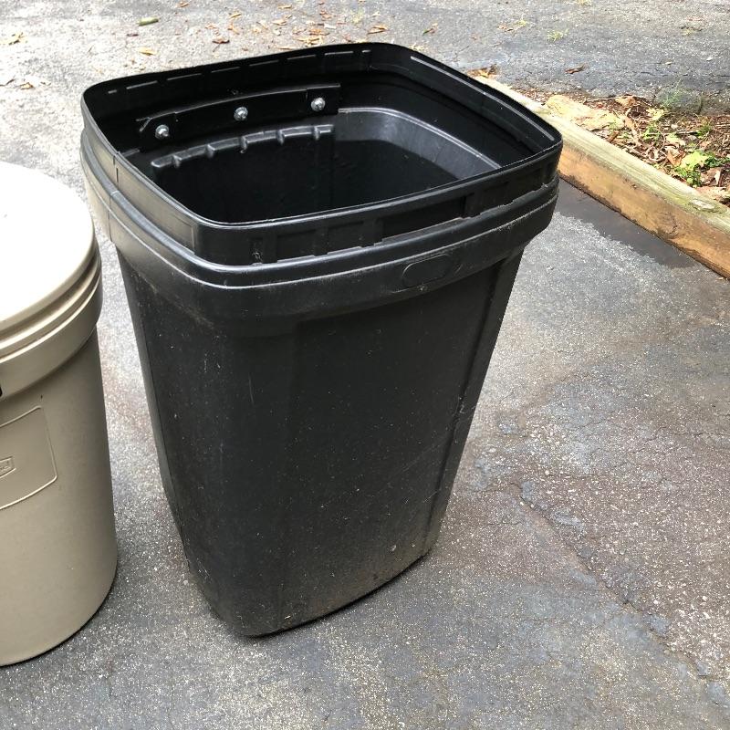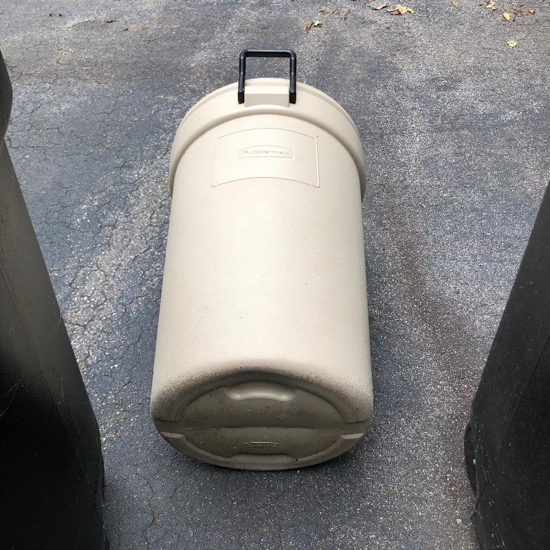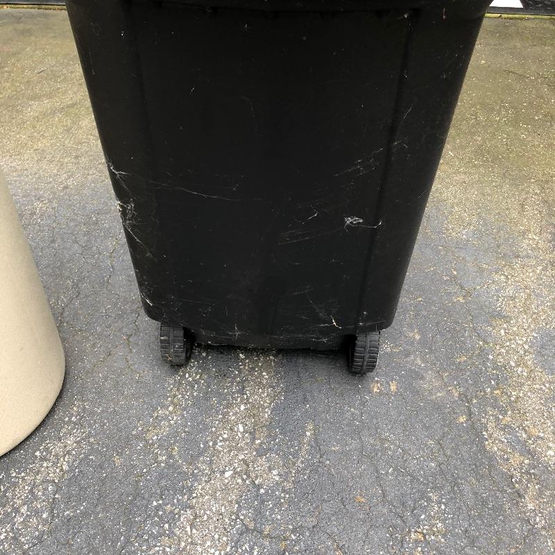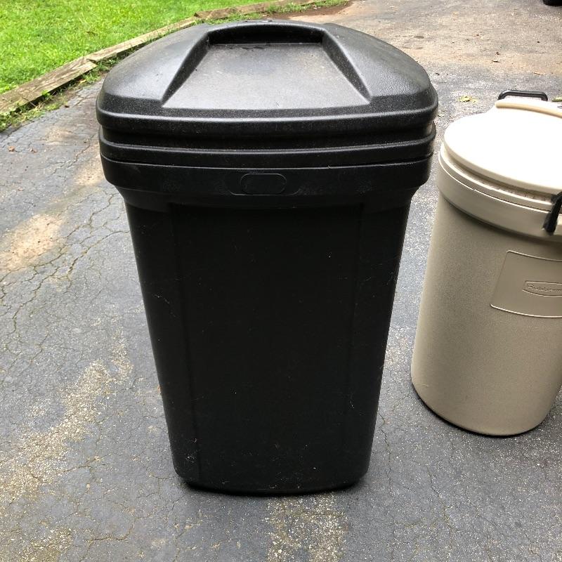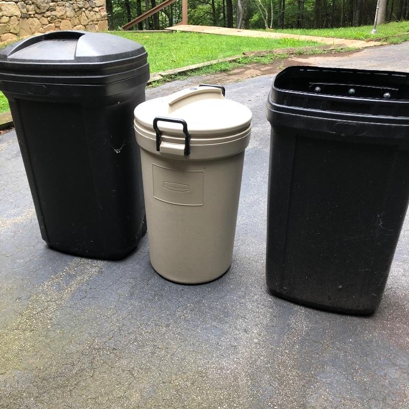 Three garbage cans in this lot that includes two large black cans on wheels and a smaller Rubbermaid that is not on wheels. Note that one of the two black cans is missing it’s lid.