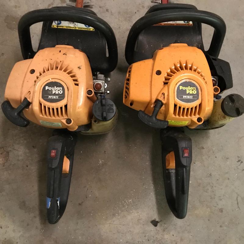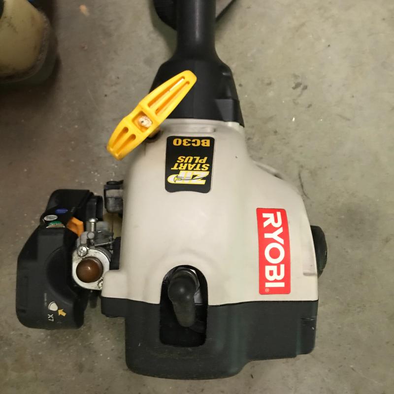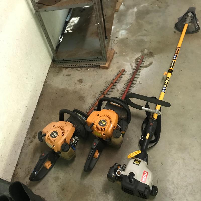 Lot includes a Ryobi BC30 brushcutter and two Poulan Pro PP2822 hedge trimmers. All three tools are currently unable to be started. Local pick up only.