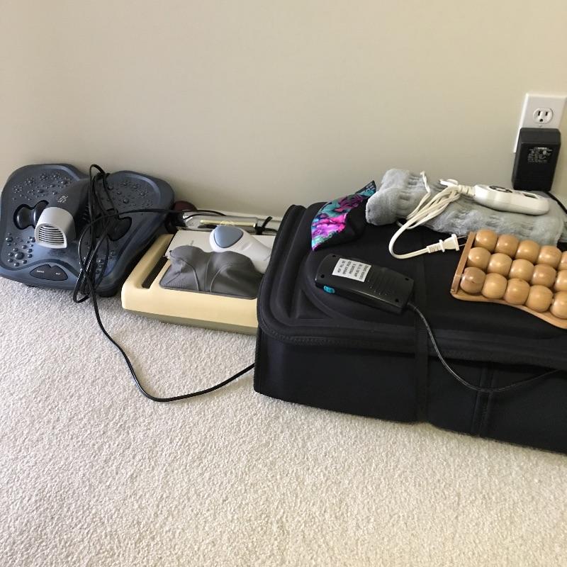 We all get aches and pains, so why not treat yourself to this large collection of massage related tools including a Homedics body revitalizer, foot massager, heating pad, kneading fingers, Celly massage and more. Body revitalizer measures 23” x 68”.