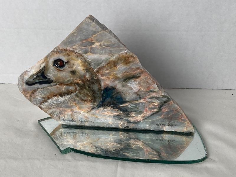 Nan Lee signed painting on stone “Canada Gosling” with mirror base. Measures 7” tall 10-1/2” wide and 7-1/2” deep including base