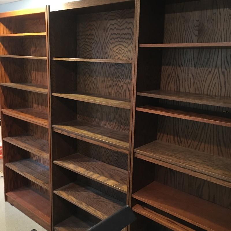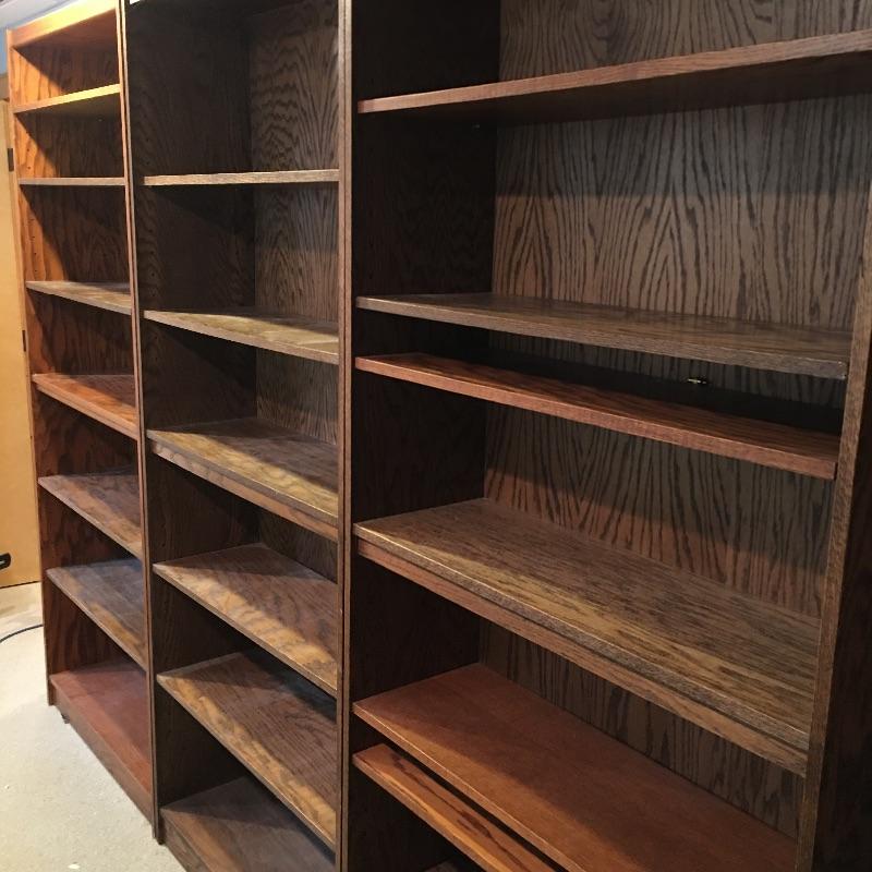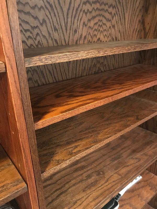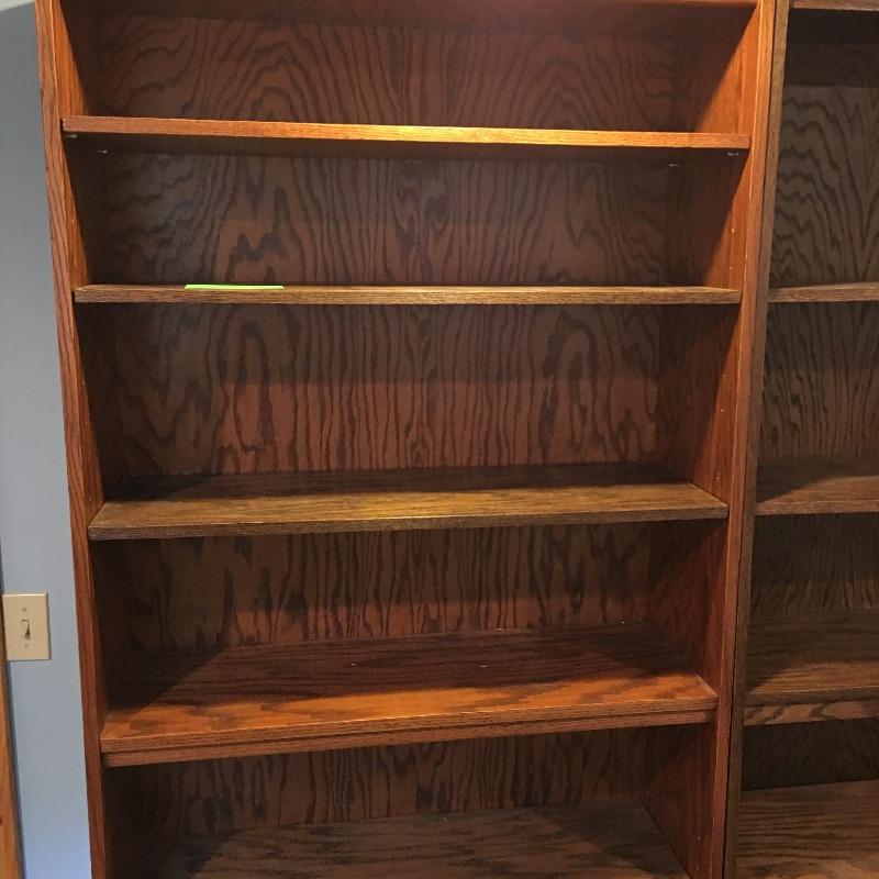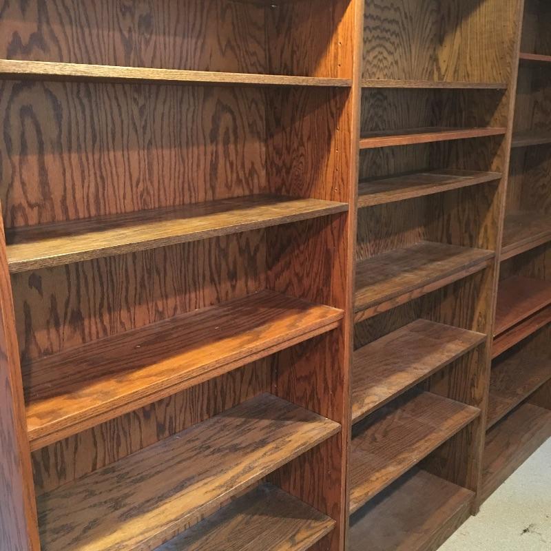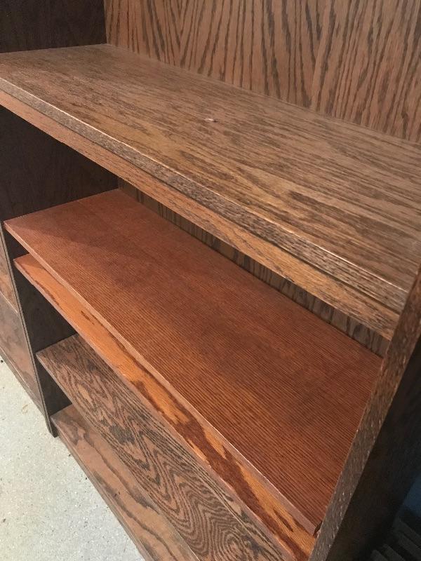 Three adjustable wooden bookshelves. These bookshelves are great for books or just to use as storage. Each bookshelf measures 12” x 36” x 84”. Bring help as item is substantial and in the basement and will need to go up one flight of stairs. One of the shelves is a bit more of an orange color than other two which are darker brown. The shelves themselves are adjustable and have been mixed within these units. They can easily be put in the shelf with the matching color to make it complete within the unit. This is why the photos appear a little Mis matched. Local Pickup Only